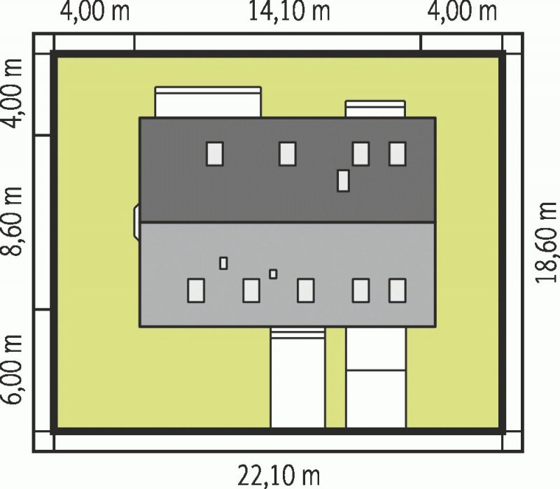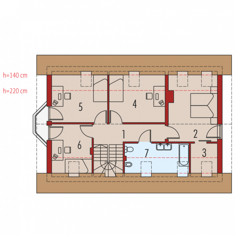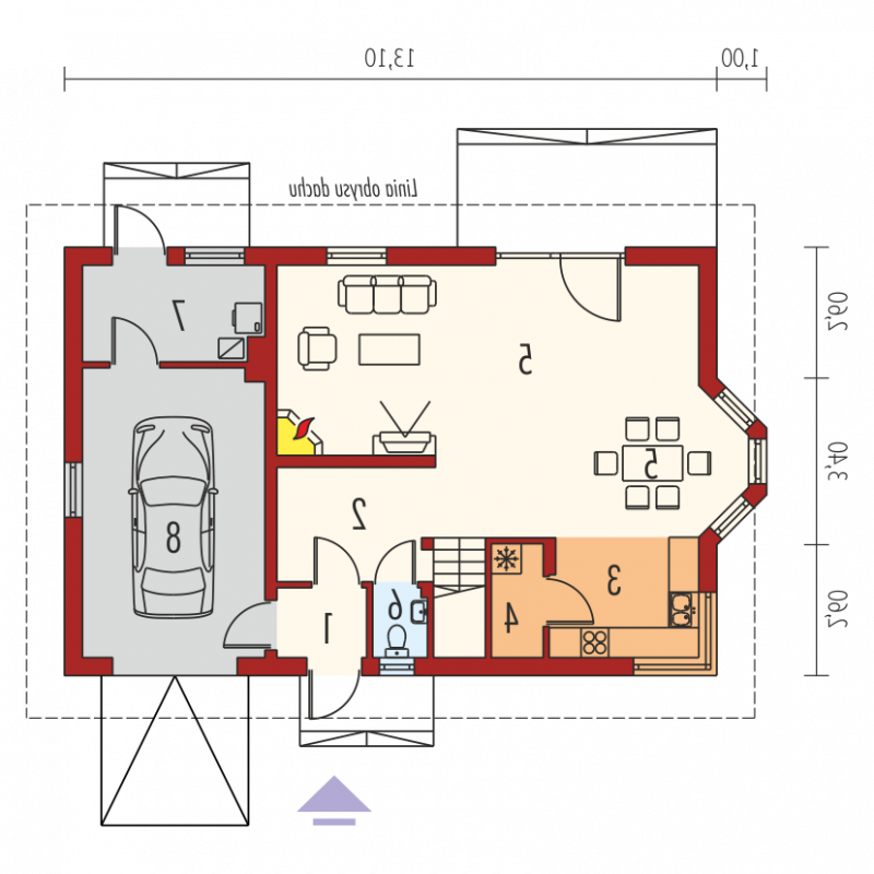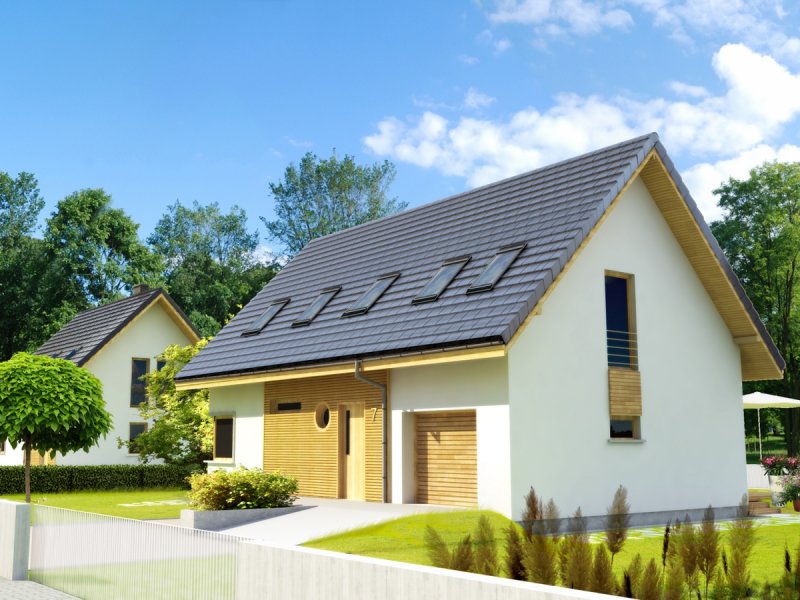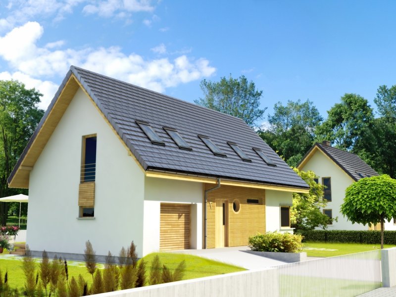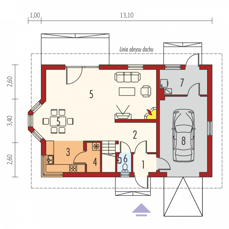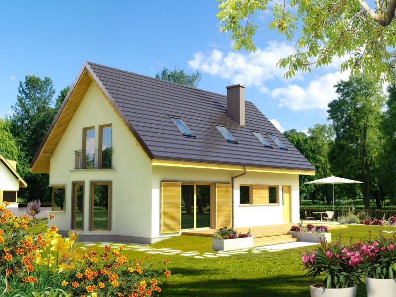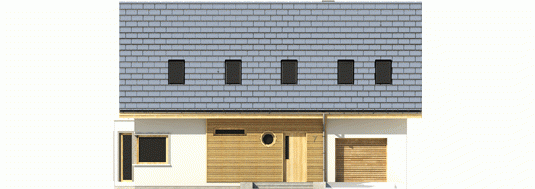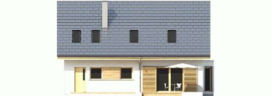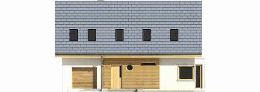 Dom parterowy z poddaszem użytkowym, niepodpiwniczony, z garażem przeznaczony dla 2-3-osobowej rodziny. Część dzienną stanowi przestronny pokój dzienny połączony z kuchnią, spiżarnia, toaleta oraz pomieszczenie gospodarcze. W części nocnej, zaprojektowanej na poddaszu, znajduje się sypialnia z garderobą, trzy pokoje oraz łazienka. Istnieje wersja domu bez garażu.