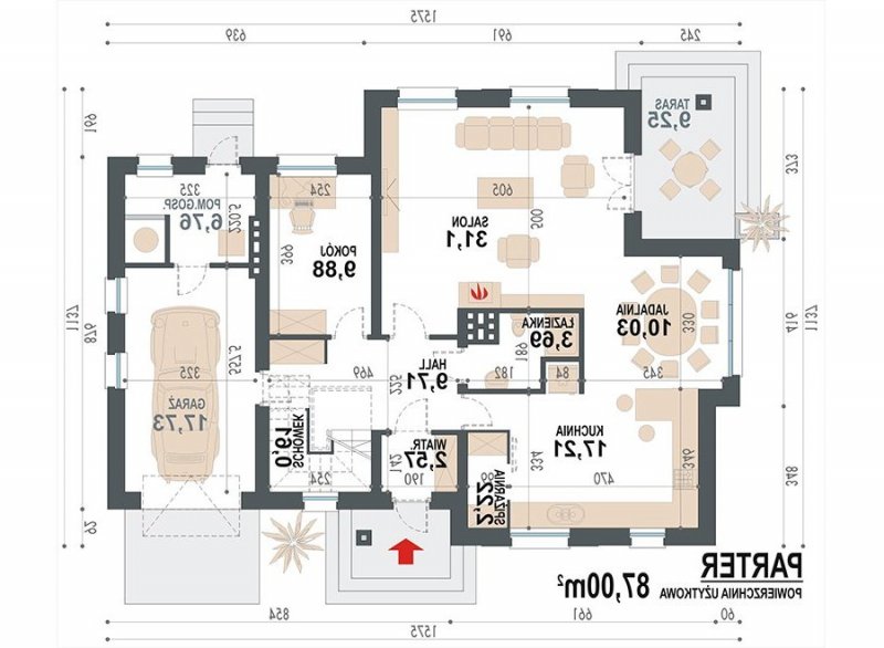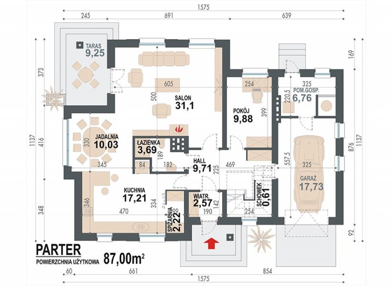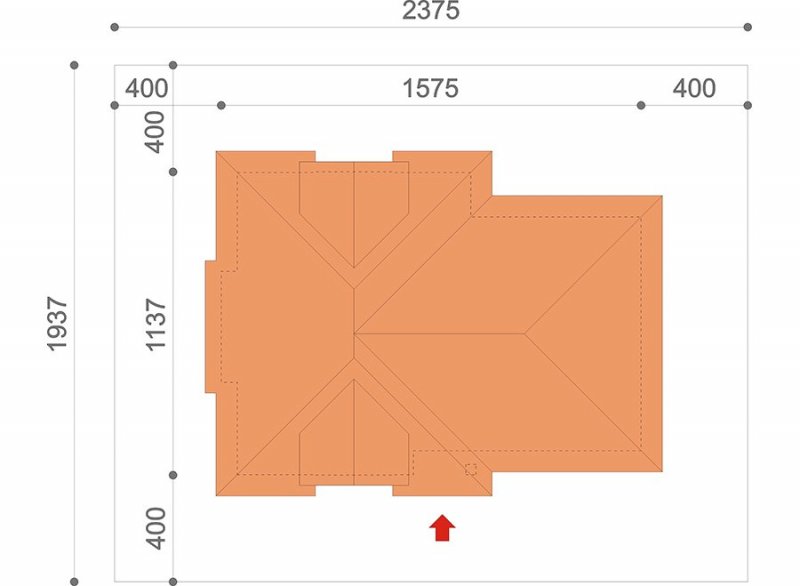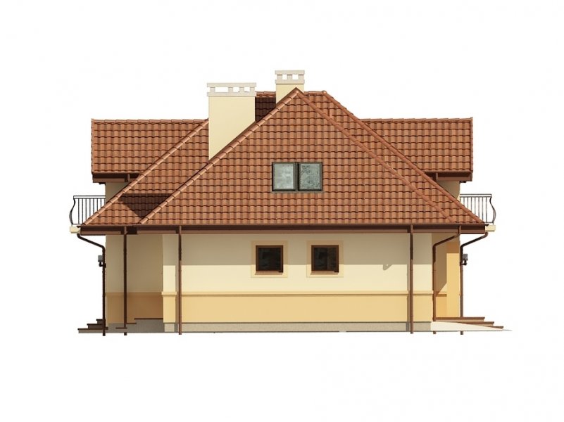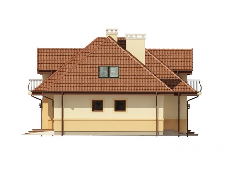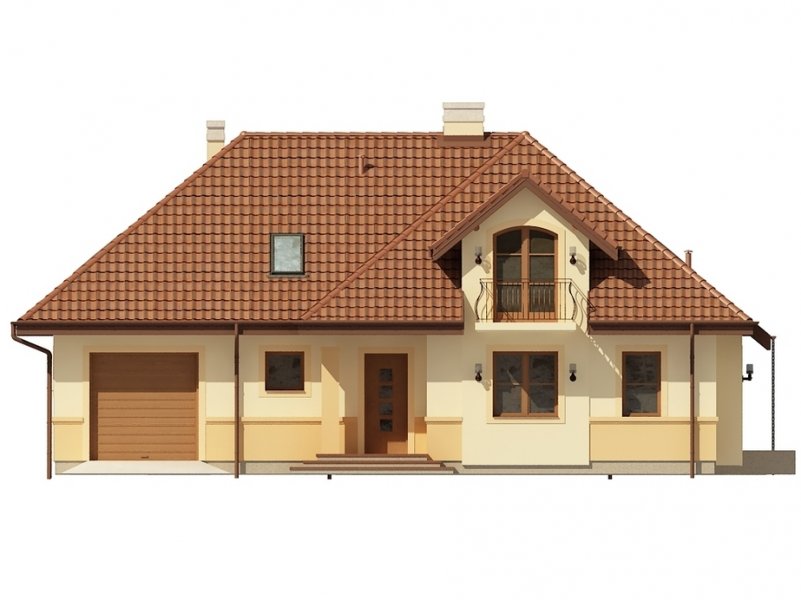 Jednorodzinny dom parterowy z poddaszem użytkowym i garażem jednostanowiskowym (istnieje wersja dwustanowiskowa), niepodpiwniczony, przeznaczony dla 5 osób, na parterze zaprojektowano przestronny salon z kominkiem, kuchnię ze spiżarnią, aneks jadalny, pomieszczenie na gabinet lub sypialnię, łazienkę, wiatrołap, hall, kotłownię oraz garaż; na poddaszu zaprojektowano trzy sypialnie (w tym sypialnia rodziców z indywidualną łazienką oraz garderobą) oraz garderobę i łazienkę ogólnodostępną; cechą charakterystyczną tego domu jest przestronność pomieszczeń oraz zredukowana komunikacja.