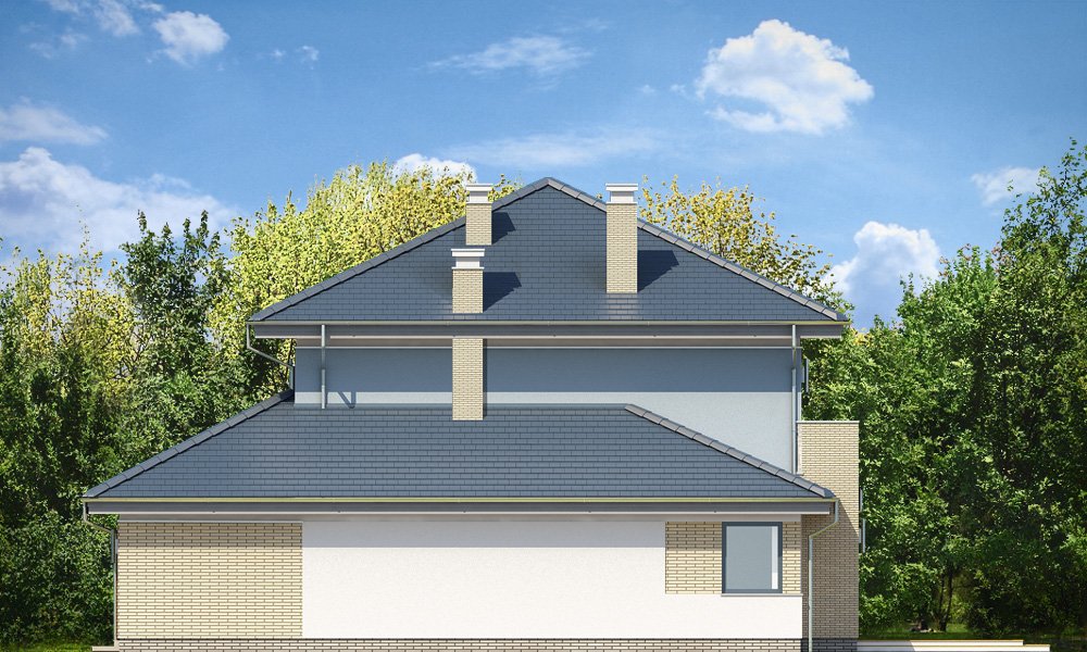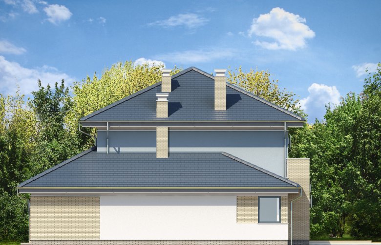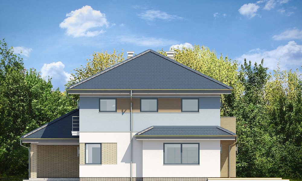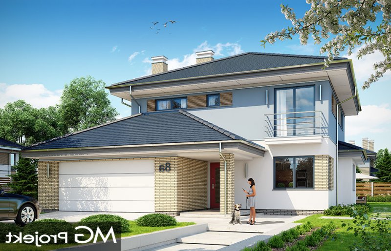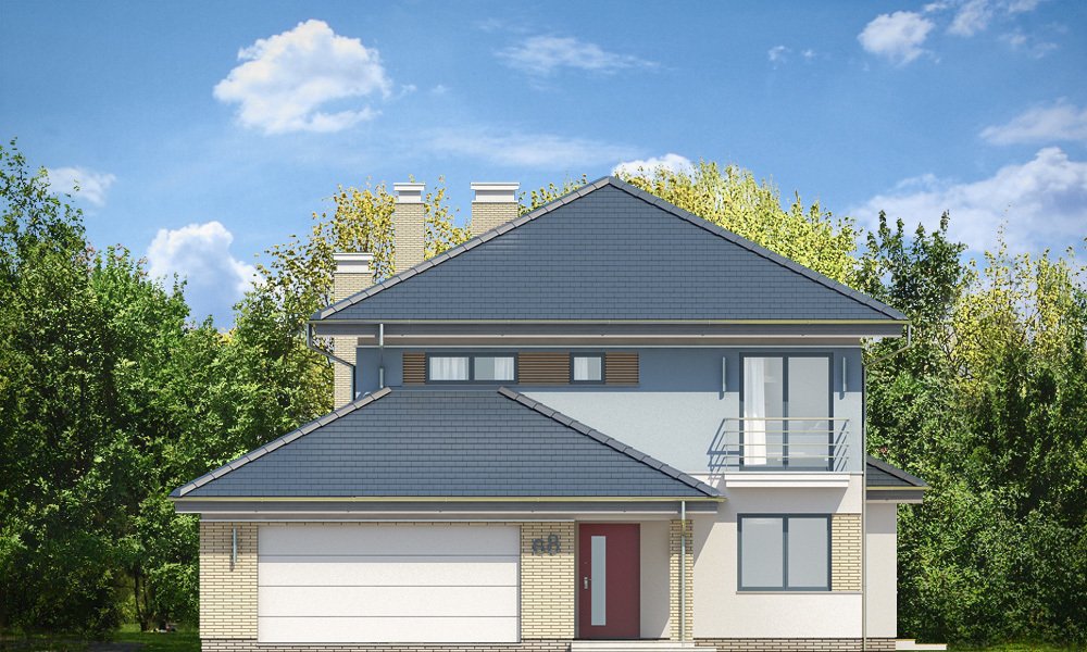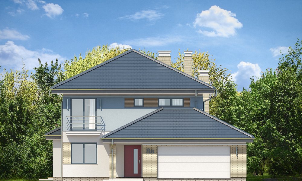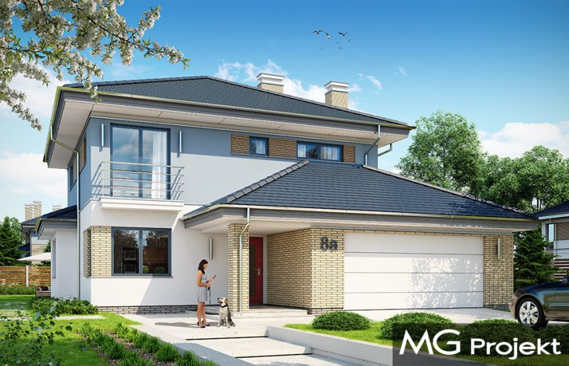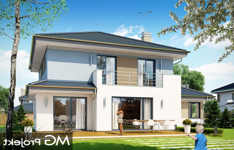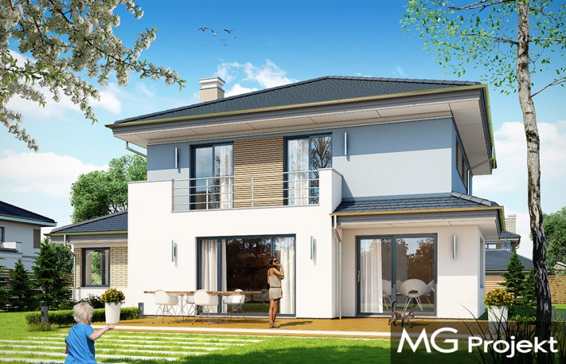 Szmaragd 5 jest kolejną wersją wariantową domu z serii Szmaragd. Projekt domu jednorodzinnego piętrowego, z garażem częściowo wbudowanym w bryłę. Przeznaczony dla 4-5cioosobowej rodziny. Dom ma nowoczesną, ale nie agresywną architekturę. Bryła budynku jest zwarta, przykryta kopertowym dachem. Dzięki temu dom będzie łatwy i niedrogi zarówno w budowie, jak i późniejszym utrzymaniu. Parter domu to otwarta część dzienna, z salonem, holem, jadalnią i otwartą kuchnią. Razem pomieszczenia tworzą dużą wspólną przestrzeń. Dodatkowo na parterze przewidziano pokój - gabinet lub sypialnię gościnną, łazienkę, oraz duży garaż i kotłownię. Przy kuchni zmieściła się niewielka spiżarka. Na piętrze mamy trzy ładne sypialnie (sypialnia rodziców z garderobą), oraz bardzo ładną łazienkę. Jest też dodatkowe pomieszczenie, które może służyć jako pokój, albo domowe biuro, lub pralnię – garderobę. Nad piętrem mamy jeszcze sporej wielkości strych - magazyn domowych rupieci. Szmaragd 5 to komfortowy, wygodny dom. Ma w sobie wszystko czego można potrzebować od prawdziwego domu. Nowoczesny wygląd domu, kolorystyka i materiały tworzą spójną całość z przestronnym wnętrzem. Dom jest energooszczędny. Dobre ocieplenia i nowoczesne instalacje pozwalają go w łatwy sposób przystosować do standardu NF40. Zapraszamy.