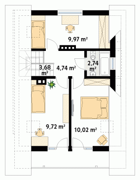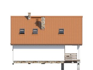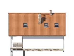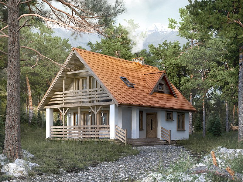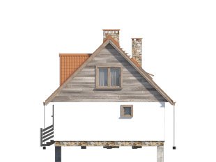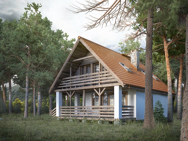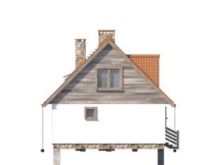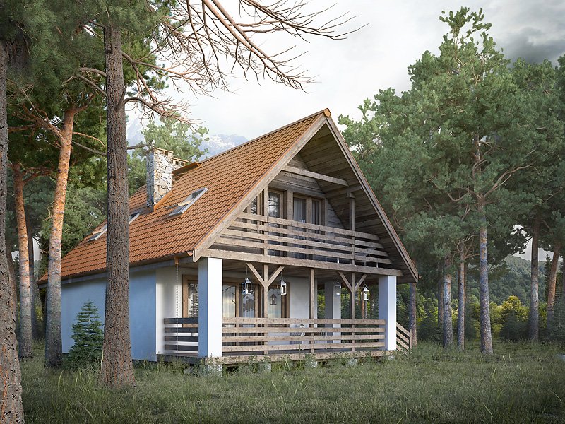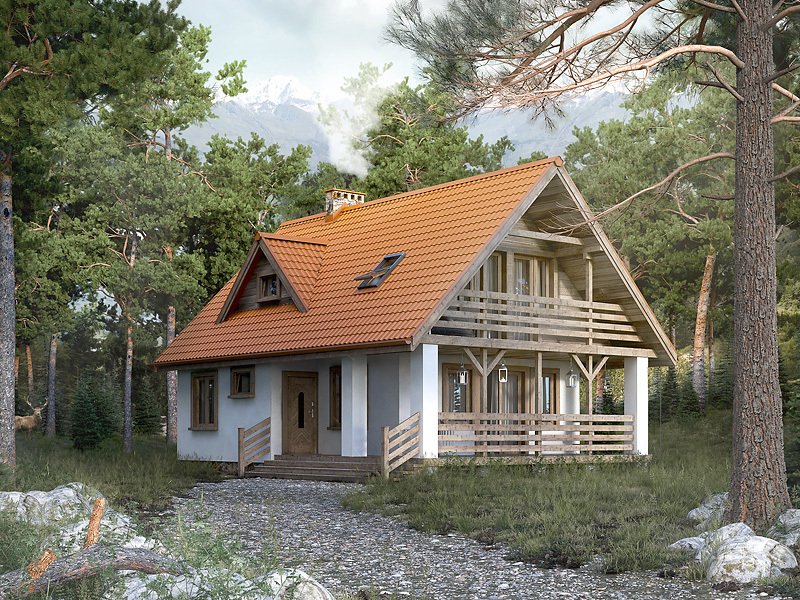 Nieduży jednorodzinny dom mieszkalny z użytkowym poddaszem, który z powodzeniem może pełnić zarówno funkcję domu całorocznego jak i rekreacyjnego. Parter zaprojektowano jako część dzienną, w której znajduje się przestronny salon z kominkiem, zamknięta kuchnia oraz spora łazienka. Na poddaszu znajdują się trzy sypialnie, z których dwie posiadają wyjście na zadaszony balkon oraz ogólnodostępna łazienka. Atutem projektu jest spory zadaszony taras od frontu budynku, który umożliwia odpoczynek na powietrzu niezależnie od panującej na zewnątrz aury. Taras oraz balkony zostały wykończone surowym drewnem, które nadaje domowi rustykalny charakter.