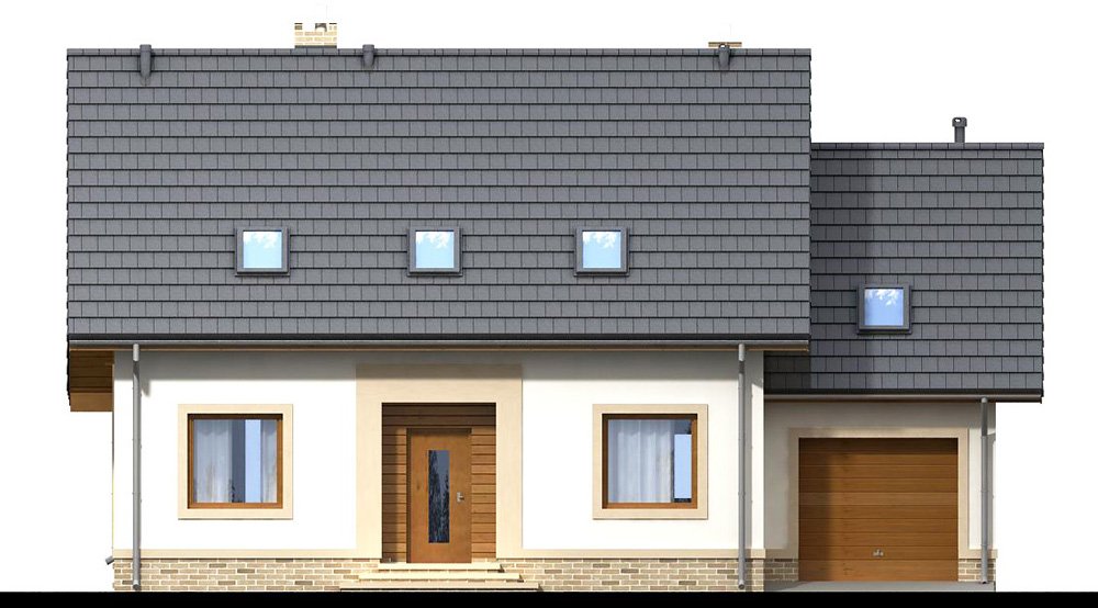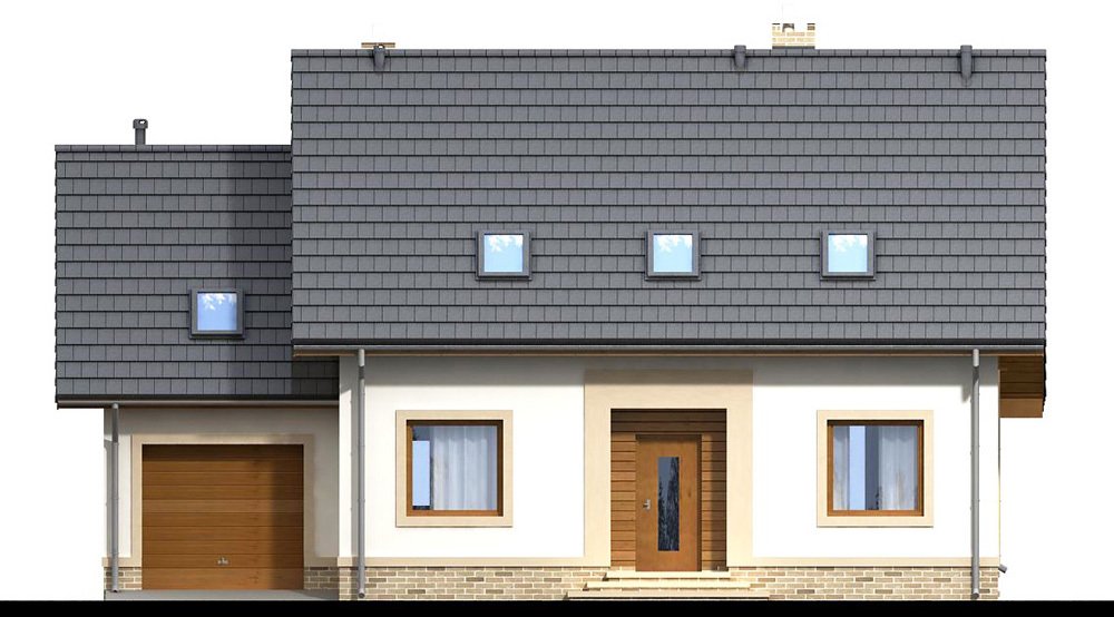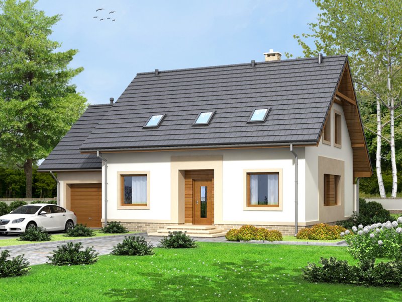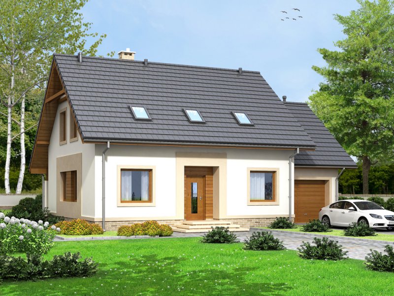 Dom posiada garaż, który został dodatkowo wydłużony tak, aby znalazło się miejsce na stół roboczy i