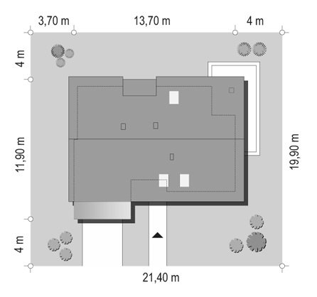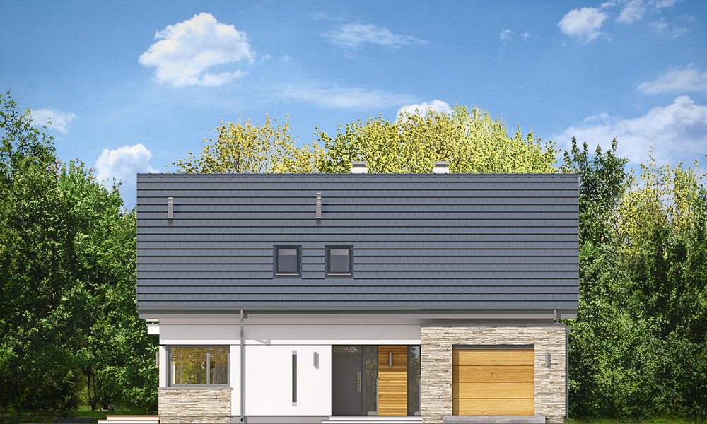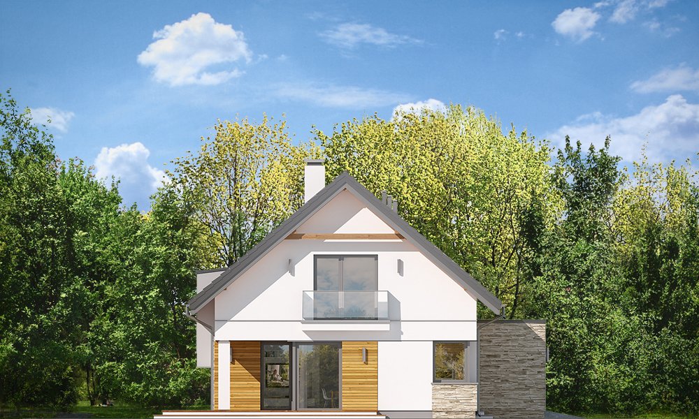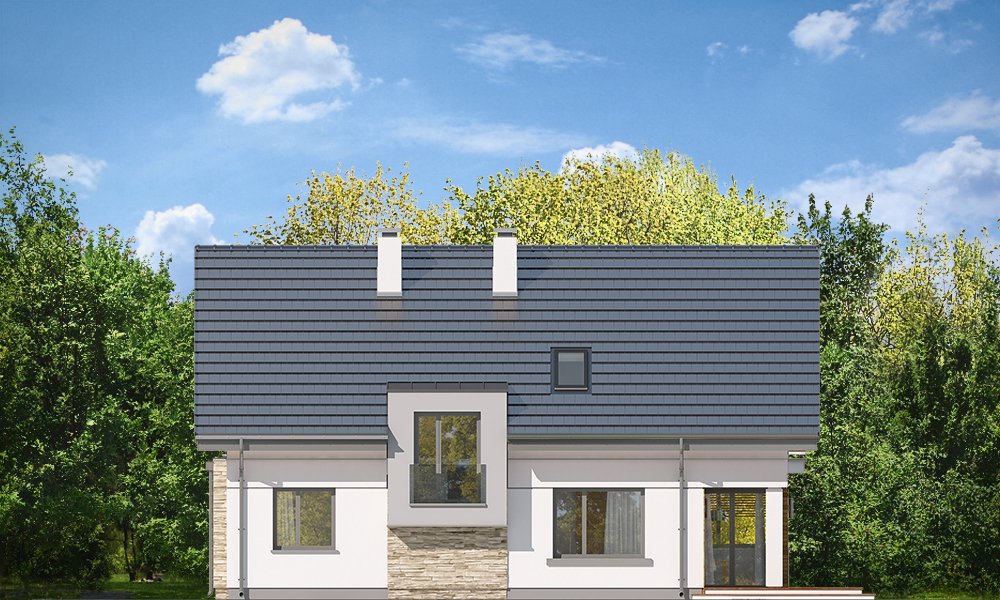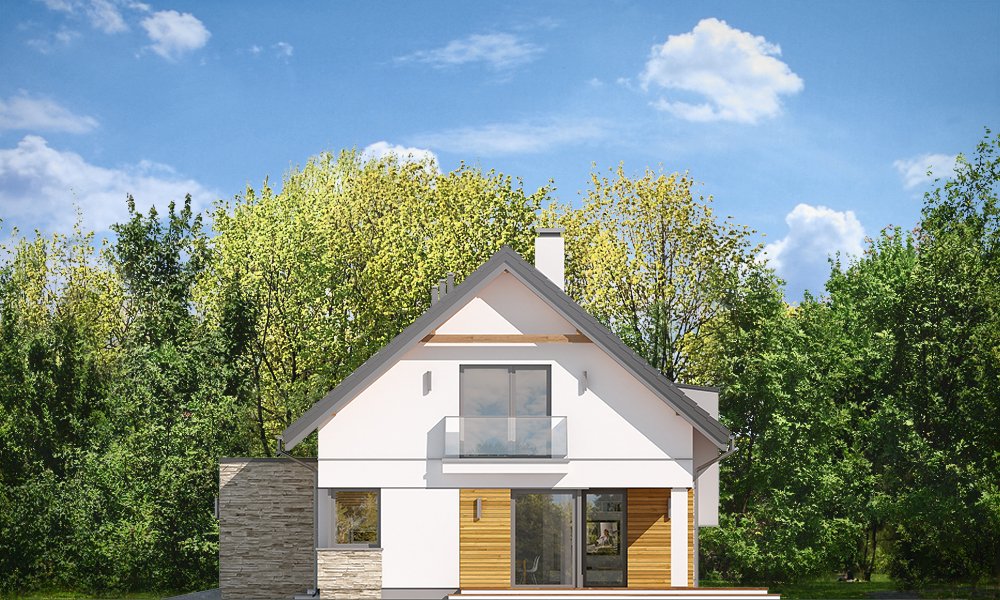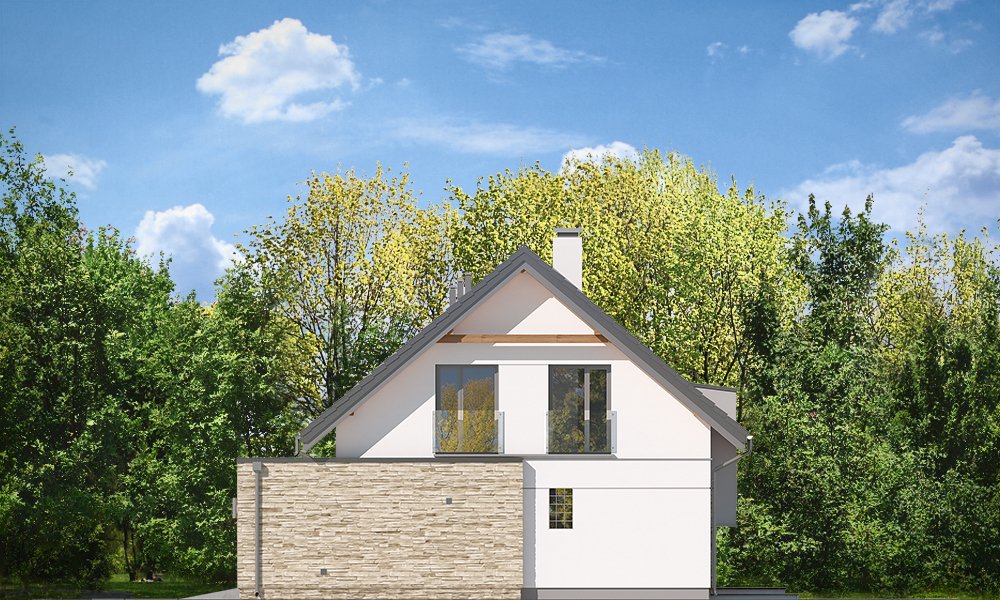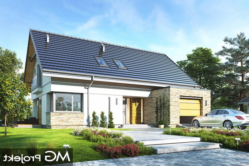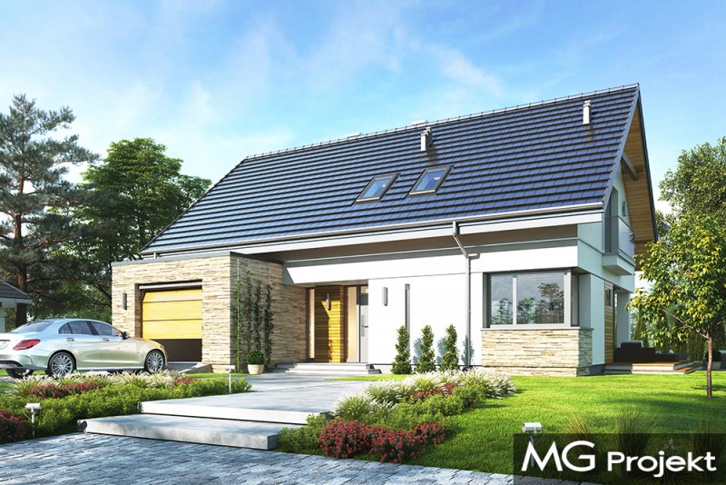 Tango to jeden z projektów z kolekcji „roztańczonych” domów :-), których protoplastą jest popularny projekt Party (Party, Party 2, Fokstrot, Rumba, Biba, Samba, Salsa). Tango to dom jednorodzinny, parterowy z użytkowym poddaszem, przeznaczony dla 4-6cioosobowej rodziny. Prostokątna bryła budynku, przekryta jest dwuspadowym symetrycznym dachem. Bryłę urozmaicają : wystająca z obrysu część garażowa, przeszklona wnęka podcienia wejściowego, wycięty narożnik zadaszonej części tarasu od strony ogrodu, czy kubiczna lukarna na podeście klatki schodowej. Dom ma piękne przeszklenia otwierające wnętrze na ogród i dodające atrakcyjnego reprezentacyjnego wyglądu elewacji frontowej. Wykończenie elewacji kamiennymi i drewnianymi wstawkami dodaje bryle nowoczesności i właściwych proporcji. Architektura domu, choć prosta, przyciąga wzrok i zwraca uwagę. Wnętrze „Tanga” jest niemniej ciekawe. Otwarcie przestrzenne - pustka nad salonem i nad schodami powiększa wizualnie cześć dzienną i uatrakcyjnia wnętrze domu. Do domu wchodzimy szerokimi reprezentacyjnymi drzwiami z naświetlem do wygodnej sieni z szatnią, a następnie szerokimi podwójnymi szklanymi drzwiami do holu i salonu. Zdecydowaliśmy się na zaprojektowanie wejścia do wc z przedsionka - bardzo praktyczne rozwiązanie izolujące to pomieszczenie od salonu i gości. Z szatni przechodzimy do wygodnego garażu i kotłowni. Wnętrze dzienne to salon, z centralnym kominkiem, piękne schody połączone z pustką nad salonem, jadalnia i kuchnia ze spiżarnią. Z holu przy schodach dostajemy się do dodatkowego pokoju i schowka porządkowego pod schodami. Na poddaszu umieszczono trzy sypialnie : osobny apartament rodziców, z własną łazienką i garderobą, oraz sypialnie dziecięce, z wbudowanymi szafami i oddzielną łazienką. Sypialnie rozdziela holl- antresola, z widokiem na dół, na salon i na schody. Dom stanowi połączenie prostej tradycyjnej formy z ciekawymi rozwiązaniami architektonicznymi, dodającymi zewnętrzu i wnętrzu atrakcyjności. Prosta konstrukcja i zwarta bryła powodują, że dom jest przy tym niedrogi w budowie i w późniejszej eksploatacji. Tango to doskonała propozycja dla Inwestorów pragnących wyróżnić się spośród wielu identycznych domów. Zapraszamy !