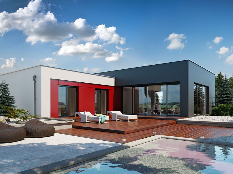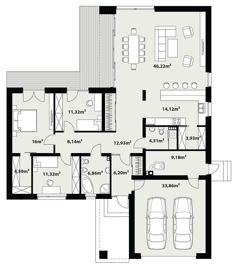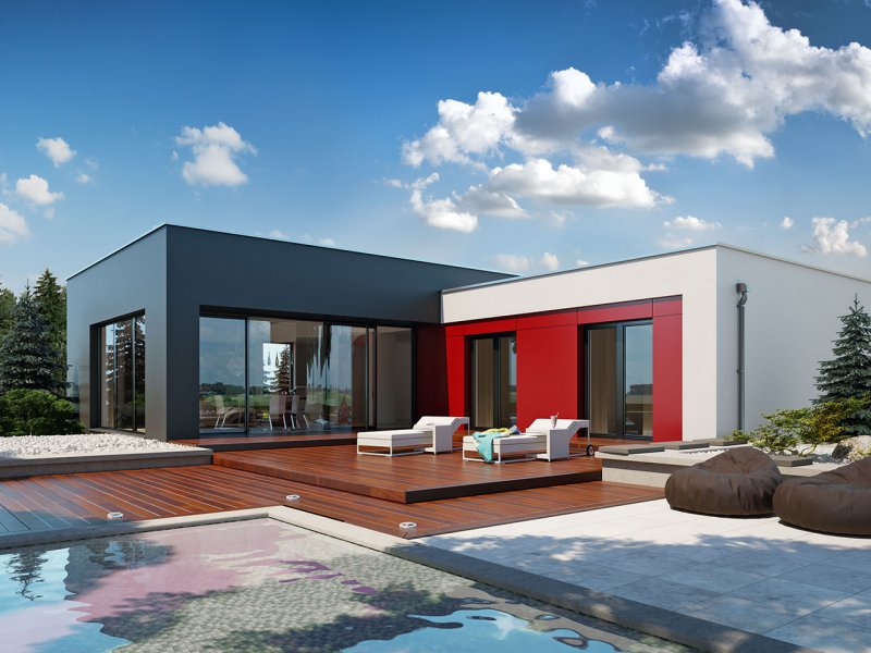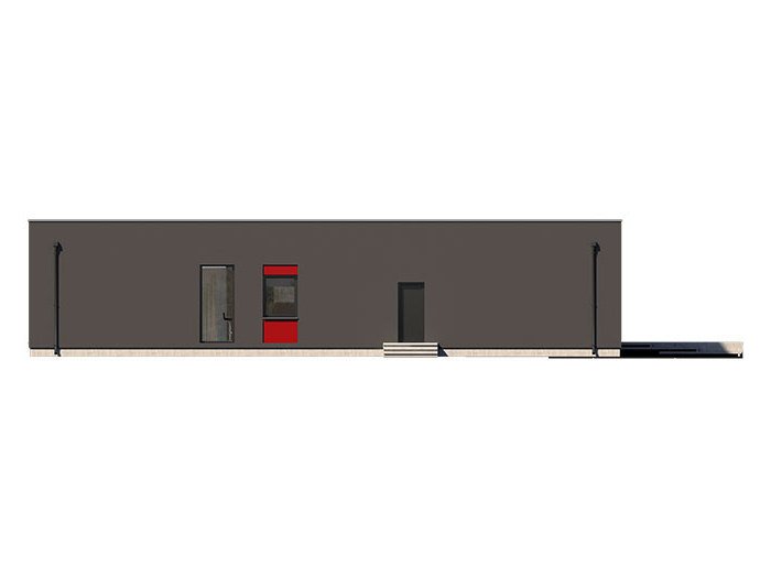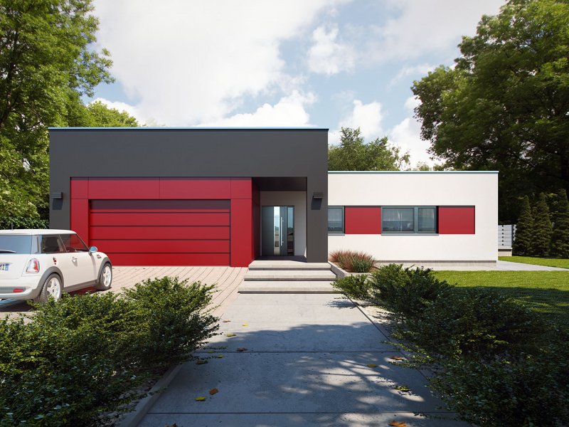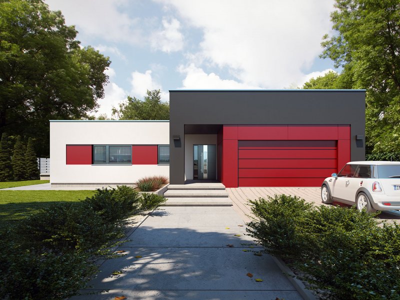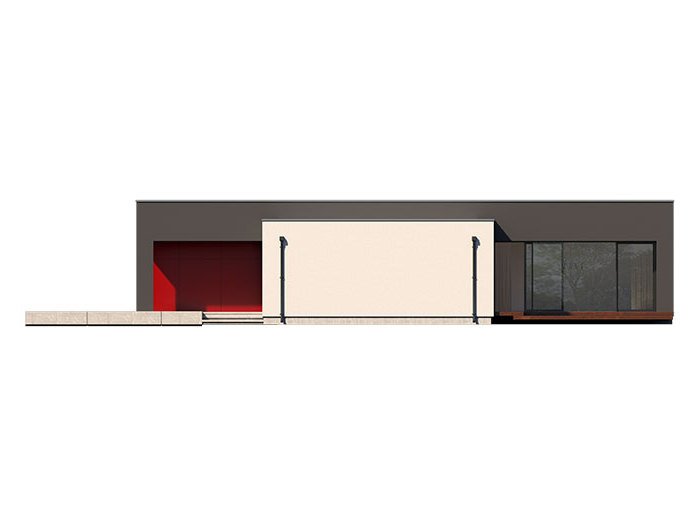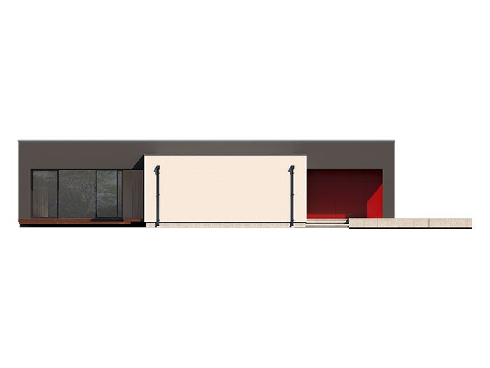 Parterowy dom jednorodzinny, z dwustanowiskowym garażem utrzymany w nowoczesnym klimacie. Swoim optymalnym programem funkcjonalnym zapewnia komfort i wygodę 4-osobowej rodzinie. Przestronna część dzienną to głównie salon połączony z jadalnią, otwarty na ogród poprzez ogromne przeszklenia. W części dziennej zaprojektowano również kuchnię ze spiżarnią i wc. Część nocna składa się z: 3 wygodnych sypialni, łazienki oraz garderoby. W domu zaprojektowano dużą kotłownię dostępną z garażu, której wielkość pozwala na montaż kotła na każdy rodzaj paliwa, w tym na paliwo stałe. Ten optymalny program funkcjonalny został ujęty w prostej bryle na rzucie litery T. Atutem projektu jest jego prostota nie tylko w układzie pomieszczeń ale również w wykończeniu elewacji.