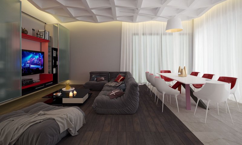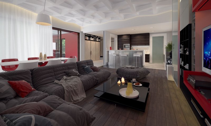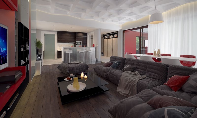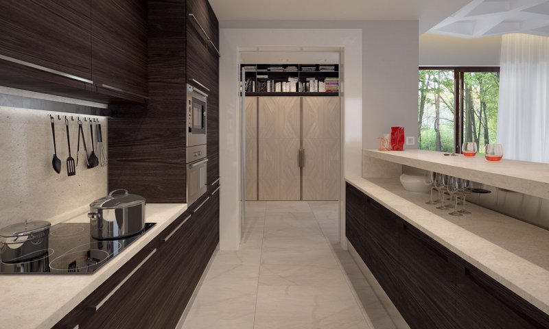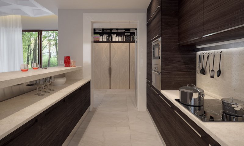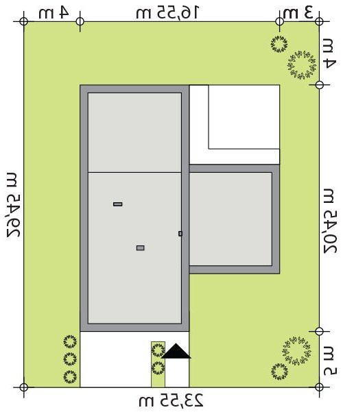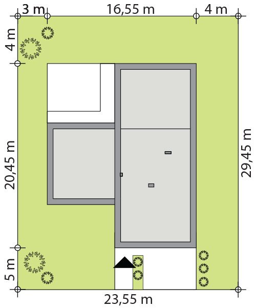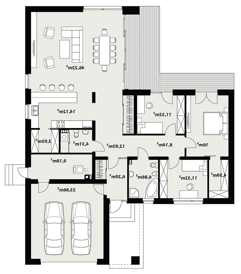 Parterowy dom jednorodzinny, z dwustanowiskowym garażem utrzymany w nowoczesnym klimacie. Swoim optymalnym programem funkcjonalnym zapewnia komfort i wygodę 4-osobowej rodzinie. Przestronna część dzienną to głównie salon połączony z jadalnią, otwarty na ogród poprzez ogromne przeszklenia. W części dziennej zaprojektowano również kuchnię ze spiżarnią i wc. Część nocna składa się z: 3 wygodnych sypialni, łazienki oraz garderoby. W domu zaprojektowano dużą kotłownię dostępną z garażu, której wielkość pozwala na montaż kotła na każdy rodzaj paliwa, w tym na paliwo stałe. Ten optymalny program funkcjonalny został ujęty w prostej bryle na rzucie litery T. Atutem projektu jest jego prostota nie tylko w układzie pomieszczeń ale również w wykończeniu elewacji.