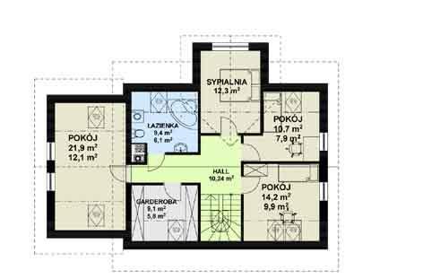 Dom jednorodzinny z poddaszem użytkowym, odpowiedni dla rodziny cztero lub pięcioosobowej. Na parterze salon z kominkiem połączony jest z przeszkloną jadalnią otwartą na ogród . Kuchnia otwarta na salon i jadalnię dzięki dużym drzwiom przesuwnym. Poddasze mieści cztery sypialnie, łazienkę i garderobę.