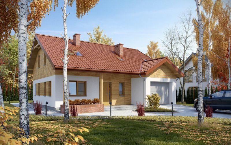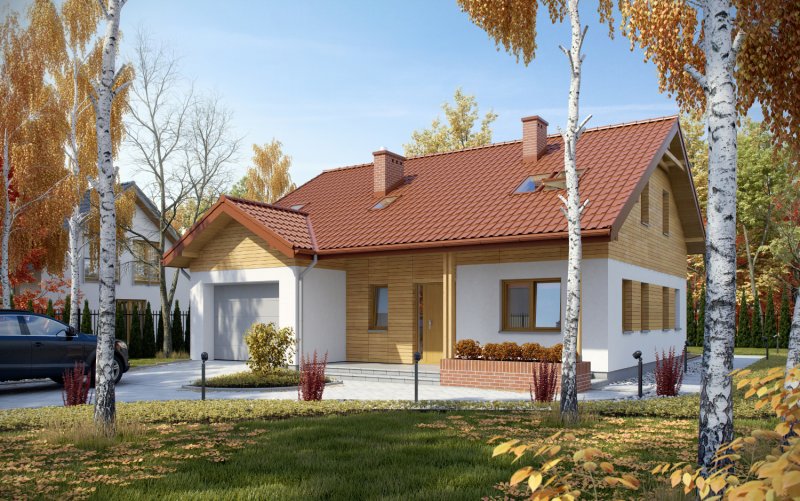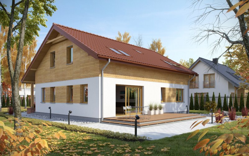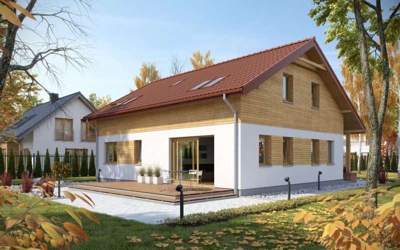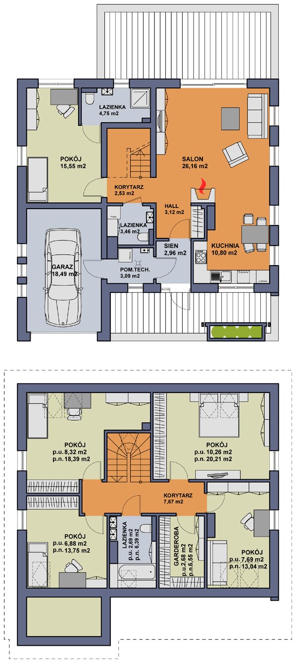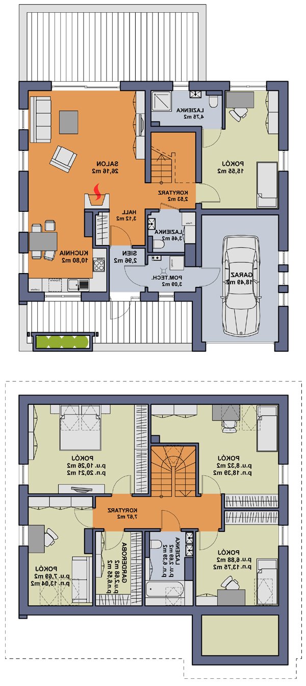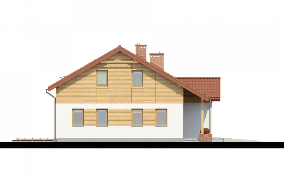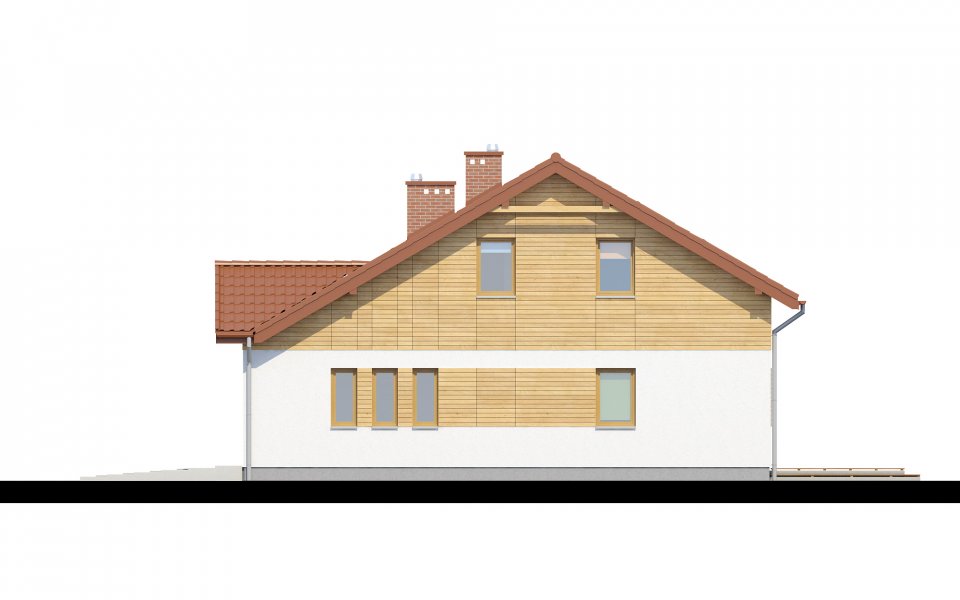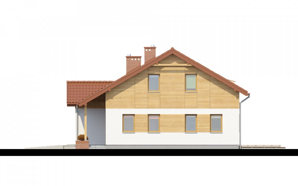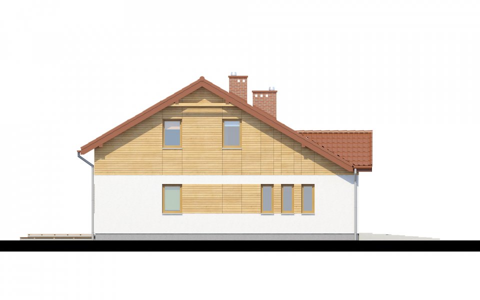 Dzięki bardzo funkcjonalnie rozplanowanemu wnętrzu dom ten charakteryzuje się dużą ilością pokoi przy stosunkowo małej powierzchni użytkowej. Dzięki temu doskonale sprawdzi się jako dom wielopokoleniowy, gdzie na parterze w pokoju z łazienką będzie mogła zamieszkać np. babcia. Na poddaszu zaprojektowano aż 4 pokoje, łazienkę i pomieszczenie pomocnicze.