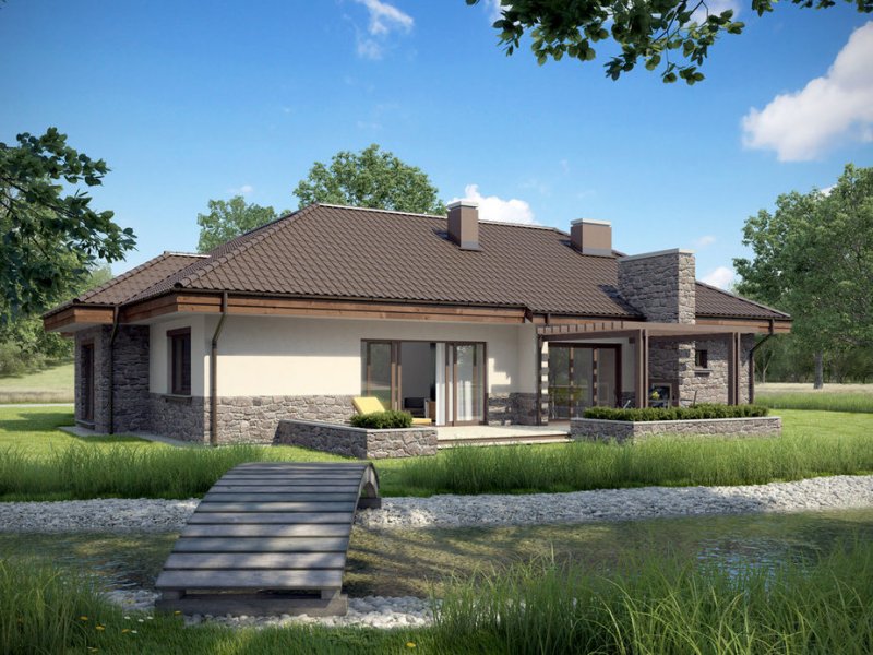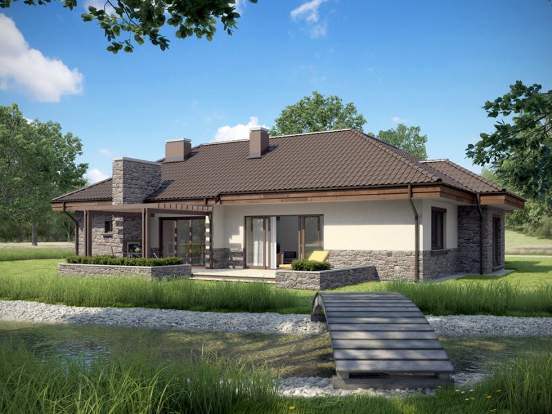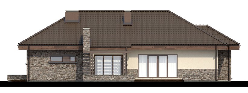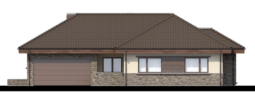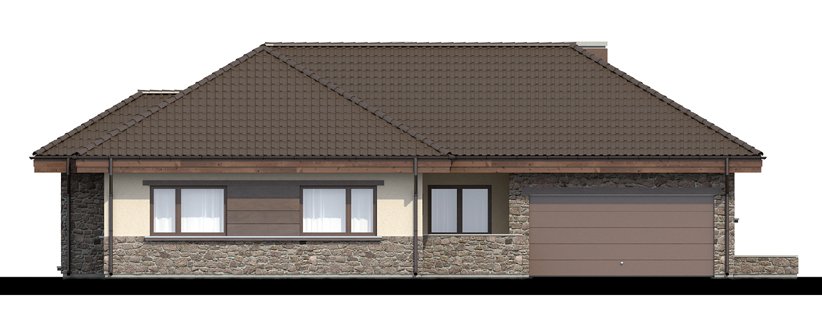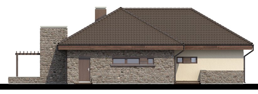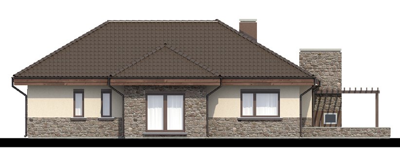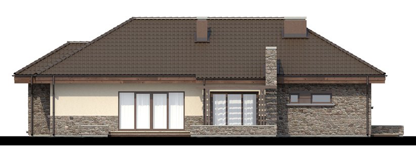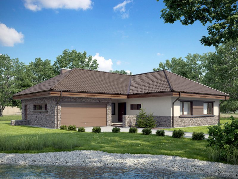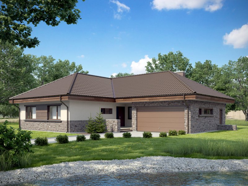 Zgrabny dom parterowy, w którym zastosowaliśmy okładzinę kamienną i drewnianą dzięki czemu łączy on tradycję z nowoczesnym wyglądem. W budynku tym ciekawie rozwiązana została strefa wejściowa. Drzwi wejściowe ukryte z boku oraz odgrodzenie murkiem z zielenią daje mieszkańcom poczucie bezpieczeństwa i intymności. Dom niezwykle rozłożysty i funkcjonalny dzięki licznym pomieszczeniom pomocniczym takim jak spiżarnia czy garderoby. We wnętrzu wyraźny podział na strefę dzienną i nocna. W strefie dziennej trzy duże sypialnie tak, że dom ten doskonale nadaje się dla rodziny czteroosobowej.