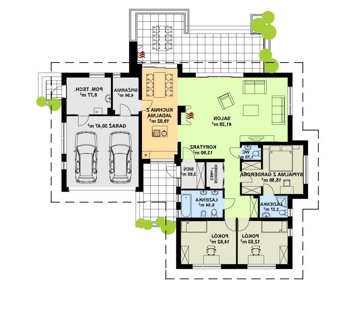 Dom TK30 o powierzchni użytkowej 134,9m2 to jeden z najpopularniejszych domów parterowych w ofercie kreoDOM.pl. Znajdują się w nim trzy sypialnie. Dwie z nich są mniejsze i mogą być wykorzystane jako pokoje dla dzieci lub pokoje gościnne. Domy parterowe są równie czarujące jak piętrowe. Podejmując decyzję o budowie takiego domu bierze się pod uwagę głownie fakt, że wszystkie pokoje znajdują się na jednym poziomie.