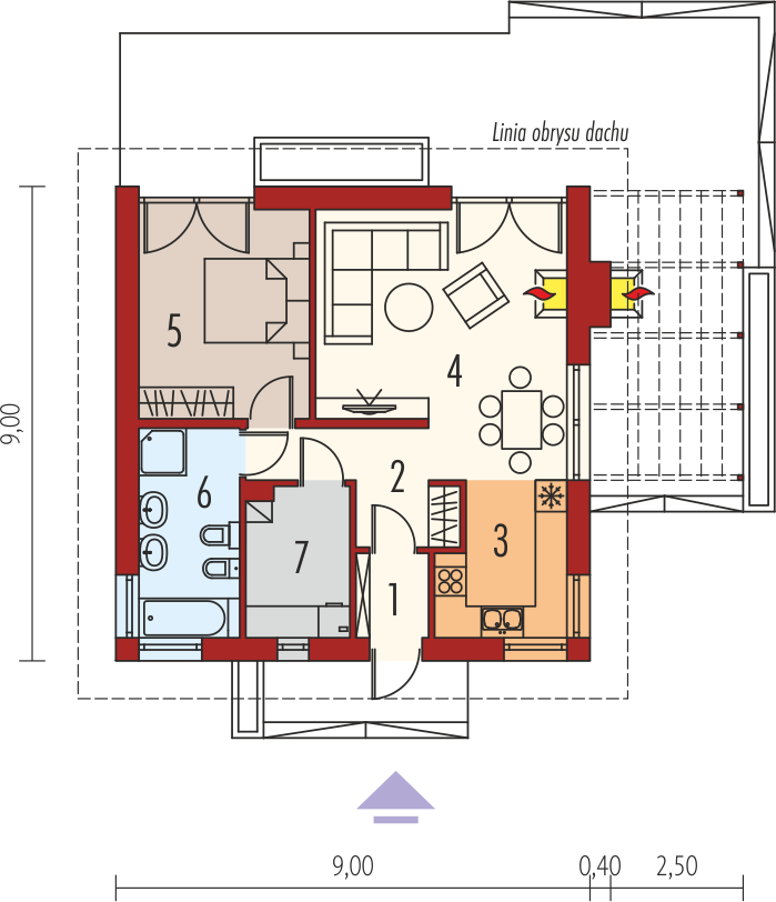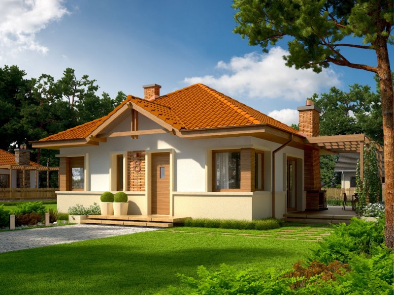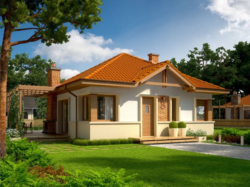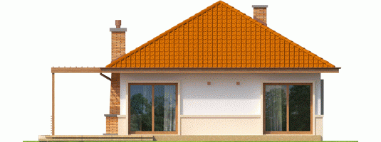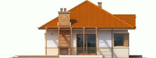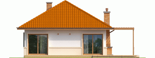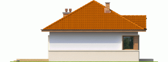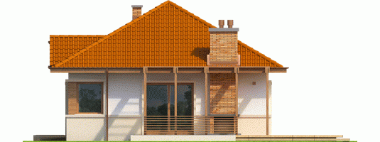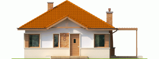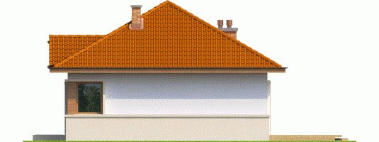 Doskonały dom na małą działkę. Kompaktowa bryła ubrana w elegancki czterospadowy dach, została otulona mleczno-brzoskwiniową kompozycją elewacji. Strefa wejściowa czaruje swoją symetrią i ciekawie zaprojektowanym zadaszeniem nad wejściem. Wnętrze domu imponuje swoim przemyślanym układem funkcjonalnym – na stosunkowo niewielkiej powierzchni udało się zaplanować komfortowy podział stref. Charakterystycznym elementem architektury budynku jest atrakcyjna pergola, która integruje dom z ogrodem, zapraszając w swoją przestrzeń urodę kwiatów i ciepło słonecznych promieni. Wieczory na tarasie rozświetli domownikom elegancki kominek zewnętrzny.
