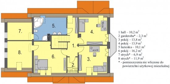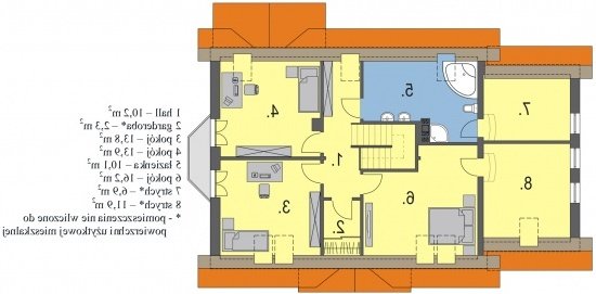 Tulipia to niepodpiwniczony domek z użytkowym poddaszem dla cztero - pięcioosobowej rodziny. Dom o klasycznej, prostej bryle i bardzo atrakcyjnym wyglądzie. Praktyczny rozkład pomieszczeń daje ogromne możliwości aranżacji wnętrza. Na parterze zaprojektowano pokój dzienny z jadalnią, kuchnię, pom. gospodarcze, gabinet i łazienkę. Na poddaszu znajdują się trzy przestronne pokoje oraz duża łazienka. Dodatkowo istnieje możliwość wykorzystania powierzchni strychowej nad garażem. Dostępna jest wersja projektu bez garażu oraz z garażem dwustanowiskowym, dodatkowo każda z wersji dostępna w lustrzanym odbiciu. Dom można zestawić w bliźniaka.