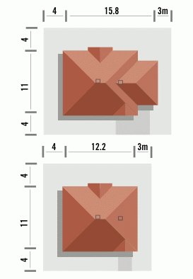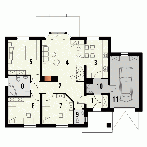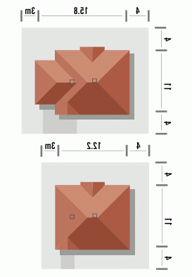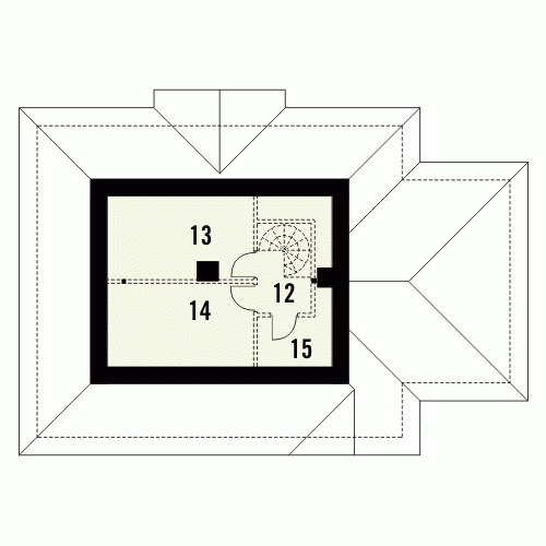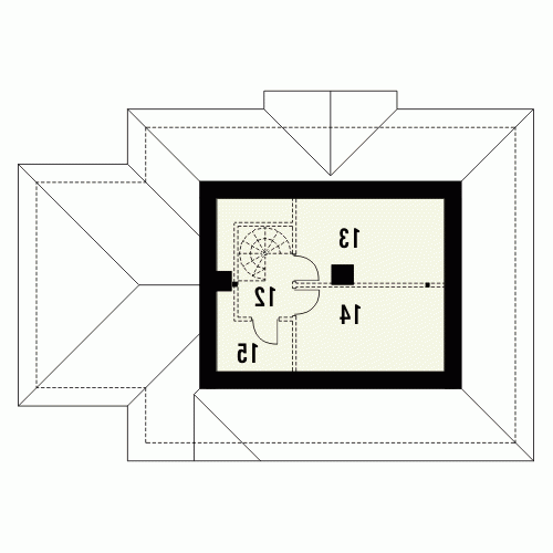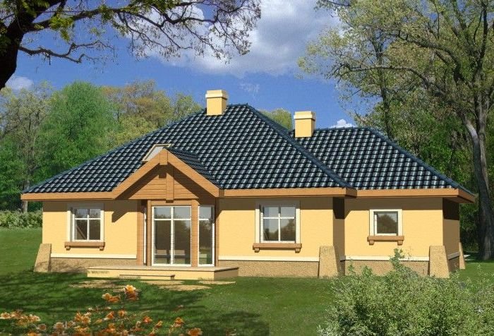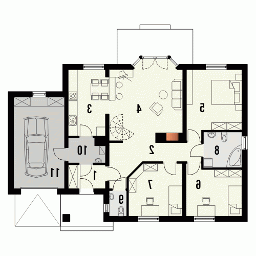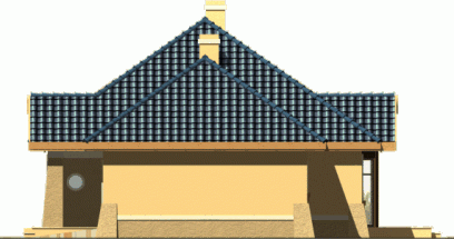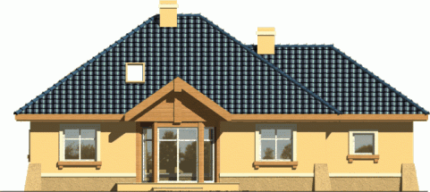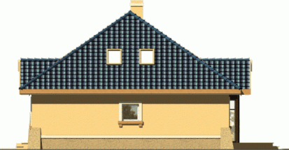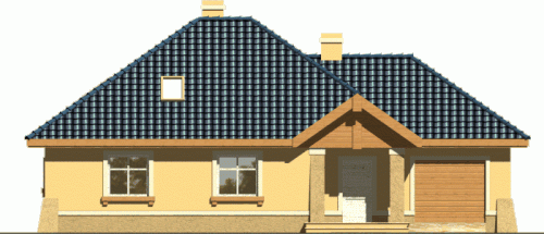 Budynek niepodpiwniczony z poddaszem, wariantowo z garażem lub bez. Obok salonu z kuchnią zaprojektowano na parterze trzy pokoje, łazienkę, wc i pomieszczenie gospodarcze dostępne z kuchni i garażu, mogące spełniać rolę spiżarni. Wyjście na taras z pokoju dziennego jest w formie atrakcyjnego wykusza. Na poddaszu jest miejsce dla dwóch dodatkowych pokoi. Dokumentacja dostępna również w odbiciu lustrzanym.