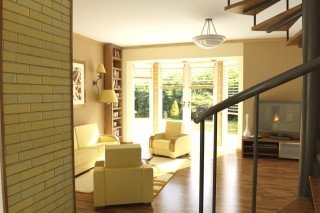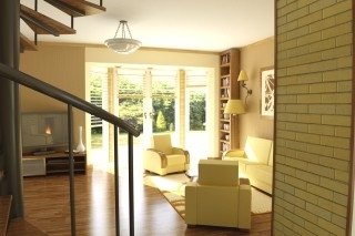 Atutem tego domu są malowniczo komponujące się połacie dachowe przykrywające zarówno główną bryłę budynku, jak i dostawiony z boku garaż. Główne wejście pomiędzy kolumnami dźwigającymi obłożony drewnem szczyt dachu, jest również jednym z elementów czyniącym ten dom wartym zapamiętania.