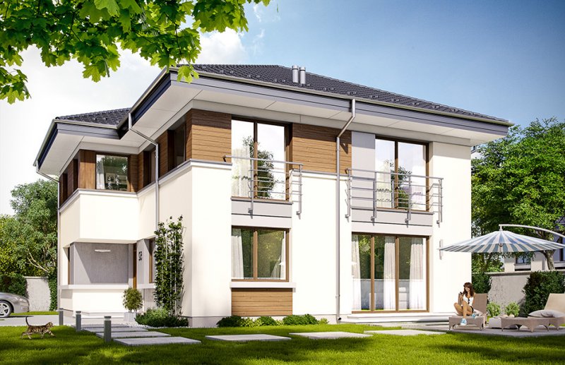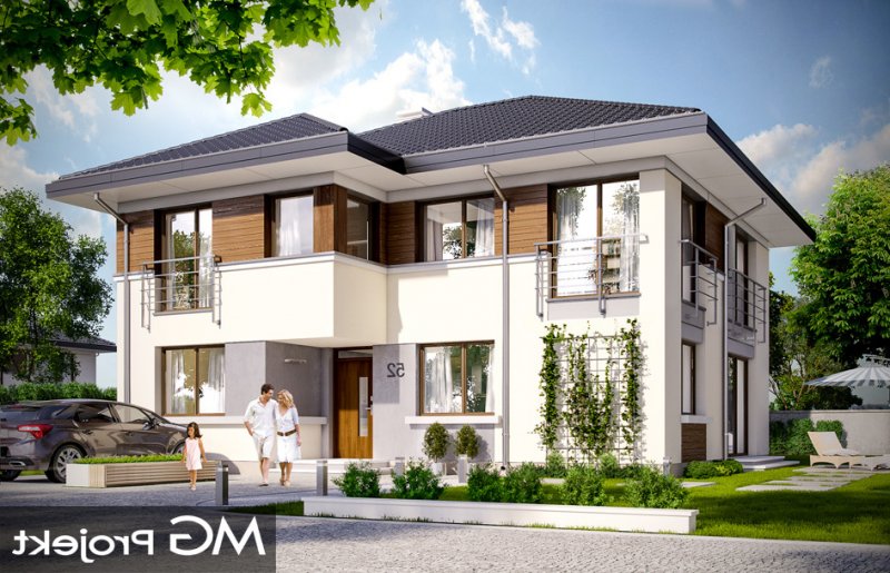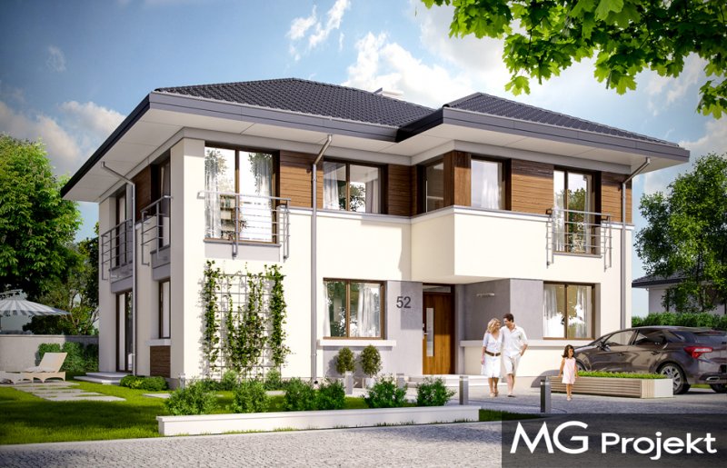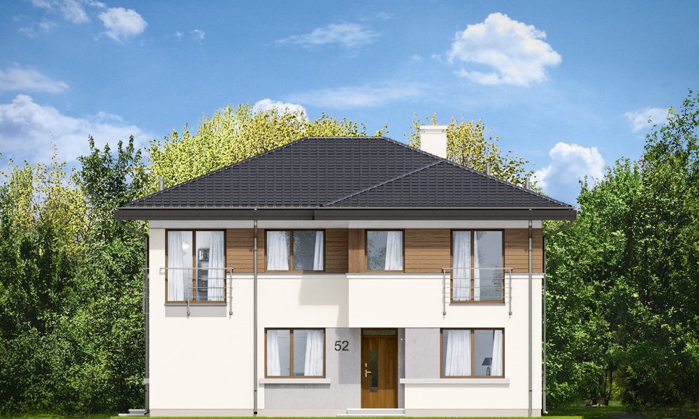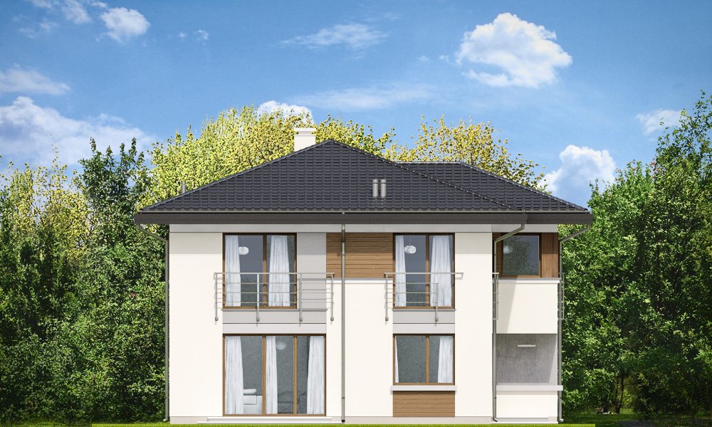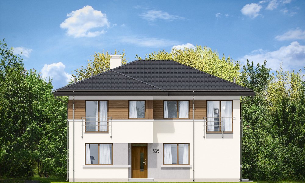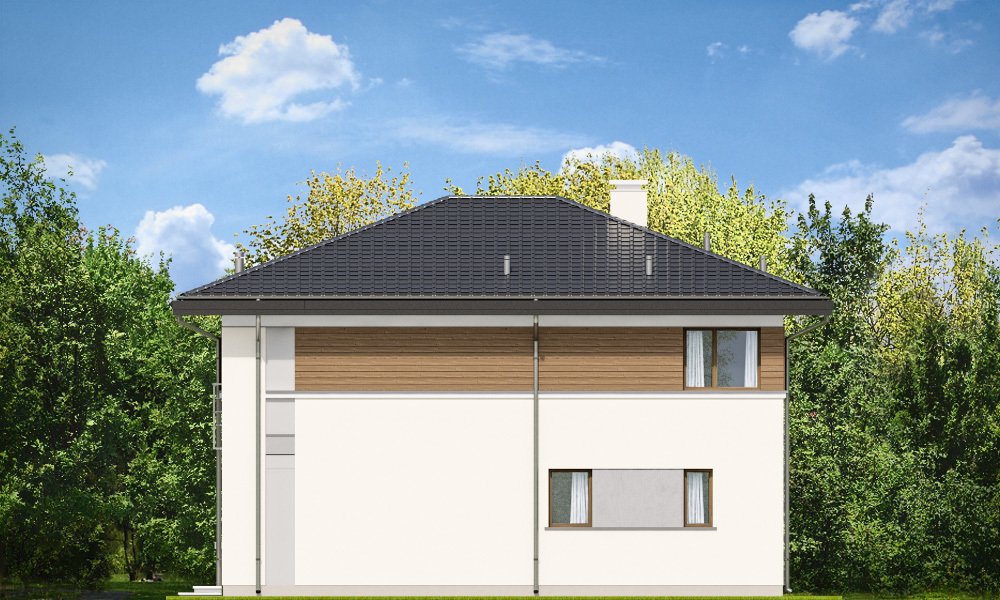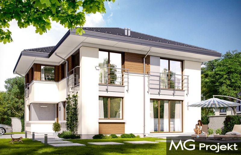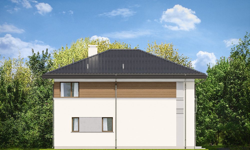 Tytan 2 jest kolejną wersją wariantową popularnego projektu Tytan. Tytan 2 występuje w trzech wersjach wariantowych: prezentowany Tytan 2, następnie Tytan 2 wariant B - dom z mniejszą liczbą okien balkonowych na parterze i na piętrze ( z mniejszą liczbą przeszkleń ), oraz Tytan 2 wariant C - projekt z dachem o większym kącie nachylenia (30 stopni). Każda z wymienionych wersji projektu jest bardzo podobne, wszystkie są zbudowane na tej samej bryle, o tej samej wielkości. Tytan 2 to budynek piętrowy, przeznaczony dla 5-7mioosobowej rodziny. Dom dla inwestorów chcących wycisnąć maksymalnie dużą ilość pokoi z niedużej przestrzeni. Aby maksymalnie wykorzystać przestrzeń wnętrza zrezygnowano z garażu. dom jest maksymalnie prosty i praktyczny. Na parterze mamy salon, kuchnię z aneksem jadalnym, dodatkowy spory pokój ( np. dla seniorów ), oraz łazienkę i pomieszczenia gospodarcze. Na piętrze mamy cztery pełnowymiarowe pokoje, dużą garderobę i bardzo ładną łazienkę. A wszystko na 170ciu metrach powierzchni. Bryła domu jest prosta, ale wkomponowana w nowoczesną ładną architekturę. Elewacje piętrowego domu podzielono na poziome pasy, obniżając optycznie bryłę. Dom nadaje się na działkę z ogródkiem z boku - tam, gdzie mamy niekorzystne usytuowanie wjazdu na działkę w stosunku do nasłonecznienia. Dom jest bardzo dobrze ocieplony, energooszczędny. A dzięki prostej bryle będzie łatwy i niedrogi w budowie.
