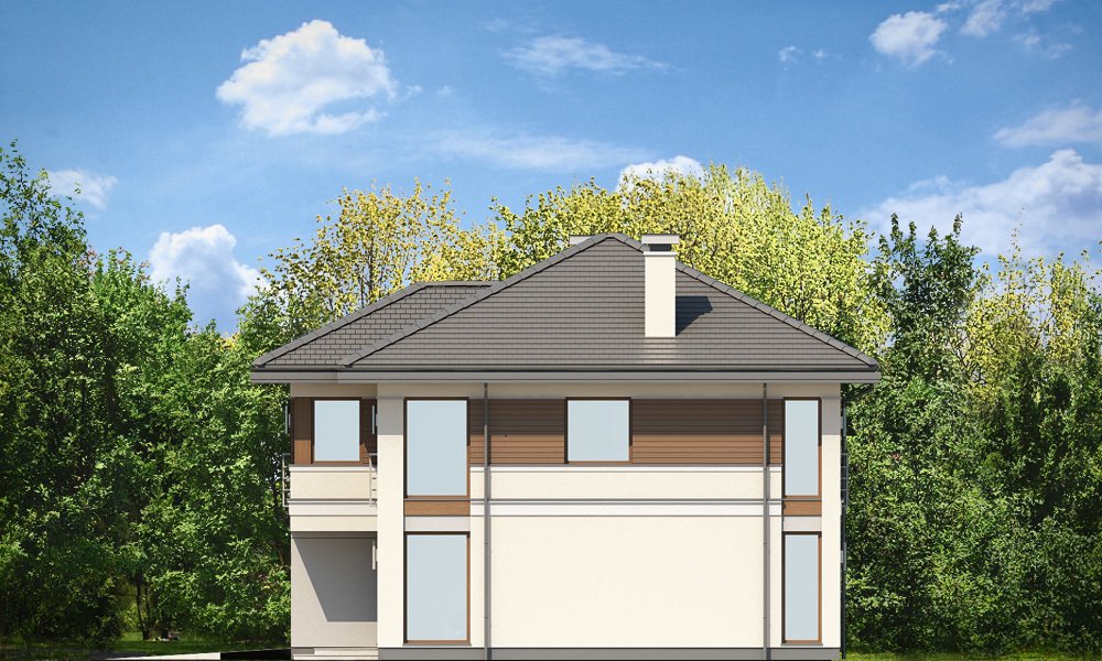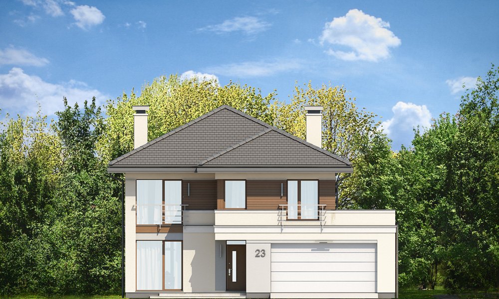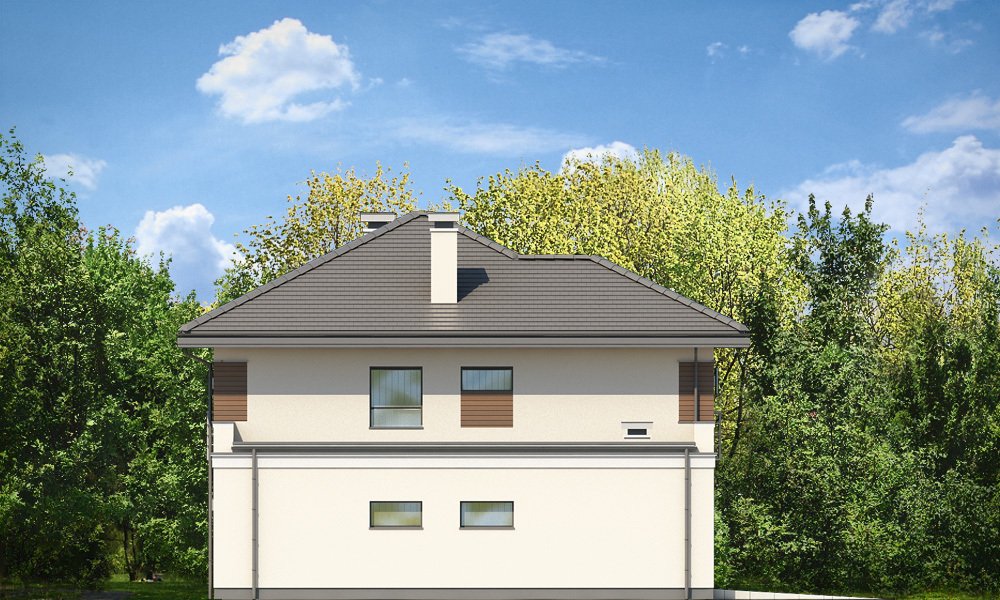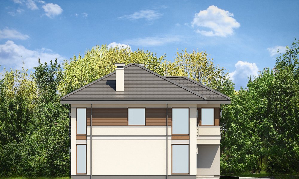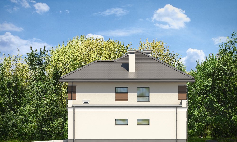 Tytan 3 jest kolejną wersją popularnego projektu Tytan. Dom jednorodzinne, piętrowy, z garażem częściowo wbudowanym w bryłę budynku. Przeznaczony dla 4-6cioosobowej rodziny. Bryła budynku o prostokątnym kształcie. Rdzeń domu na planie kwadratu, przykryty kopertowym dachem. Budynek o prostej konstrukcji, łatwy w budowie i niedrogi w późniejszym utrzymaniu. Dzięki otwarciu dużymi oknami na stronę elewacji frontowej i bocznej Tytan 3 doskonale nadaje się na działki o niekorzystnym położeniu wjazdu i drogi dojazdowej względem słońca. Dom zachowuje ogródek i teras z tyłu domu, ale dzięki dużym przeszkleniom narożnika frontowego wnętrze będzie skąpane w słońcu, nawet gdy działka ma wjazd od południa. Wnętrze parteru to otwarta przestrzeń dzienna połączonych : salonu, jadalni, holu i kuchni. Dodatkowo na parterze przewidziano duży podwójny garaż, kotłownię, łazienkę, spiżarnię, oraz pokój ( gabinet, lub sypialnię ). Na piętrze do dyspozycji mieszkańców są cztery pokoje, dwie łazienki i duża garderoba z sypialni rodziców. Nad piętrem mamy jeszcze strych. Dom ma nowoczesną, ale spokojną architekturę. Detale dobrano w stonowany sposób, tak żeby bom był nowoczesny, ale nie awangardowy. Tytan 3 to doskonały wybór dla inwestorów ceniących sobie komfort, wygodę i praktyczność. Budynek jest bardzo dobrze ocieplony i wyposażony w energooszczędne rozwiązania. W łatwy sposób można go przystosować do standardu NF40.