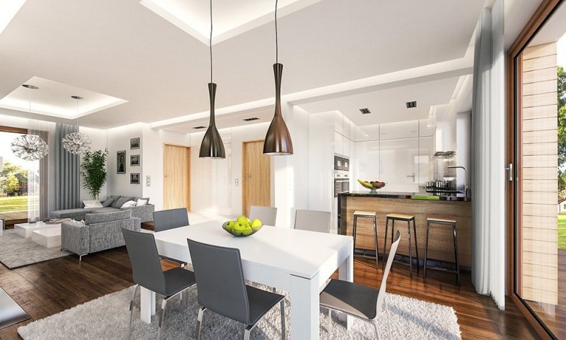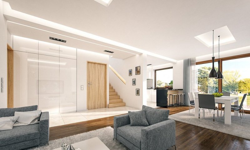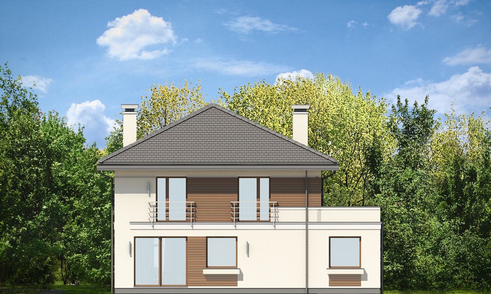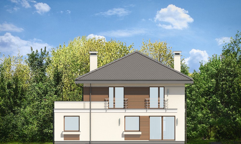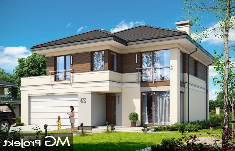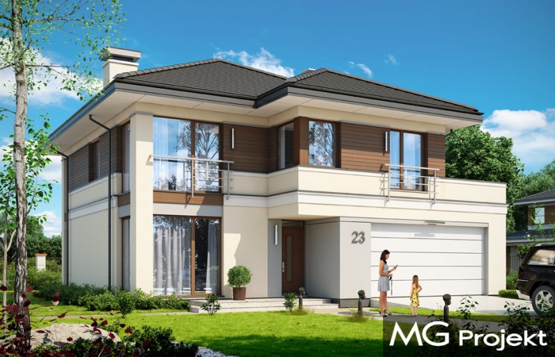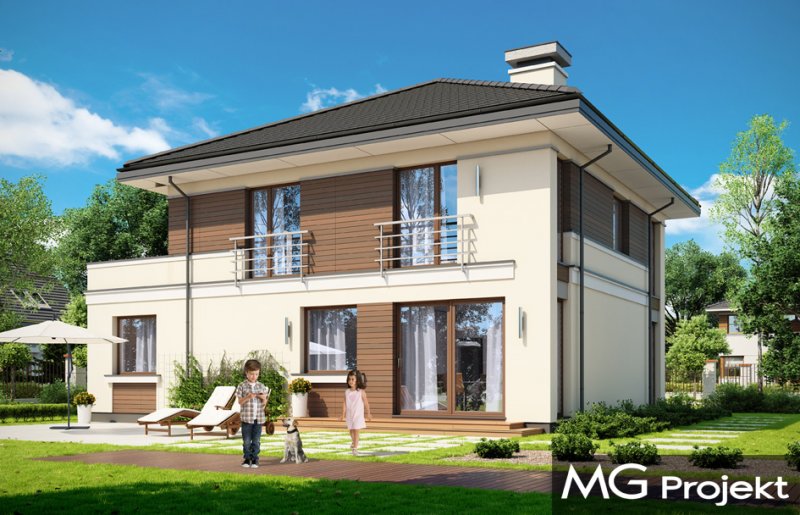 Tytan 3 jest kolejną wersją popularnego projektu Tytan. Dom jednorodzinne, piętrowy, z garażem częściowo wbudowanym w bryłę budynku. Przeznaczony dla 4-6cioosobowej rodziny. Bryła budynku o prostokątnym kształcie. Rdzeń domu na planie kwadratu, przykryty kopertowym dachem. Budynek o prostej konstrukcji, łatwy w budowie i niedrogi w późniejszym utrzymaniu. Dzięki otwarciu dużymi oknami na stronę elewacji frontowej i bocznej Tytan 3 doskonale nadaje się na działki o niekorzystnym położeniu wjazdu i drogi dojazdowej względem słońca. Dom zachowuje ogródek i teras z tyłu domu, ale dzięki dużym przeszkleniom narożnika frontowego wnętrze będzie skąpane w słońcu, nawet gdy działka ma wjazd od południa. Wnętrze parteru to otwarta przestrzeń dzienna połączonych : salonu, jadalni, holu i kuchni. Dodatkowo na parterze przewidziano duży podwójny garaż, kotłownię, łazienkę, spiżarnię, oraz pokój ( gabinet, lub sypialnię ). Na piętrze do dyspozycji mieszkańców są cztery pokoje, dwie łazienki i duża garderoba z sypialni rodziców. Nad piętrem mamy jeszcze strych. Dom ma nowoczesną, ale spokojną architekturę. Detale dobrano w stonowany sposób, tak żeby bom był nowoczesny, ale nie awangardowy. Tytan 3 to doskonały wybór dla inwestorów ceniących sobie komfort, wygodę i praktyczność. Budynek jest bardzo dobrze ocieplony i wyposażony w energooszczędne rozwiązania. W łatwy sposób można go przystosować do standardu NF40.