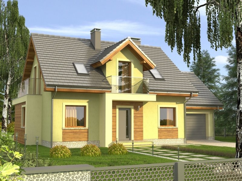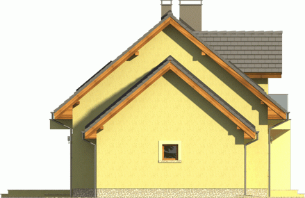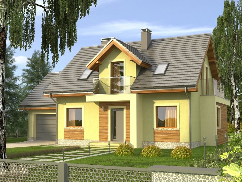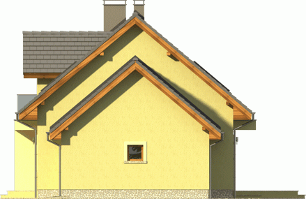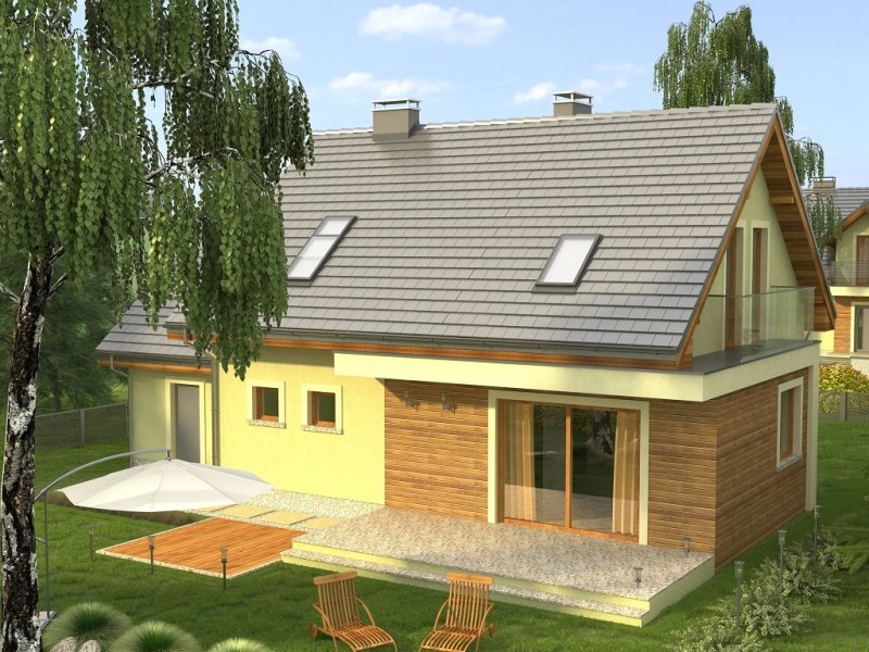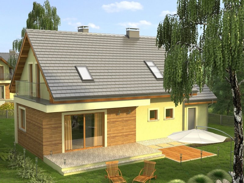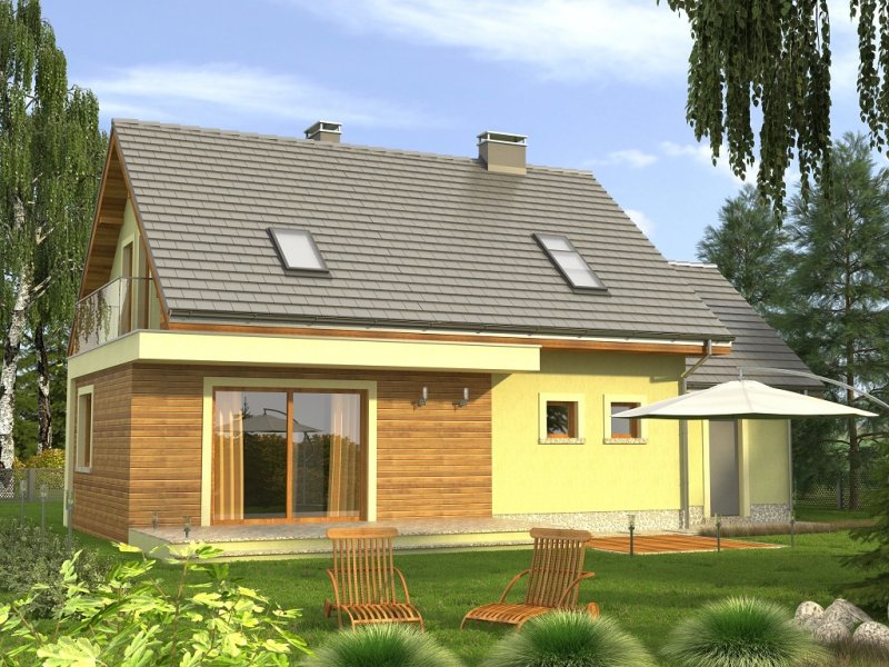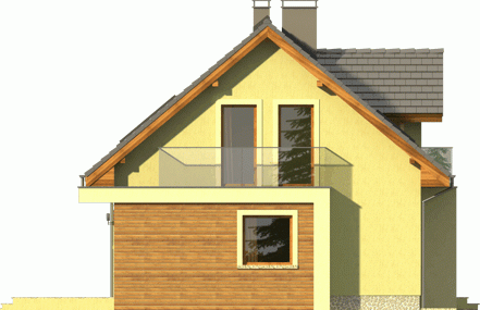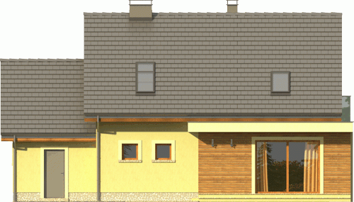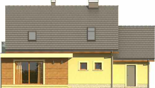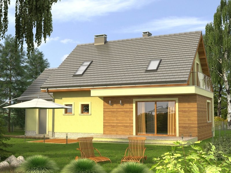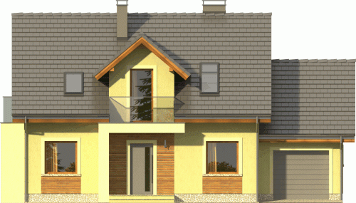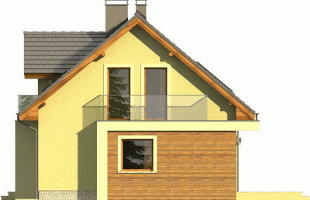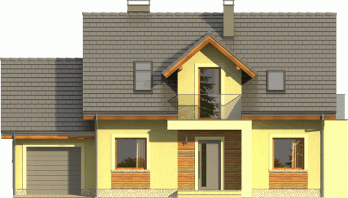 Ciekawy dom z dachem dwuspadowym z garażem jednostanowiskowym lub wariantowo bez garażu. Uwagę zwracają tynkowane ramy podkreślające wejście oraz wyjście na taras od strony ogrodowej. Dla nadania fasadom elegancji zaprojektowano obłożenie drewnem fragmentów ścian.