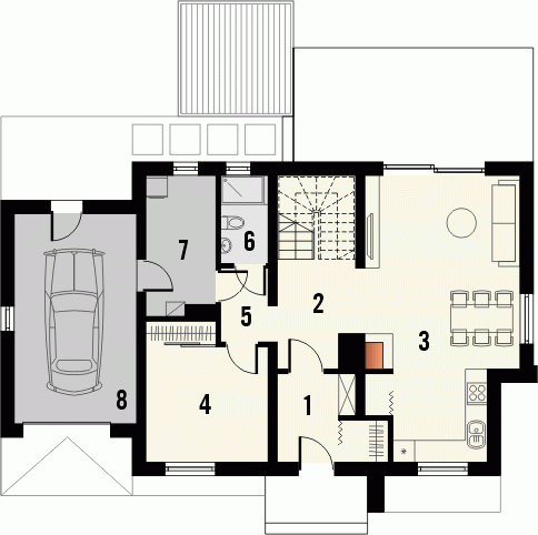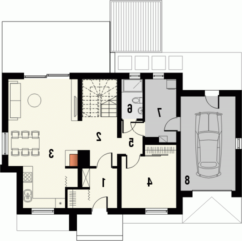 Budynek niepodpiwniczony, piętrowy z garażem dostawionym z boku. W strefie dziennej otwarty salon z kuchnią wyposażona w spiżarnię. Przejście do garażu prowadzi przez stanowiące śluzę pomieszczenie gospodarcze. Przy dodatkowym pokoju na parterze zlokalizowana jest łazienka. Na poddaszu pod dachem stromym są 3 dodatkowe sypialnie, przestronna łazienka i garderoba. Dokumentacja dostępna również w odbiciu lustrzanym.