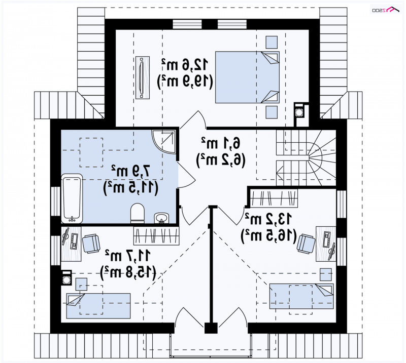 Na piętrze znajdują się trzy pokoje i duża łazienkę. Dwa pokoje na poddaszu mają dostęp do frontowego balkonu i dzięki lukarnie pozbawione są w znacznej części „skosów”.