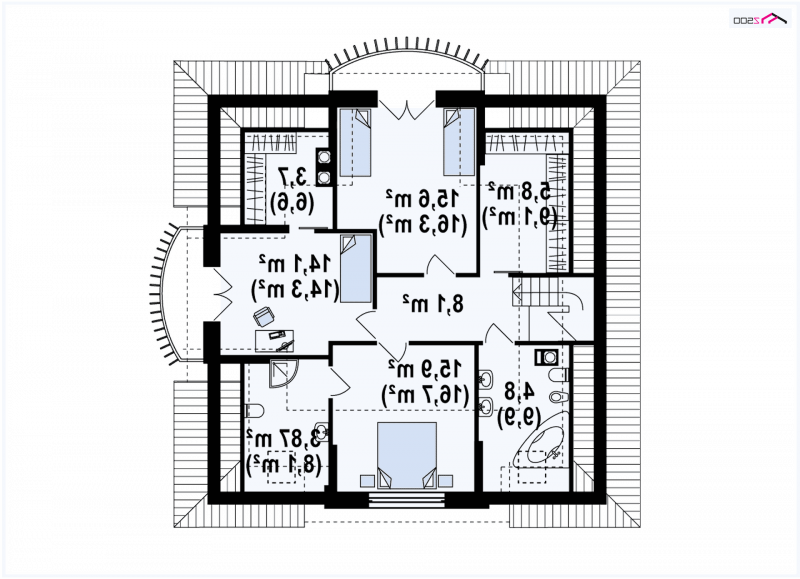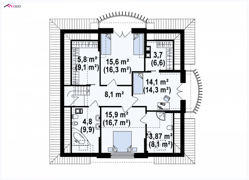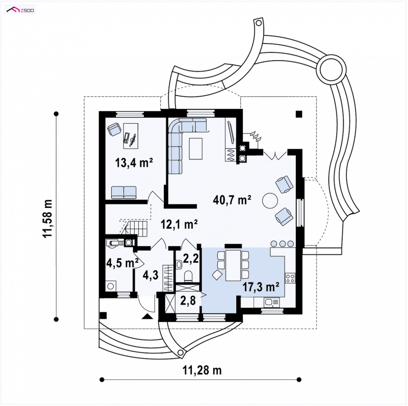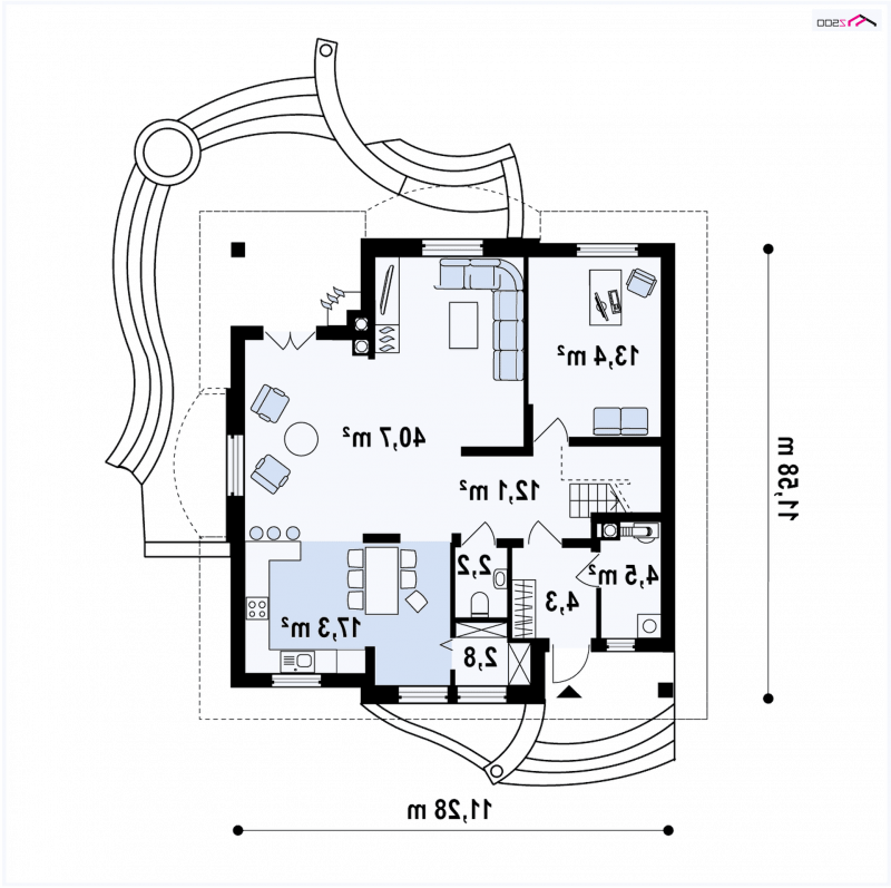 Z18 wykonano na rzucie zbliżonym do kwadratu. Wygląd zewnętrzny łączy klasykę ze współczesnymi rozwiązaniami. Kopertowy dach, lukarny, imponujący półokrągły taras, jak również klasyczne słupy podpierające podcień czynią dom dostojnym i eleganckim.