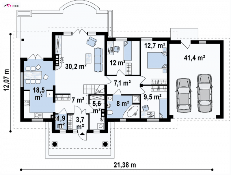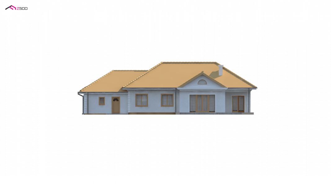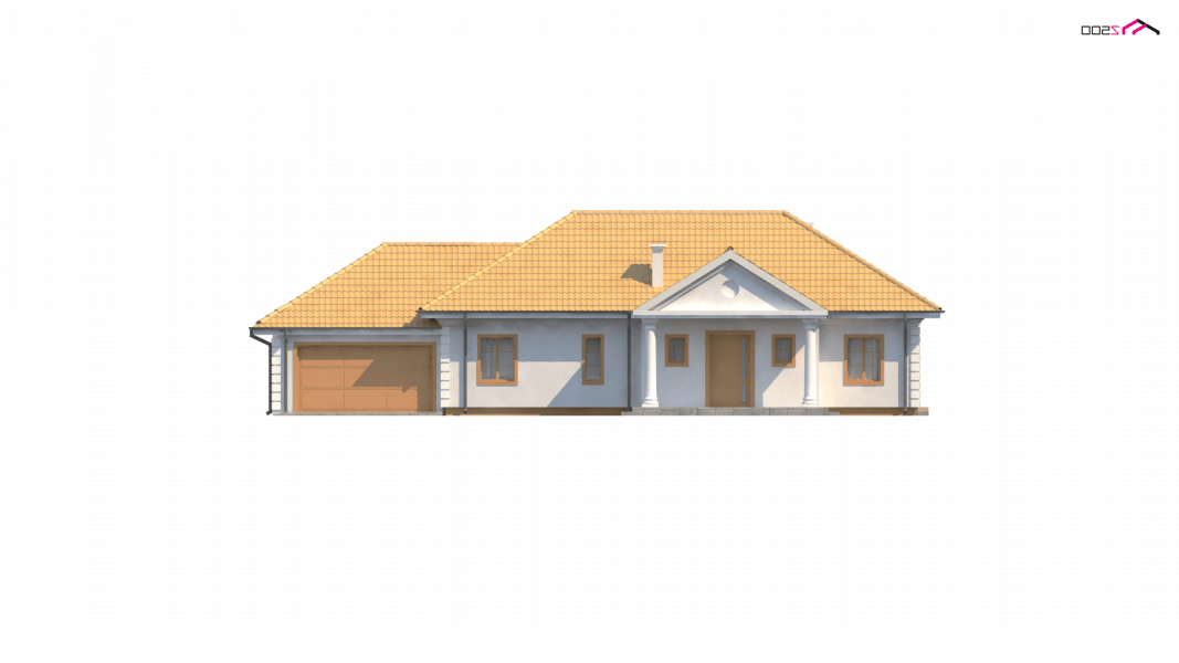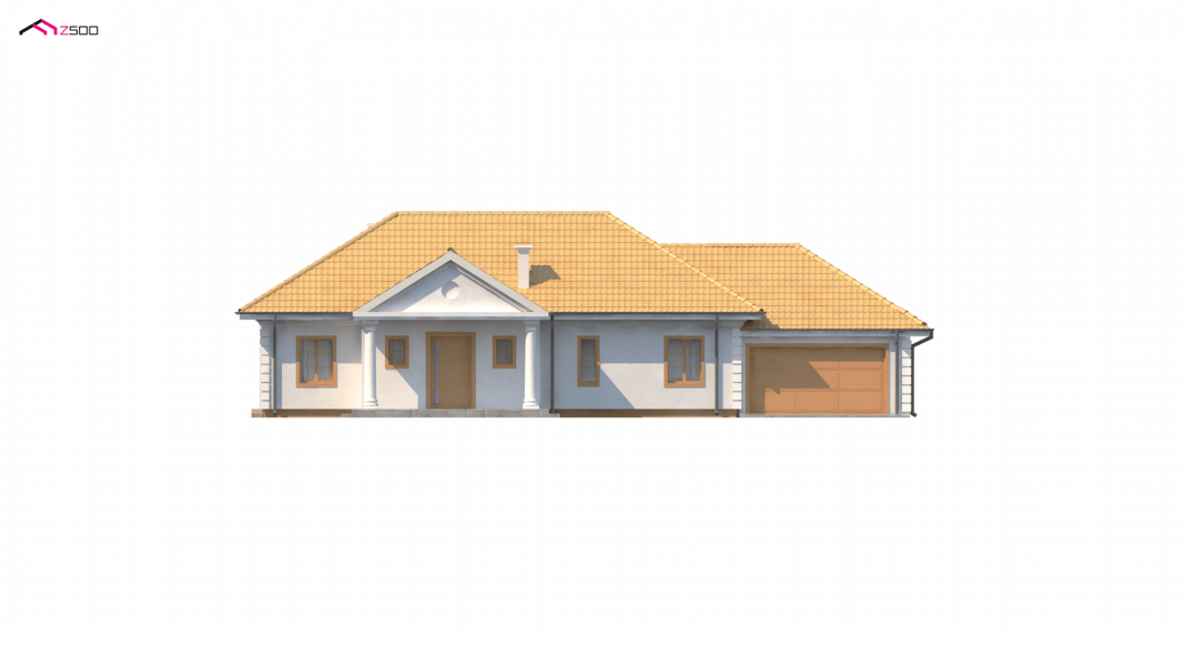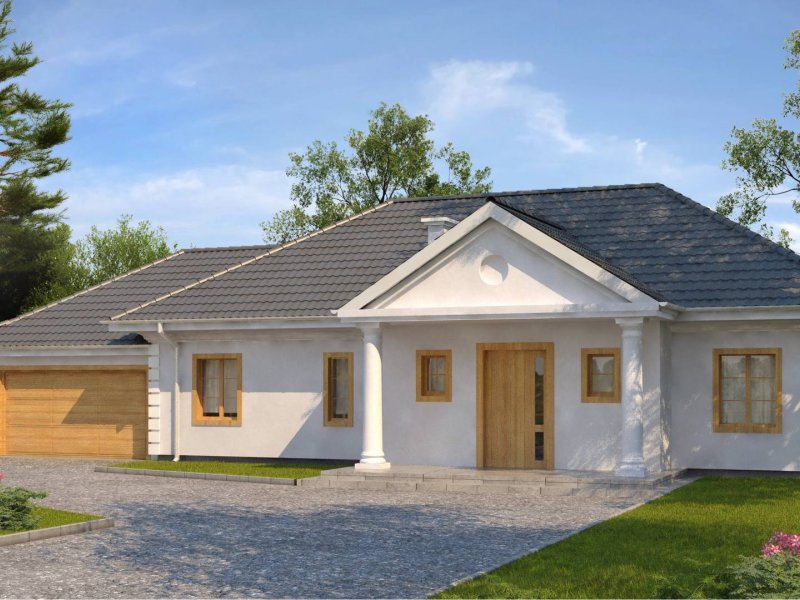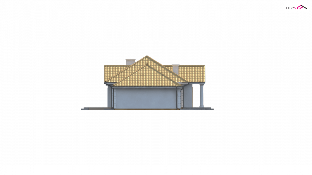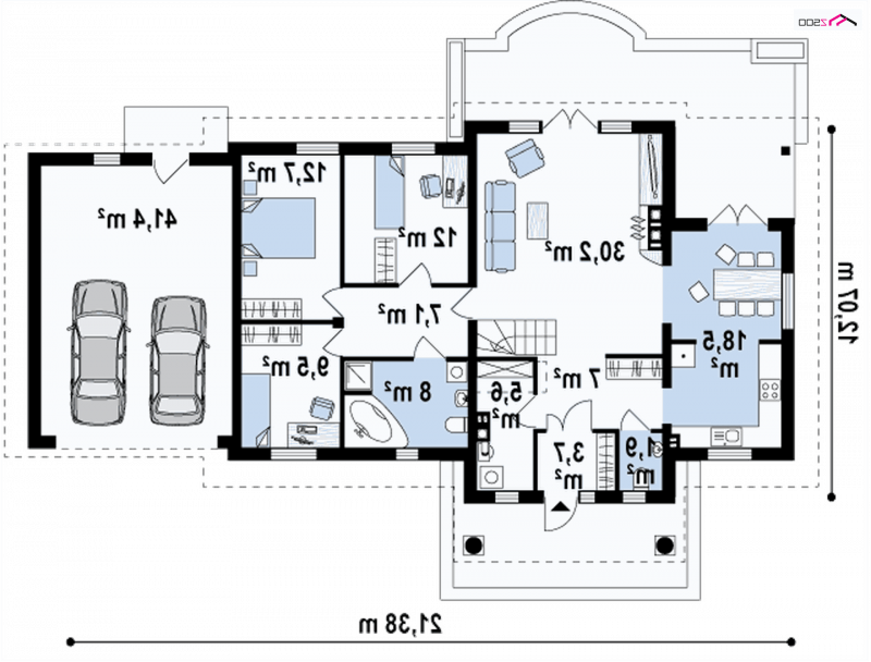 Projekt Z2 w odbiciu lustrzanym, z dwustanowiskowym garażem. Dodatkowo został powiększony (na szerokości) o ok 100cm w obrębie łazienki i pokoju.