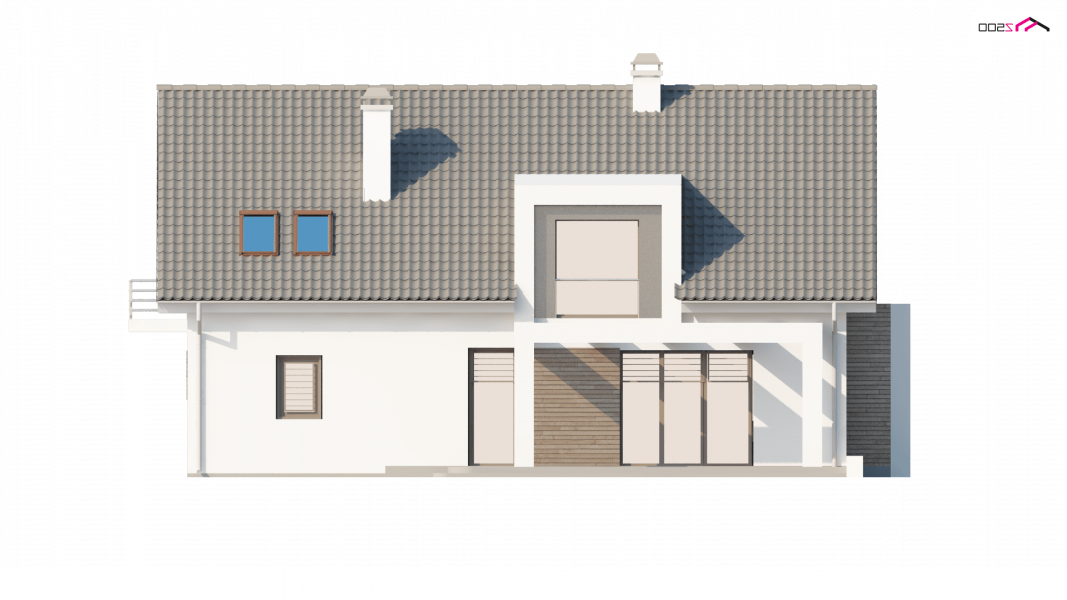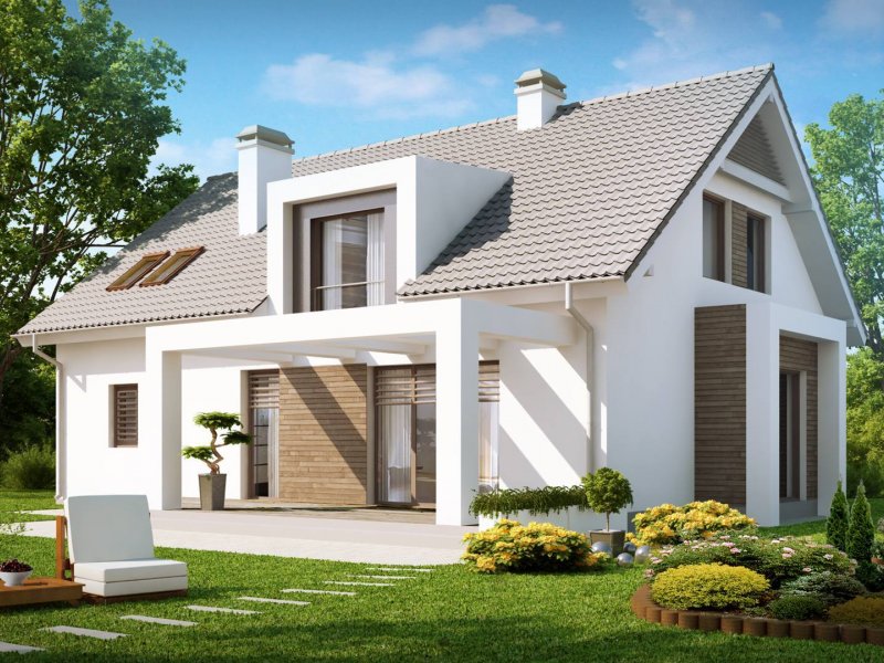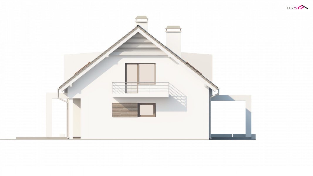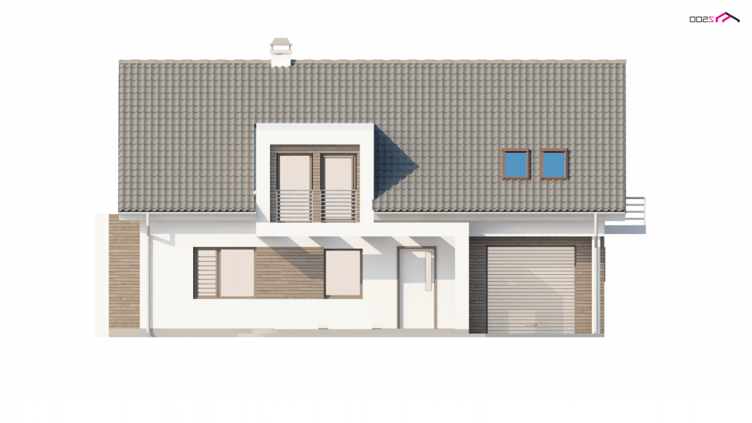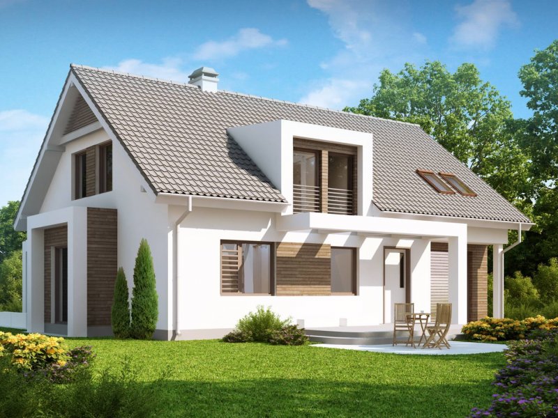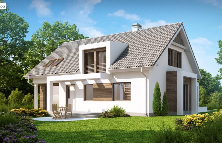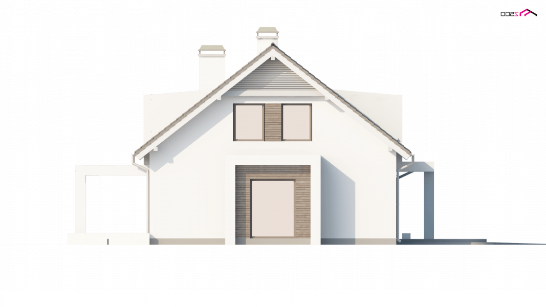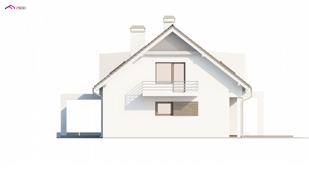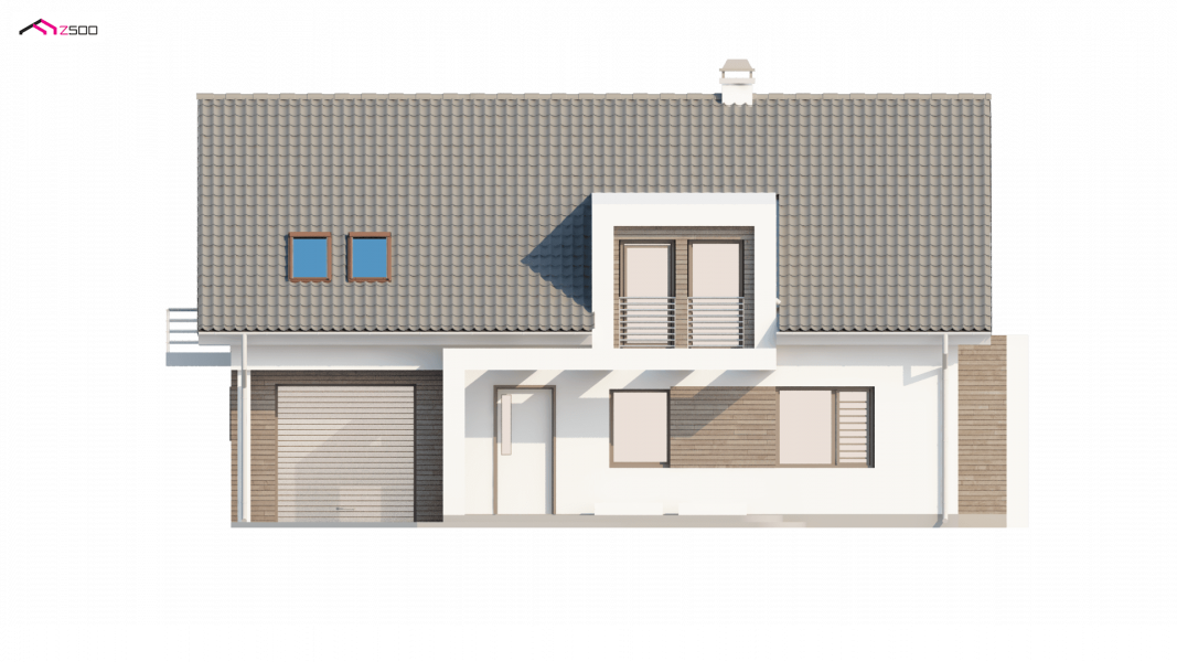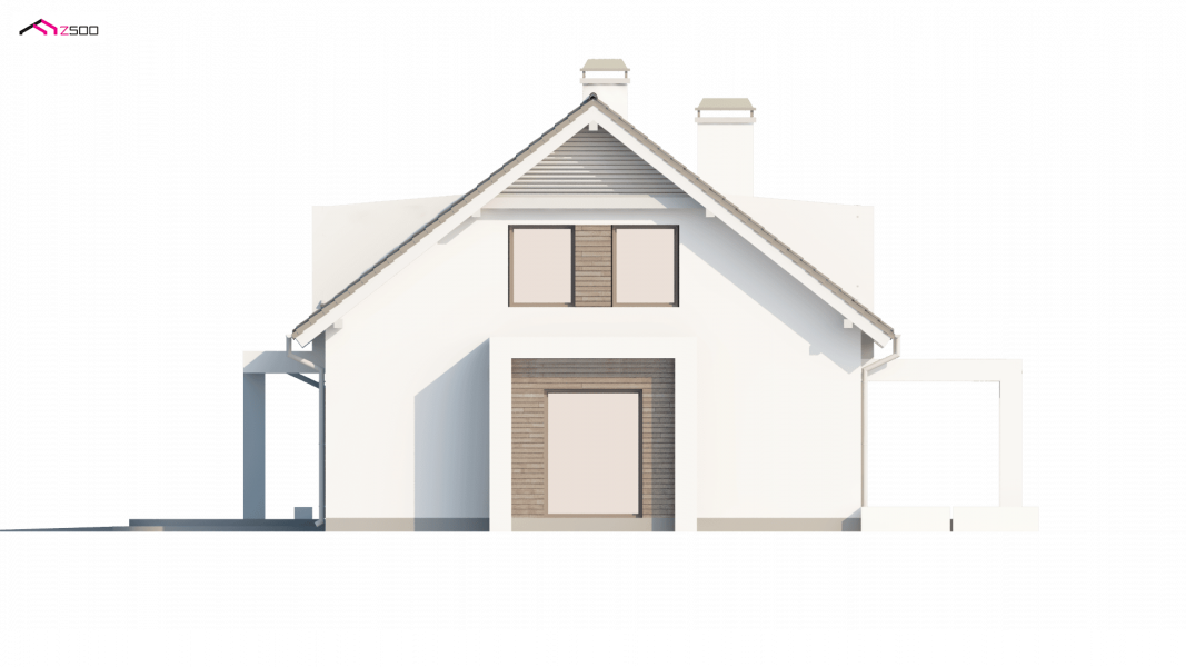 Projekt Z236 to dom jednorodzinny z poddaszem użytkowym i garażem jednostanowiskowym. Brązowa dachówka i drewniane elementy elewacji doskonale współgrają z jasnymi barwami ścian i tradycyjną bryłą domu.
