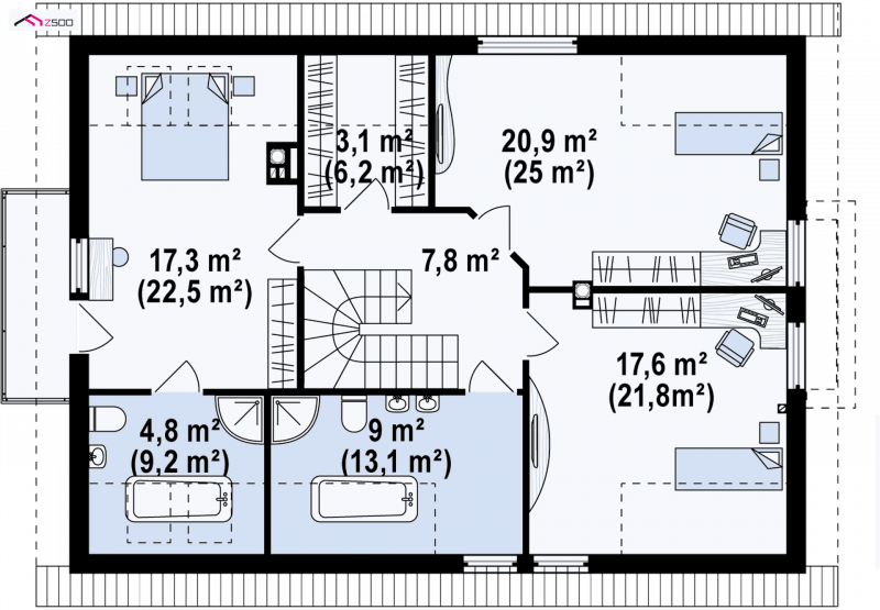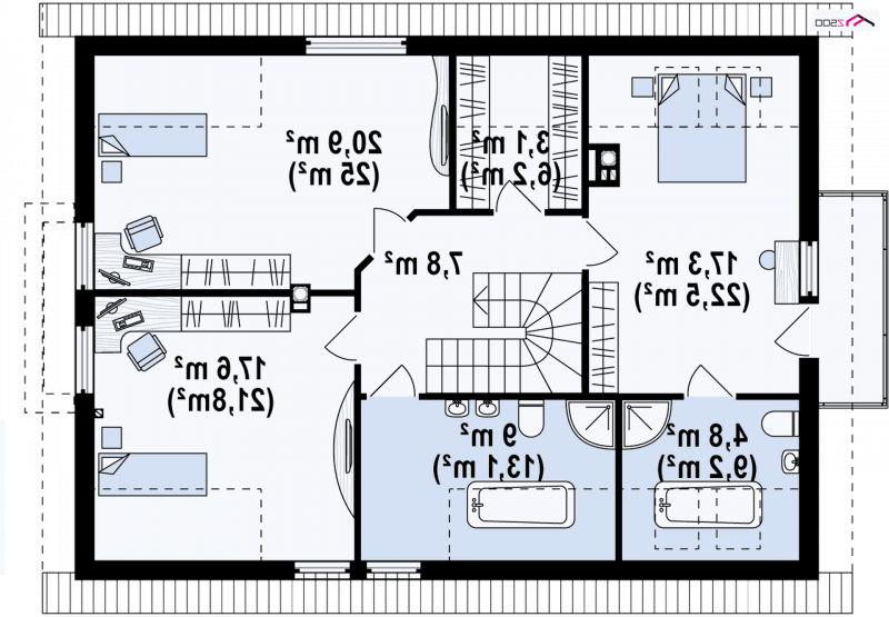 Poddasze to trzy duże, wygodne sypialnie, w tym jedna z własną łazienką i wyjściem na balkon, z którego jest widok na ogród. Garderoba pomieści szafy na ubrania i buty oraz pomocnicze urządzenia gospodarcze. Łazienka jest doświetlona oknem z lukarny, która powiększa przestrzeń użytkową pomieszczenia.