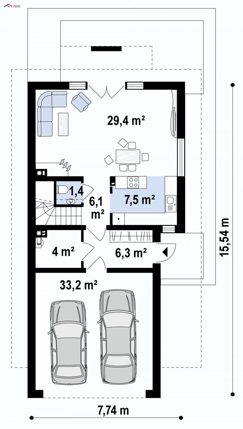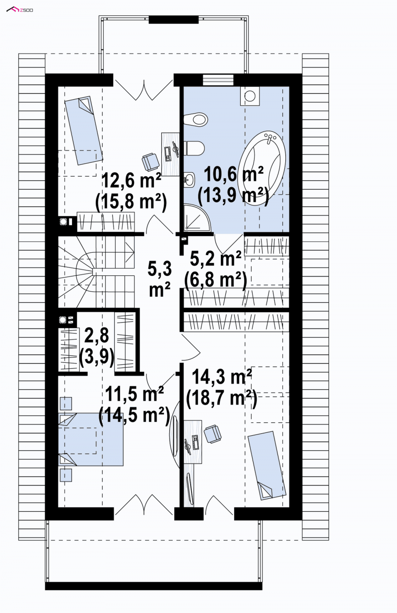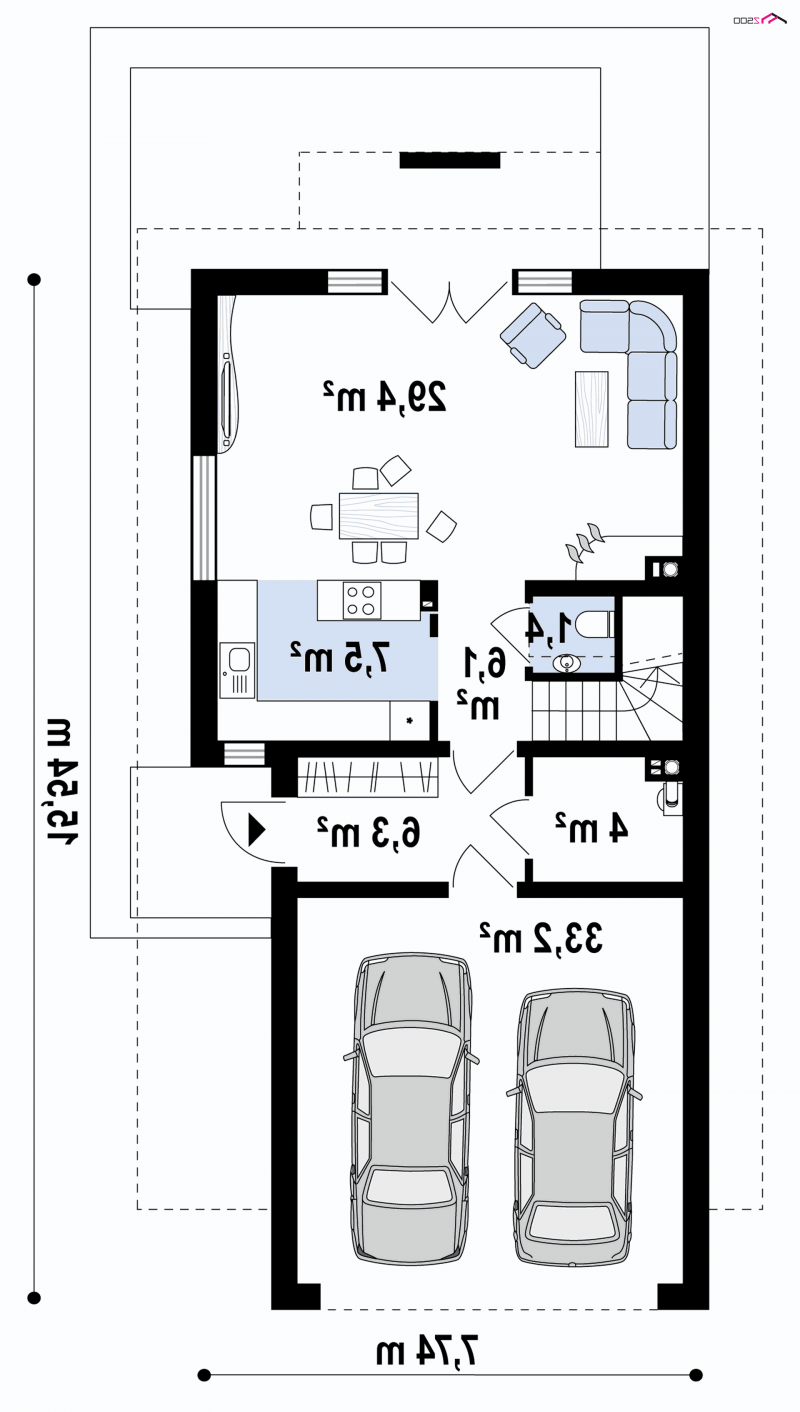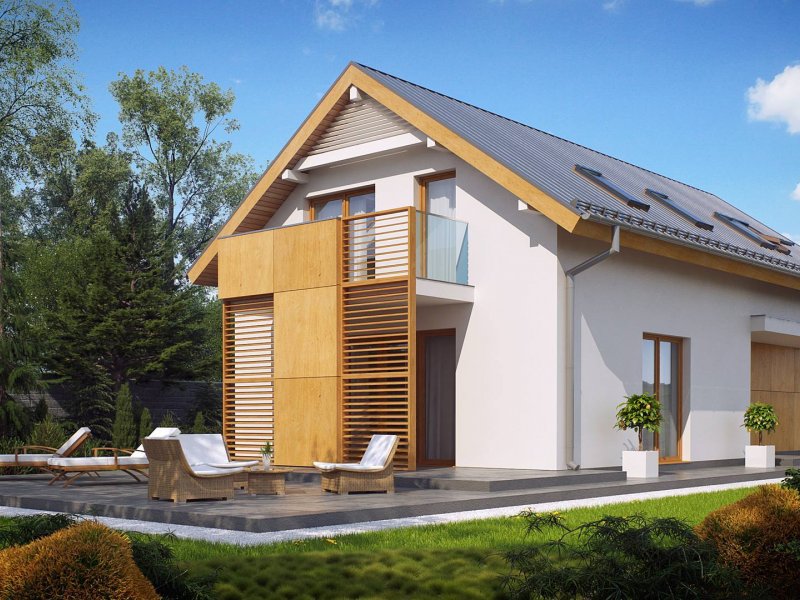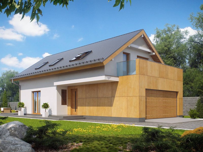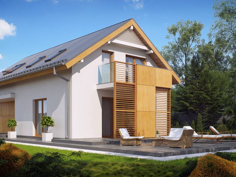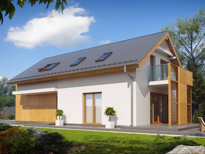 Z292 jest domem jednorodzinnym pasującym na wąską działkę, parterowym z poddaszem użytkowym z garażem dwustanowiskowym od frontu. Prosta bryła domu o nieskomplikowanej konstrukcji przykryta dwuspadowym dachem pozwoli na szybką i niedrogą budowę oraz późniejszą eksploatację. Formę domu urozmaica wysunięty z przedniej części garaż, nad którym zaprojektowano balkon, oraz zadaszenia wejścia głównego oraz tarasu. Jasną, stonowaną kolorystykę ozdabiają drewniane płyty elewacyjne oraz ażurowe kolumny "podtrzymujące" zadaszenie nad tarasem.