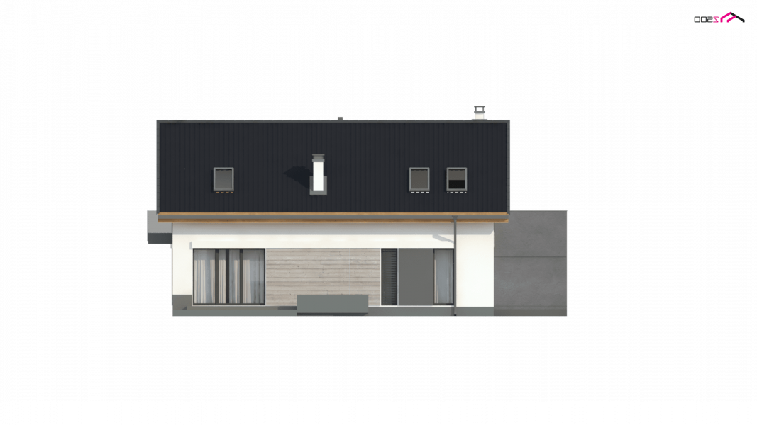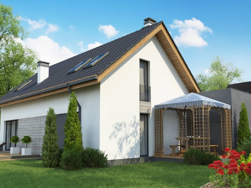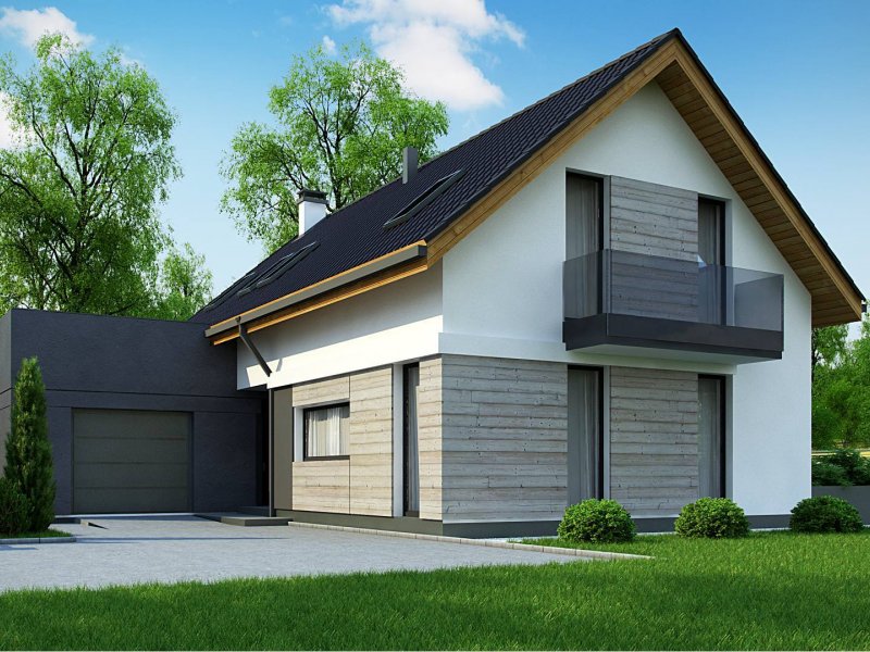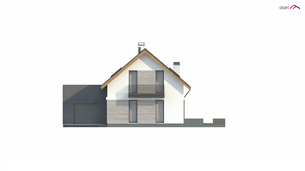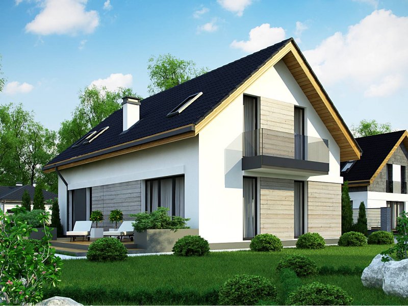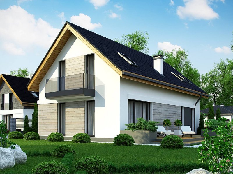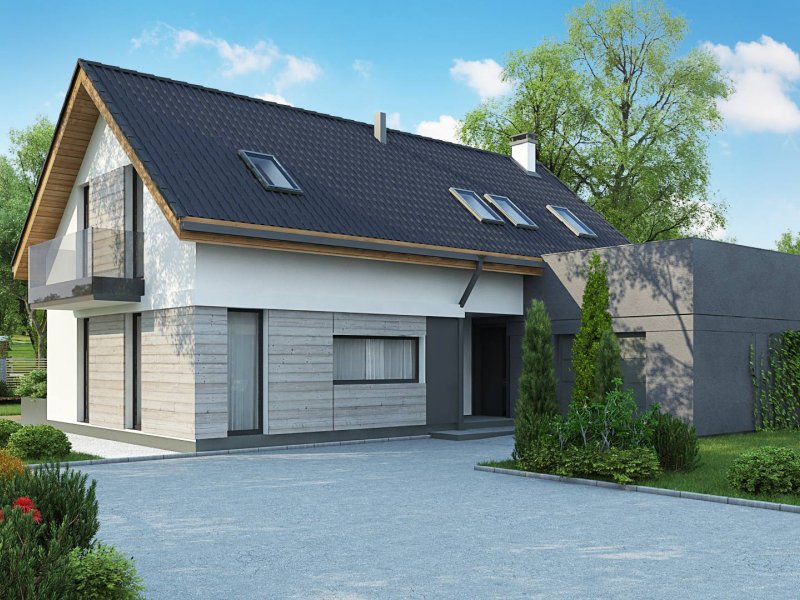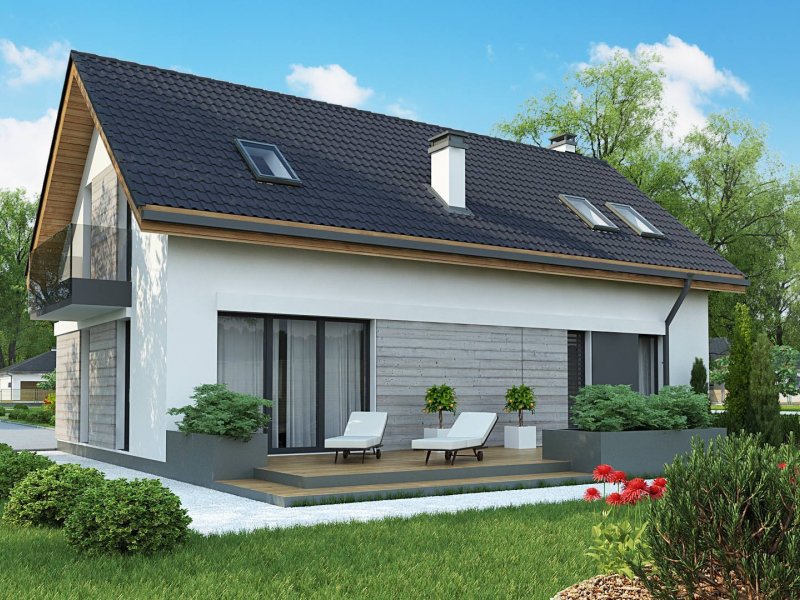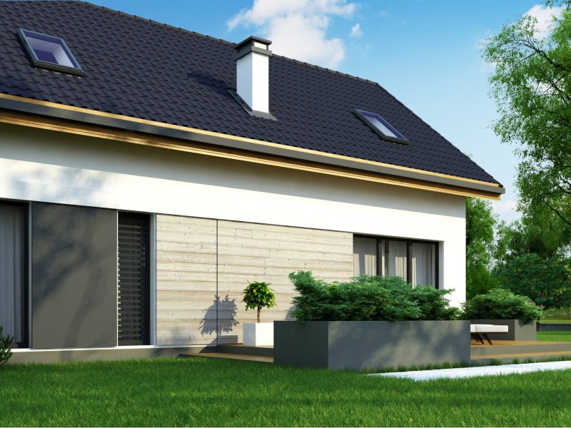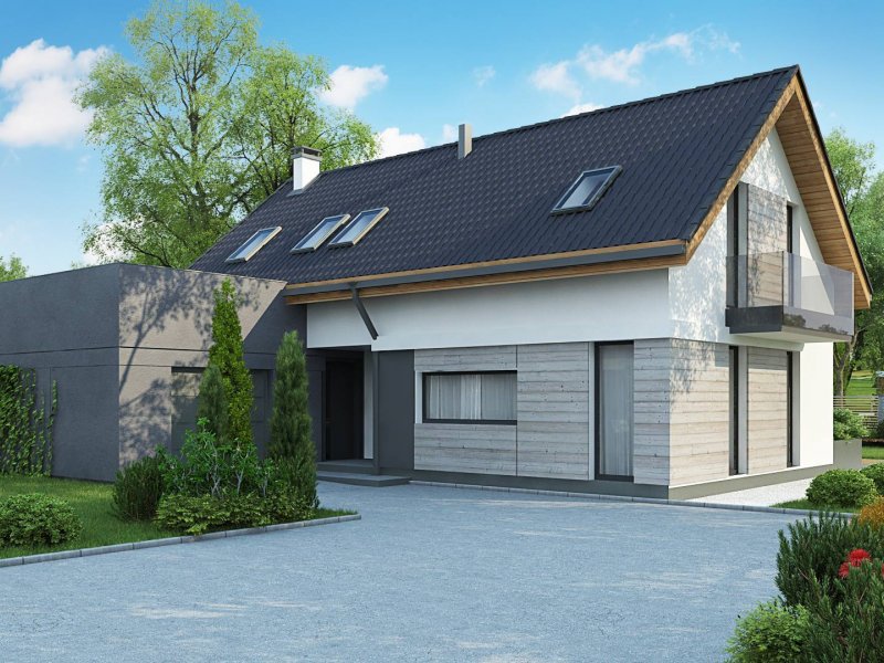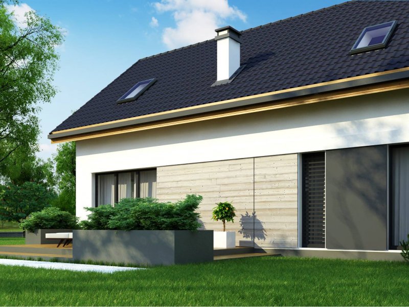 Połączenie śnieżnobiałego tynku, szarości i ozdobnych paneli drewnianych składa się na wykończenie elewacji. Okna dachowe na poddaszu użytkowym rozmieszczono w ten sposób, aby jak najbardziej doświetlały wnętrza i nadawały im przytulności.