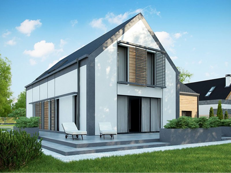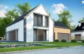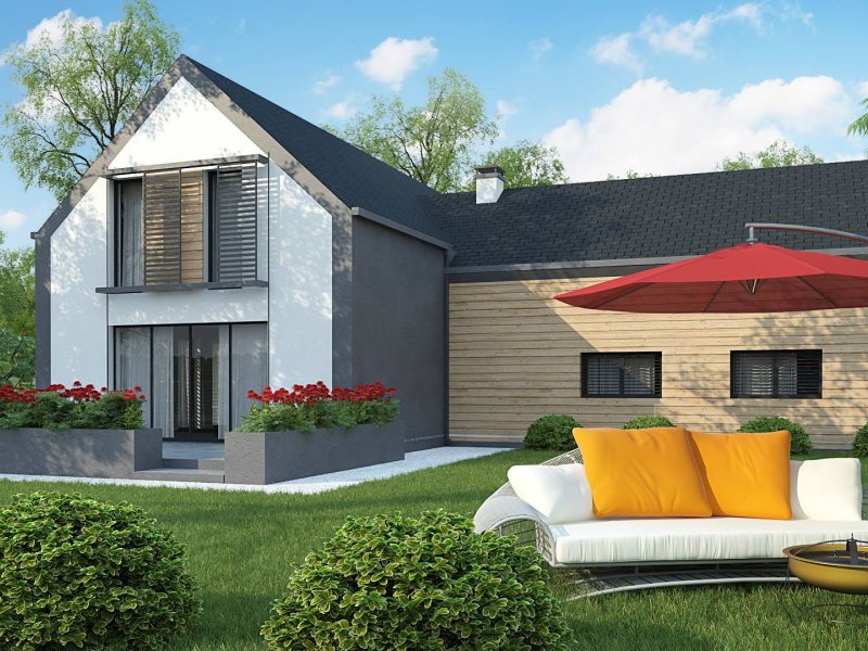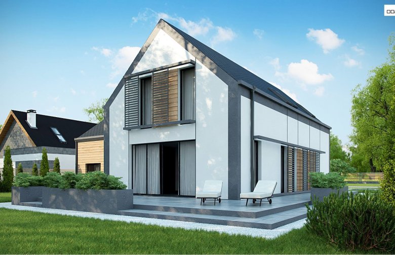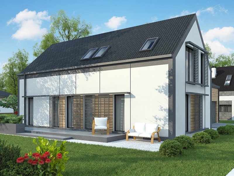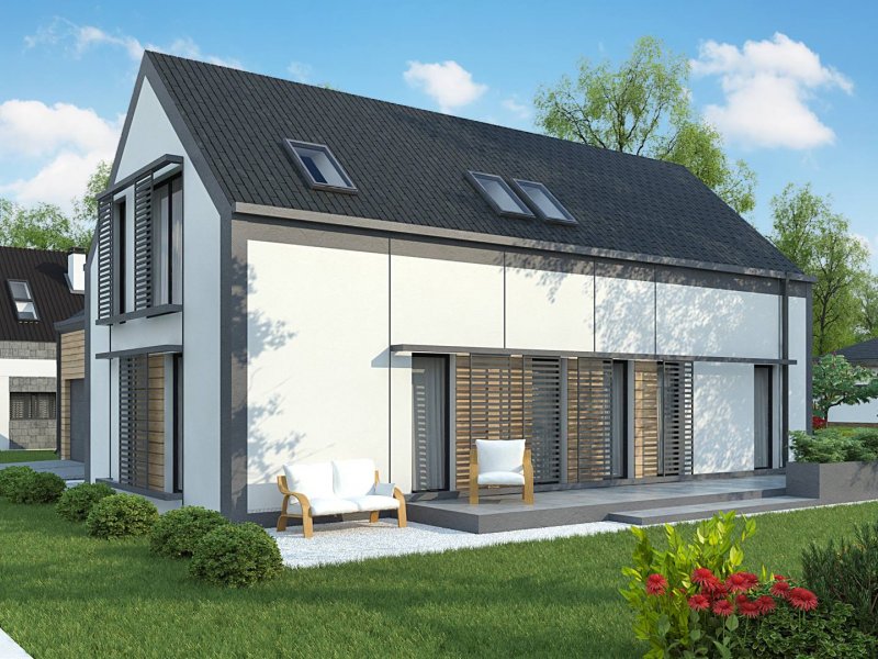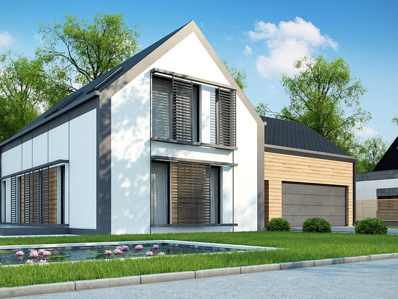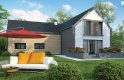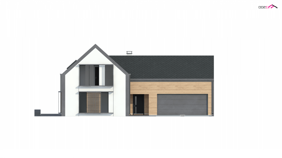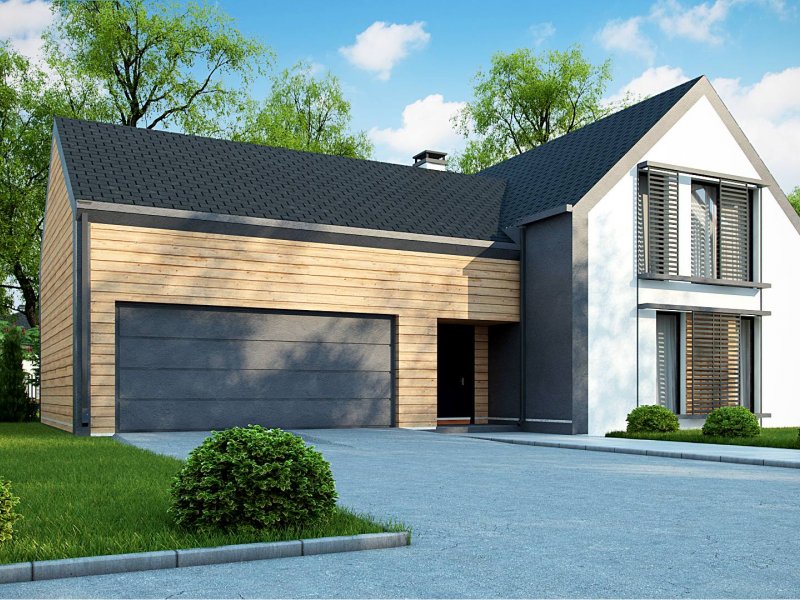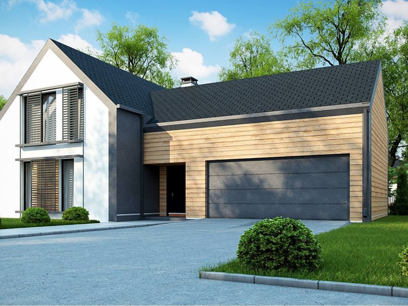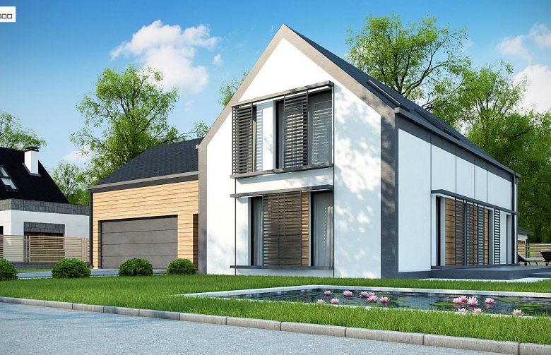 Dom jednorodzinny z poddaszem użytkowym, dwustanowiskowym garażem i dachem wielospadowym.