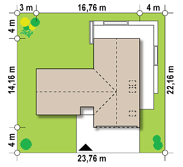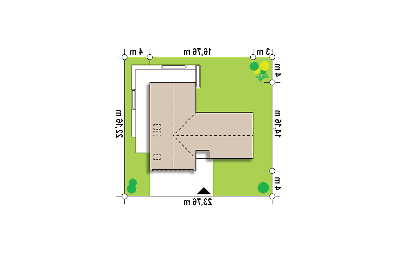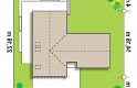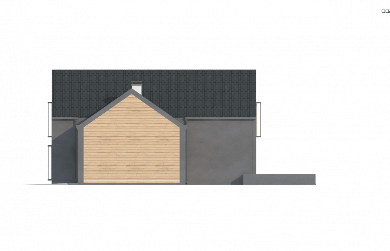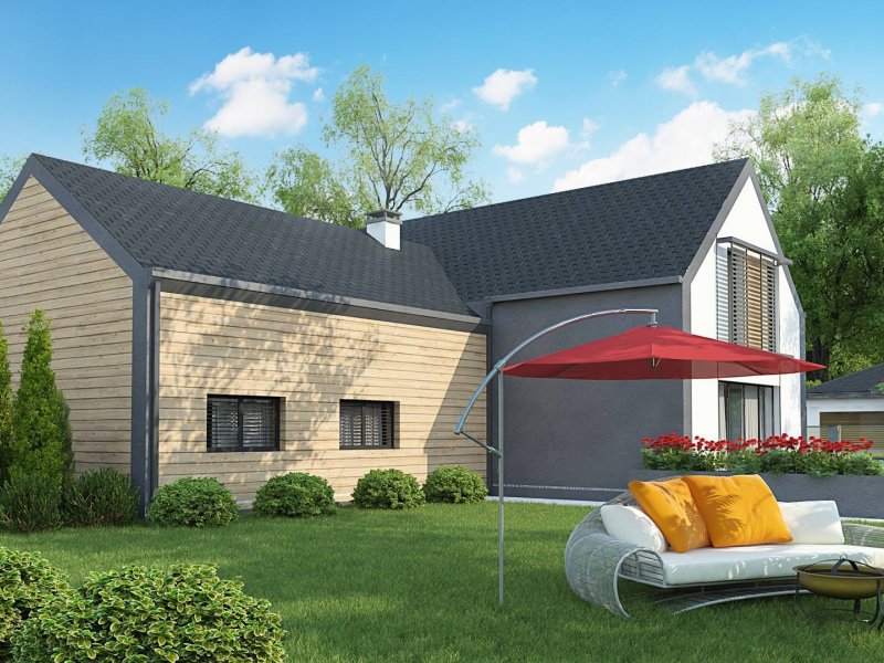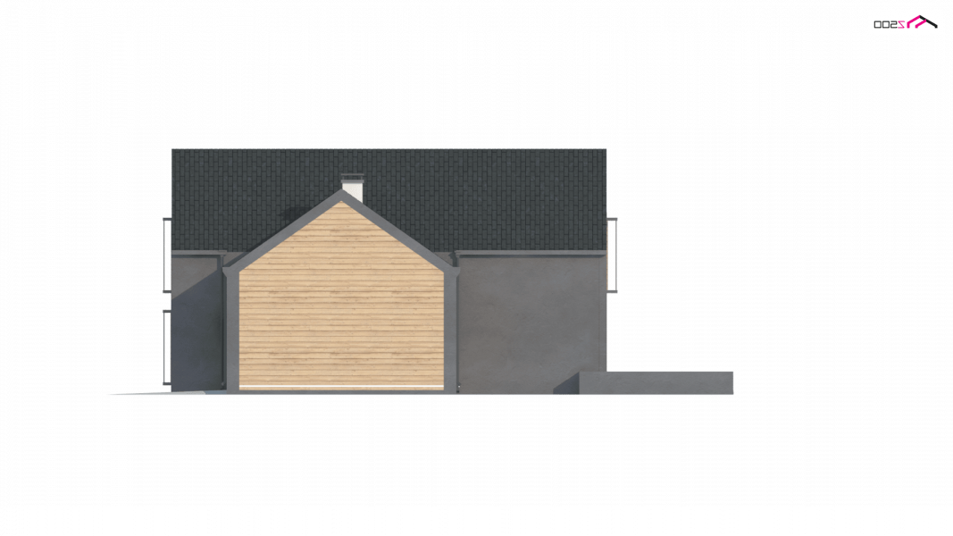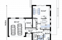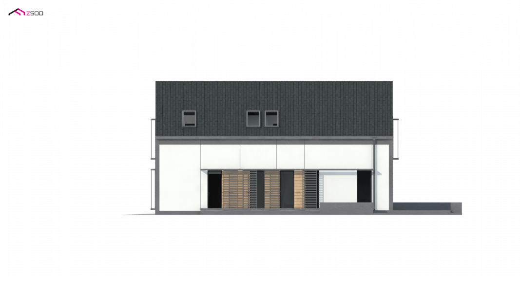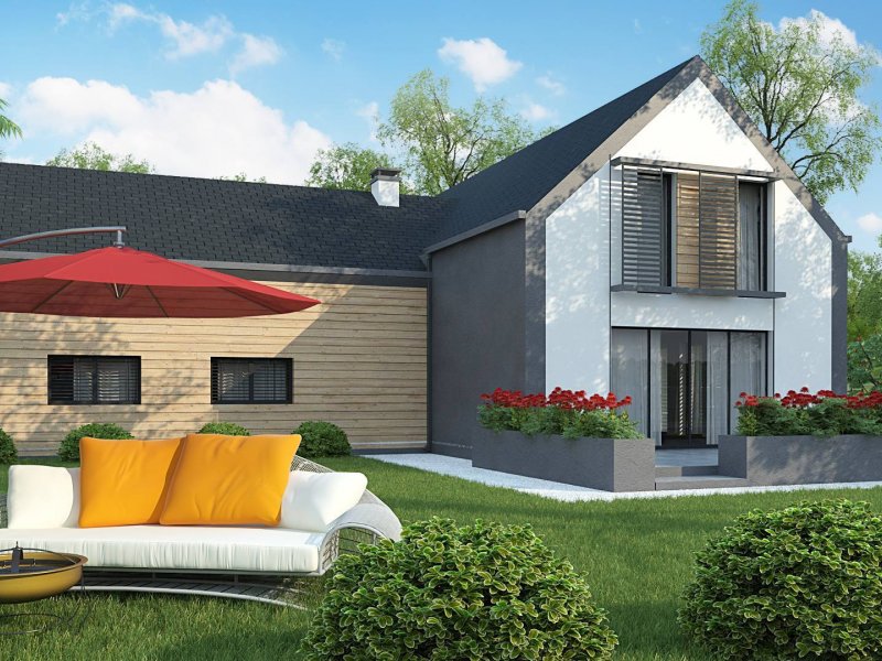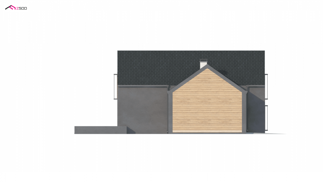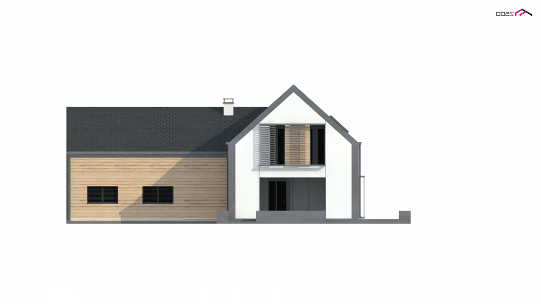 Dom jednorodzinny z poddaszem użytkowym, dwustanowiskowym garażem i dachem wielospadowym.
