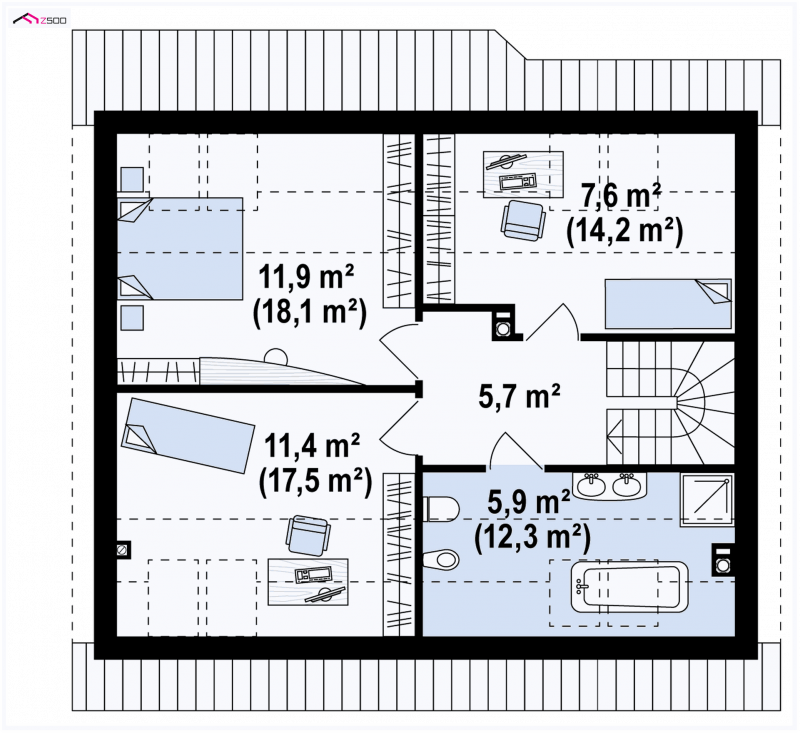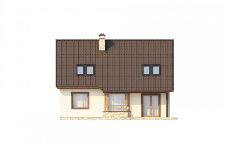 Na poddaszu usytuowano trzy wygodne sypialnie oraz sporą łazienkę. Pokoje na poddaszu można doświetlić oknami w ścianach szczytowych lub oknami połaciowymi w przypadku konieczności zbliżenia się do granicy działki sąsiedniej.