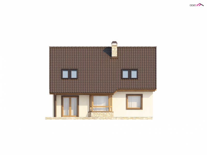 Wejście do budynku zlokalizowane w centralnym miejscu elewacji frontowej jest zadaszone. Na osi wejścia zaprojektowano salon, który jest miejscem reprezentacyjnym domu. Część dzienną ożywia otwarcie w stronę ogrodu poprzez taras i wykusz, doskonale doświetlający wnętrze. Na prawo od wejścia zaprojektowano schody na poddasze. Po jednej stronie schodów umieszczono gabinet, na wprost niego łazienkę z prysznicem oraz pomieszczenie gospodarcze z pralnią.