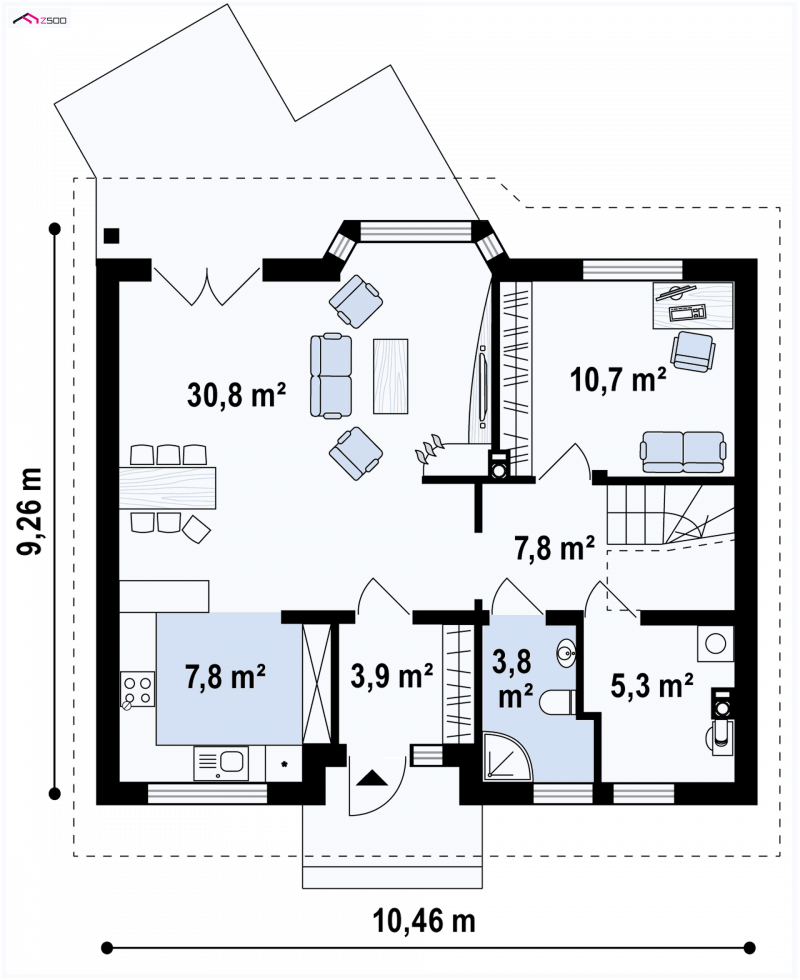 Projekt Z40 spodoba się tym, którzy szukają domu małego, taniego, funkcjonalnego, bardzo prostego w budowie, a zarazem atrakcyjnego. Pomieszczenia zostały usytuowane na planie zbliżonym do kwadratu, co daje jasny i czytelny układ wnętrza.