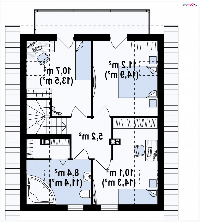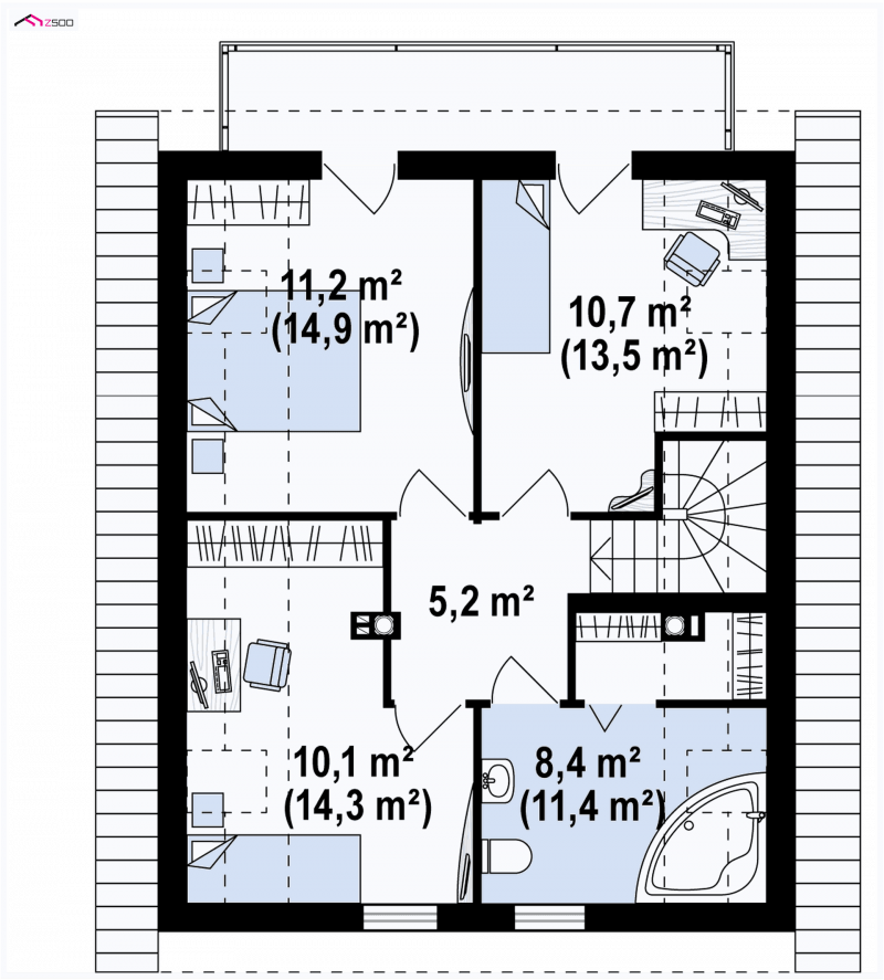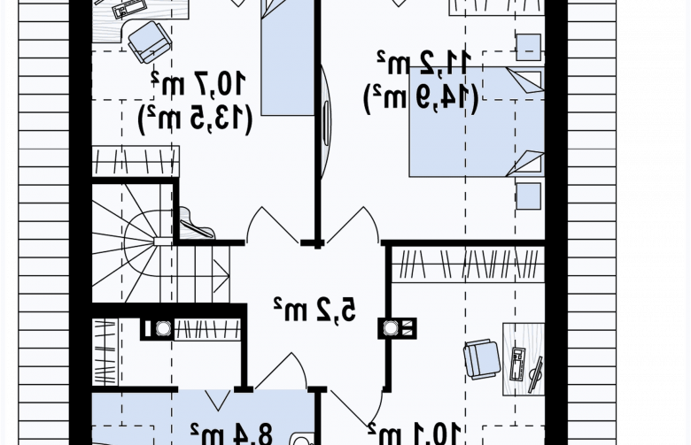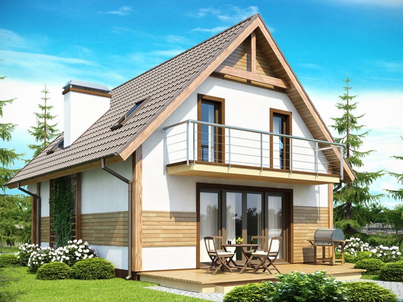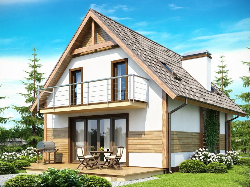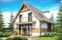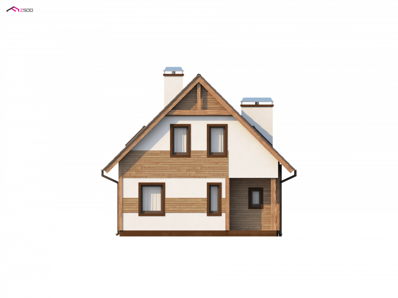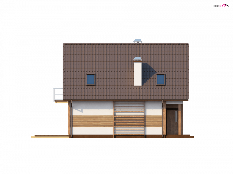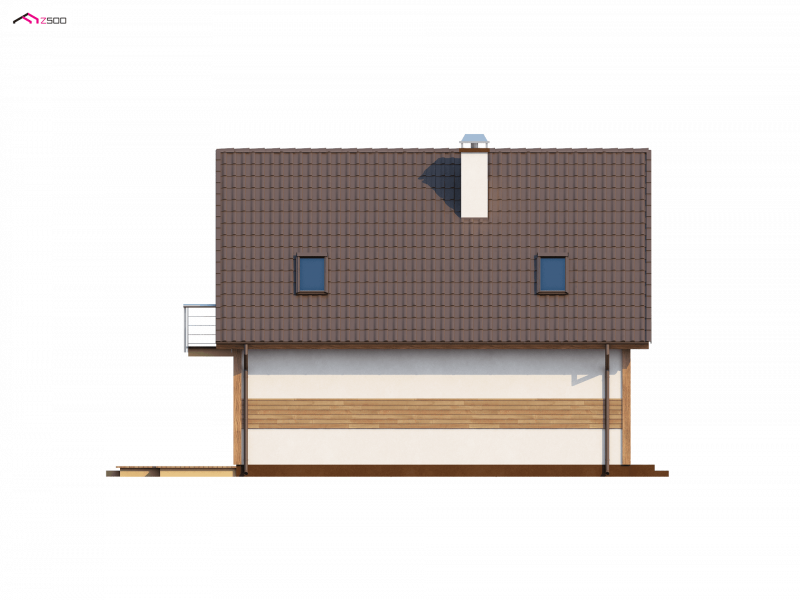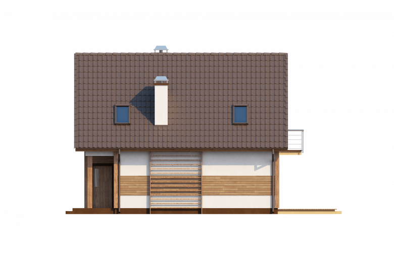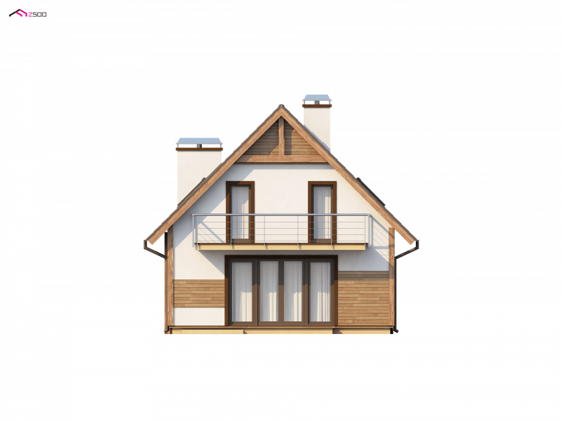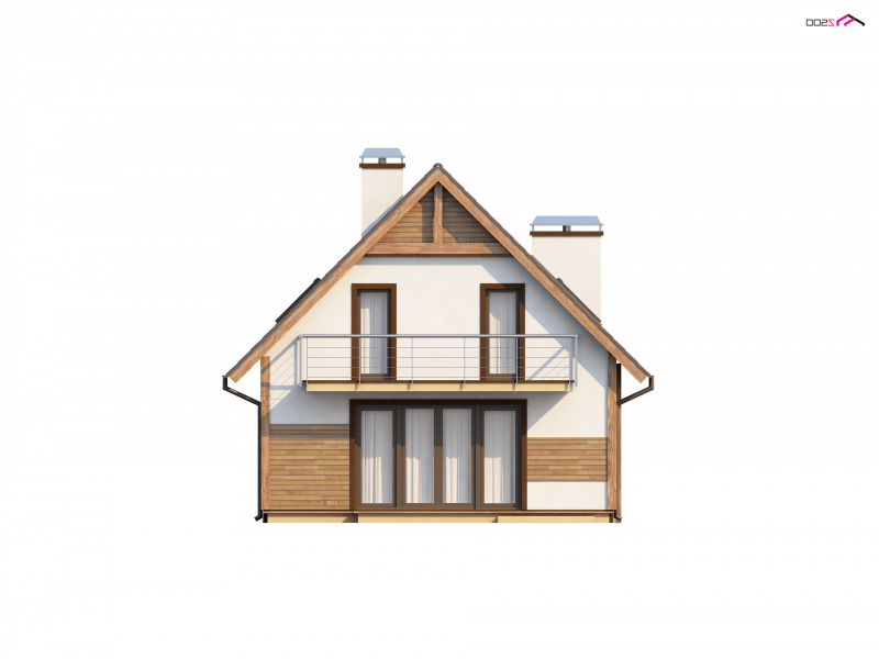 Dodatkowym atutem parteru jest centralnie umieszczony kominek, który nadaje uroku oraz rozgrzewa atmosferę domu. Ciekawym rozwiązaniem tego projektu jest wykończenie elewacji elementami z drewna (opcja). Na poddaszu znajduje się strefa nocna czyli 3 duże sypialnie z wyjściem na balkon jak również łazienka z niewielką garderobą.