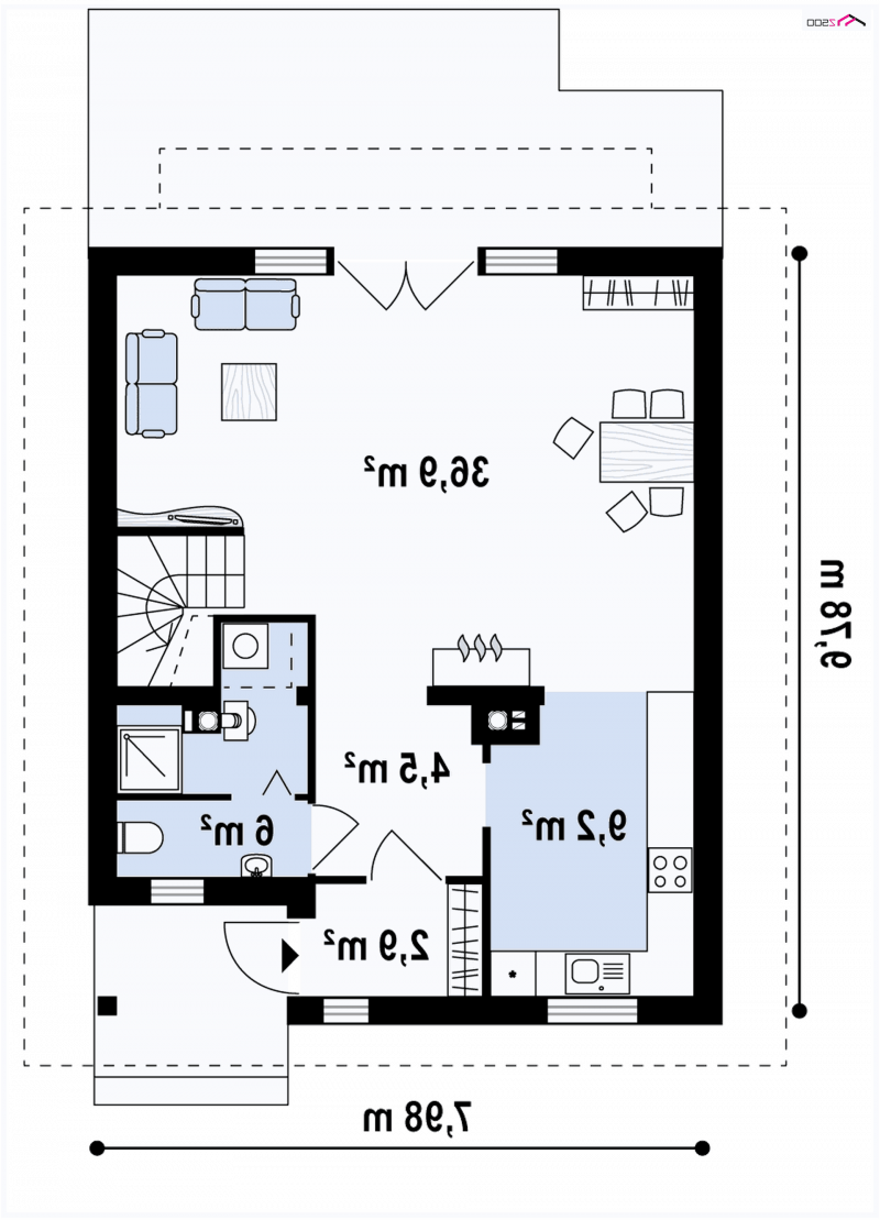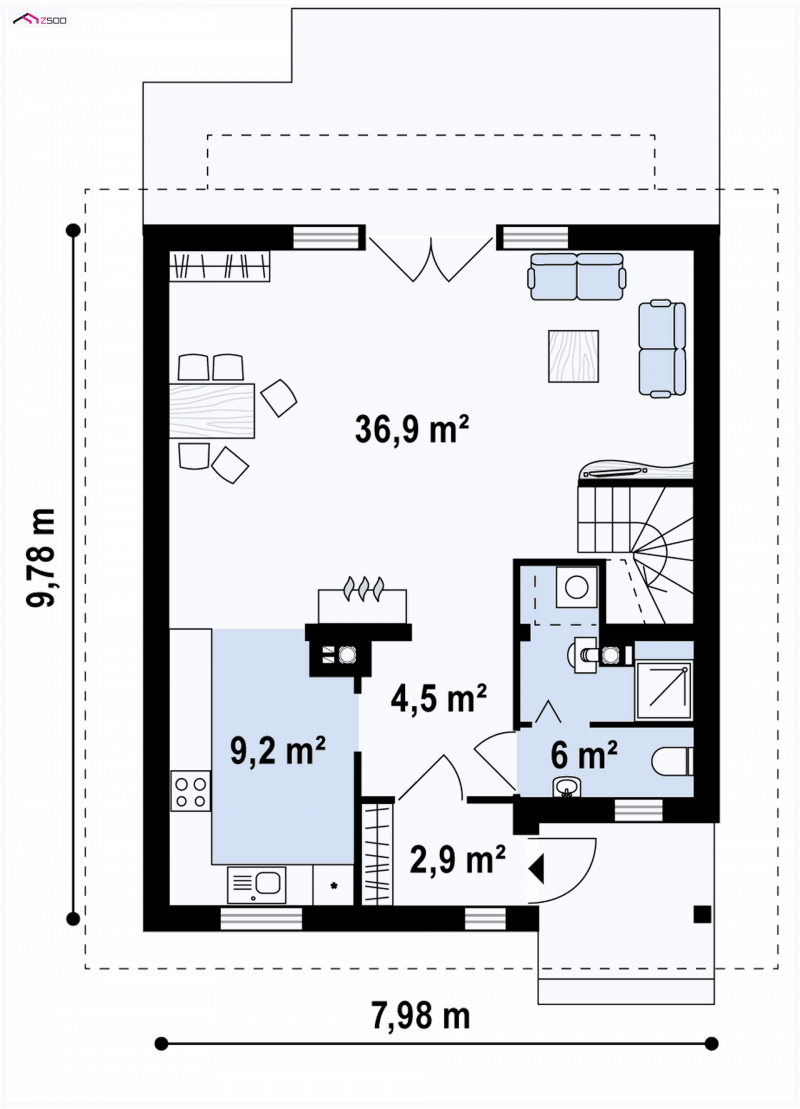 Prezentowany dom Z45 jest prosty i tani w budowie, przewidziany na stosunkowo wąską działkę. Od frontu, bryłę budynku urozmaica podcień nad wejściem. Wnętrze domu zaplanowane jest w sposób logiczny i zarazem współczesny. Na parterze zaprojektowano sień, łazienkę z częścią gospodarczą, kuchnię oraz pokój dzienny połączony z jadalnią. Z pokoju dziennego jest możliwość wyjścia na taras, który osłonięty jest częściowo przez balkon.