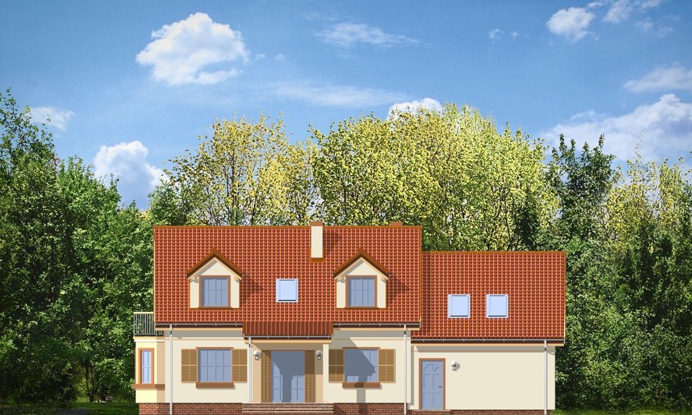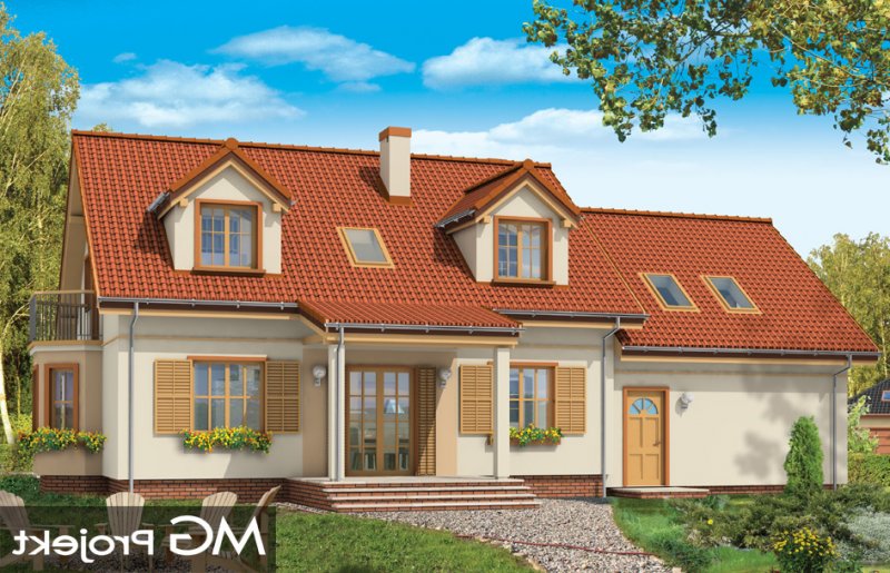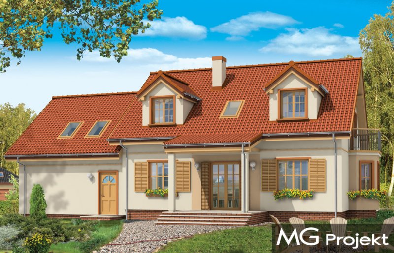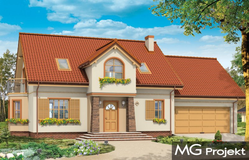 Zgrabny 5 to kolejna odsłona jednego z najpopularniejszych projektów pracowni MG Projekt, domu Zgrabny. Projekt ten posiada dwustanowiskowy garaż i rozbudowaną część mieszkalną. Na parterze zaprojektowano salon z aneksem jadalnym i kuchnią, oraz dodatkowy pokój - sypialnia lub gabinet. Na poddaszu znajdują się trzy przestronne sypialnie z łazienką, oraz duże pomieszczenie uniwersalne nad garażami. W projekcie dzięki podniesieniu ścian kolankowych poddasza pokoje są większe. Lukarny umożliwiły umieszczenie okien w każdym z pokoi. Dom stanowi rozsądną propozycję dla rodziny 4-6 osobowej. Można również zamieszkać w tym domu z dziadkami. Duży garaż wraz z pomieszczeniem gospodarczym to dodatkowy atut projektu. Projekt można również zamówić w wersji odbicia lustrzanego.