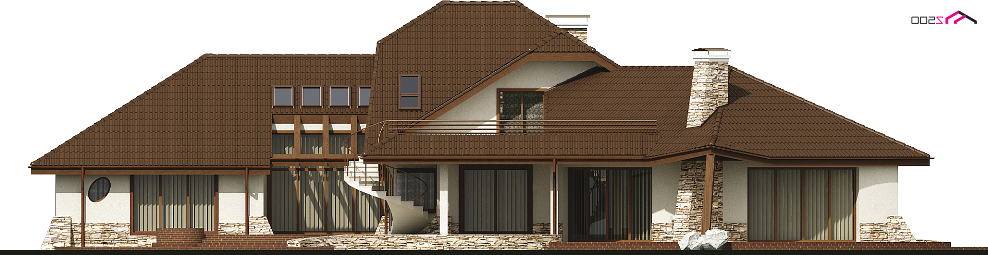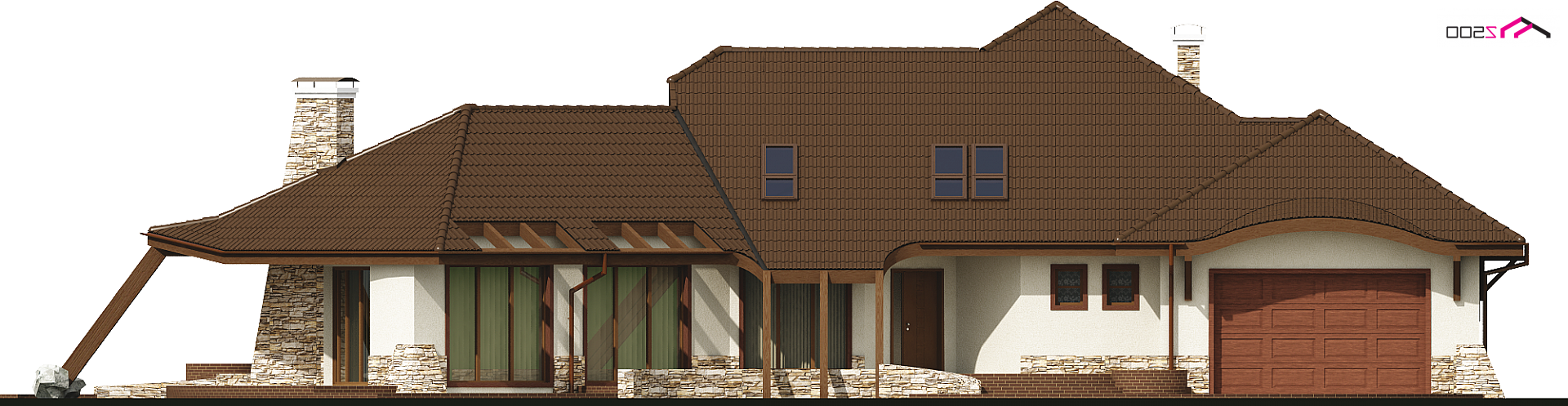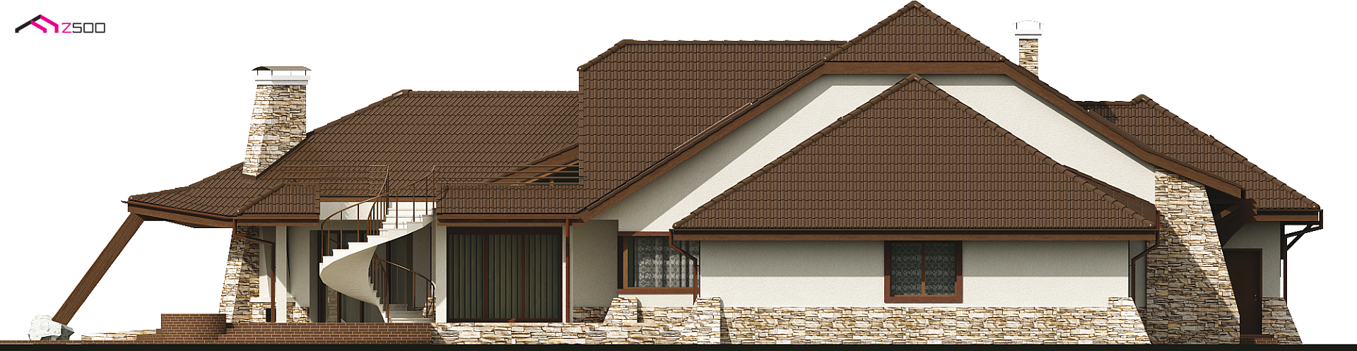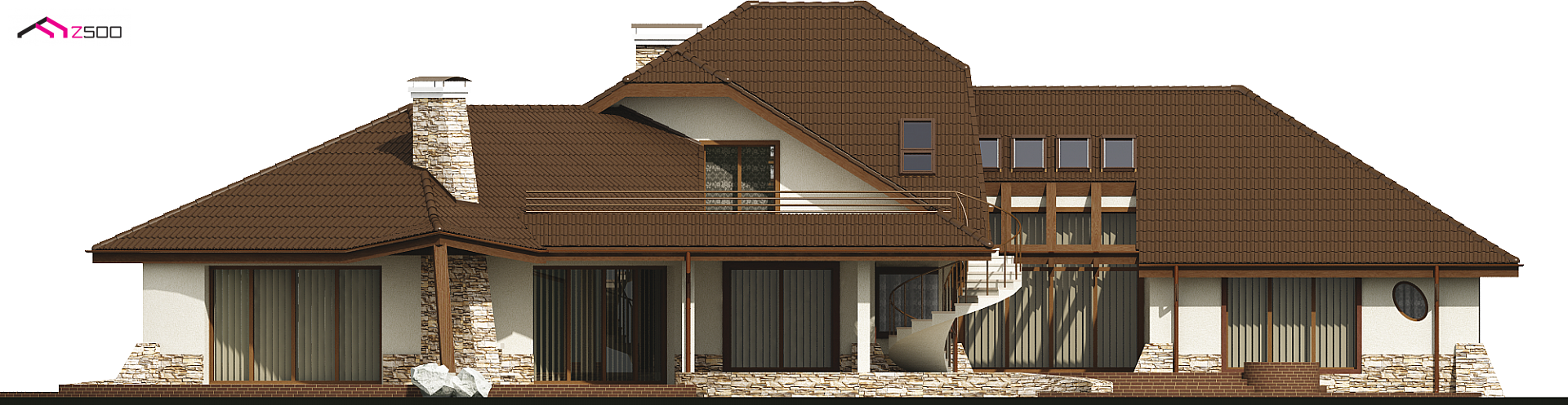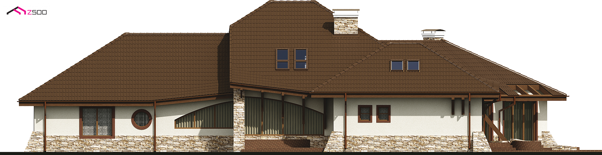 Projekt Zr1 jest rozłożystą rezydencją, która idealnie pasuje do dużych, zielonych przestrzeni. Architektura budynku i elewacje zewnętrzne bogate są w detale z drewna i kamienia. Bryła budynku łagodnie wtapia się w środowisko i w okoliczną przyrodę. Sekretem oryginalności i wyjątkowości elewacji są idealnie dobrane proporcje poszczególnych fragmentów domu oraz spójność wykorzystanych materiałów i dodatków. Bryła tej rezydencji dopracowana jest w najdrobniejszym szczególe z każdej strony. Dom prezentuje się fantastycznie od frontu, od ulicy czy wjazdu, jak również od ogrodu, gdzie znajdują się także zewnętrzne kręcone schody, prowadzące na taras.