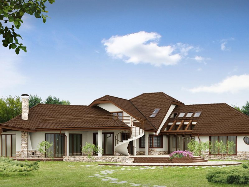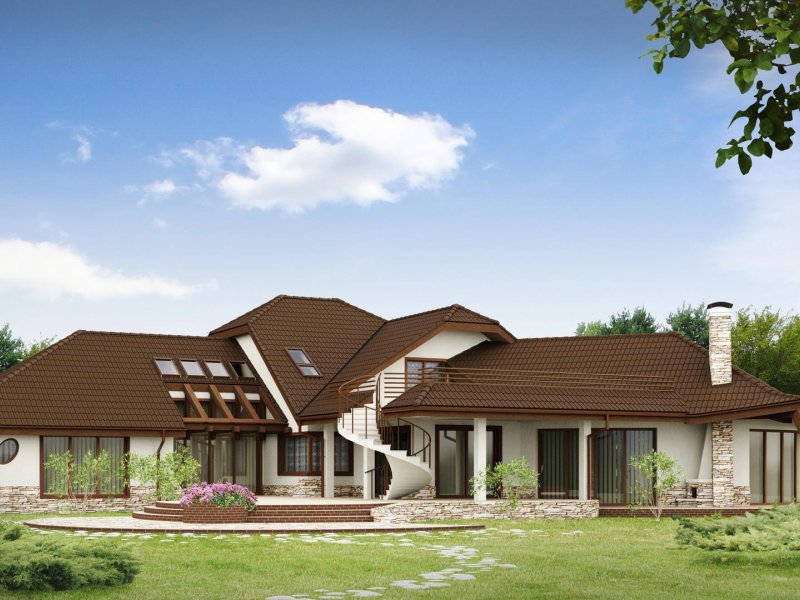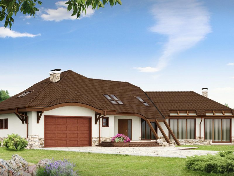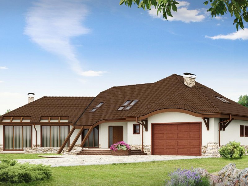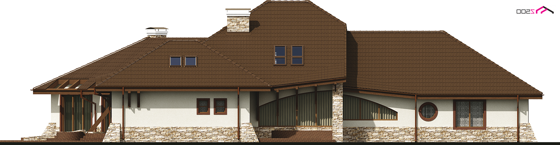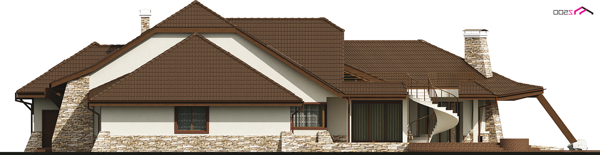 Projekt Zr1 jest rozłożystą rezydencją, która idealnie pasuje do dużych, zielonych przestrzeni. Architektura budynku i elewacje zewnętrzne bogate są w detale z drewna i kamienia. Bryła budynku łagodnie wtapia się w środowisko i w okoliczną przyrodę. Sekretem oryginalności i wyjątkowości elewacji są idealnie dobrane proporcje poszczególnych fragmentów domu oraz spójność wykorzystanych materiałów i dodatków. Bryła tej rezydencji dopracowana jest w najdrobniejszym szczególe z każdej strony. Dom prezentuje się fantastycznie od frontu, od ulicy czy wjazdu, jak również od ogrodu, gdzie znajdują się także zewnętrzne kręcone schody, prowadzące na taras.
