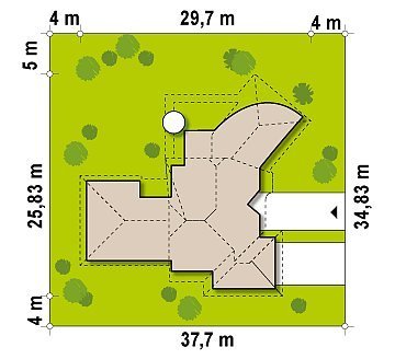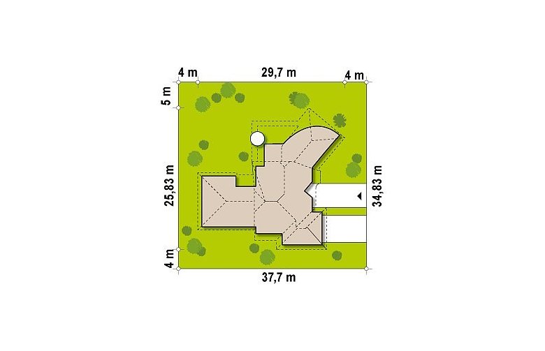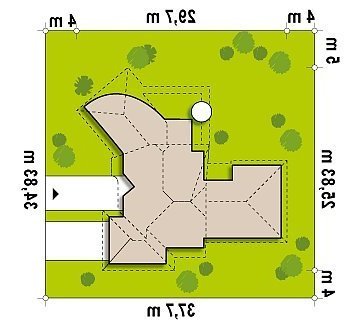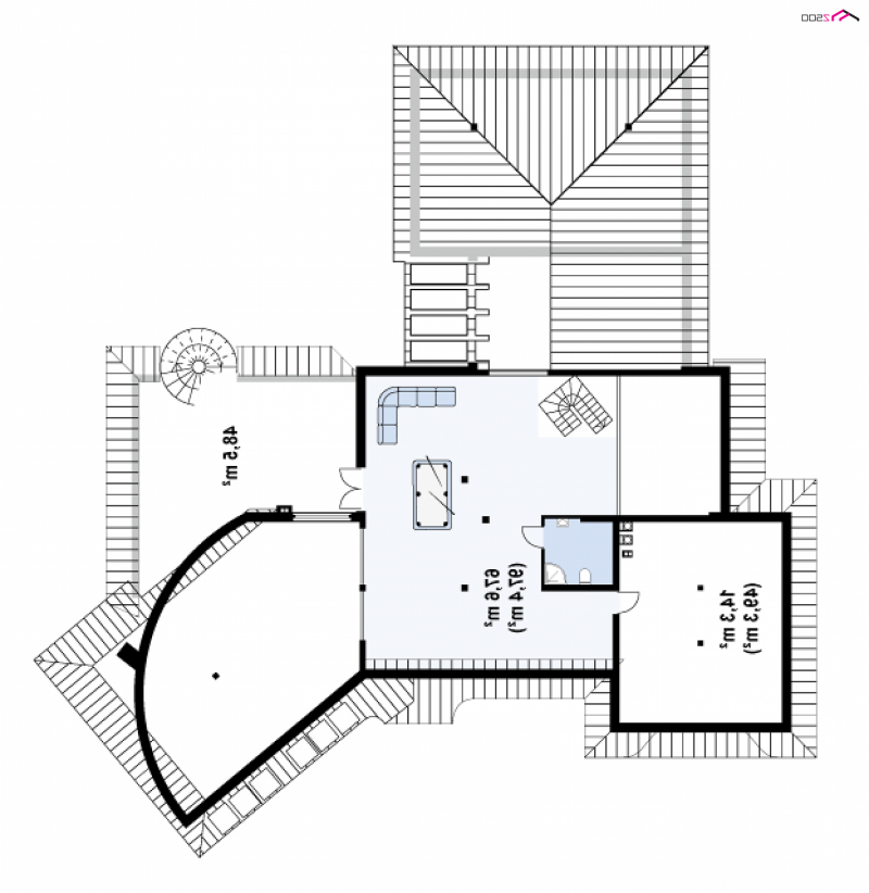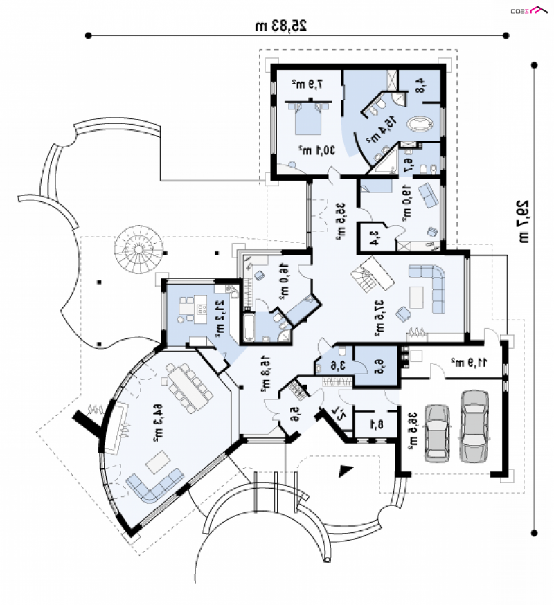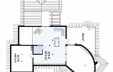 Nowoczesność i indywidualizm tego projektu połączono z tradycyjnym wnętrzem, dzieląc je na strefy: dzienną, nocną, rekreacyjną oraz gospodarczą. Najbliżej wejścia głównego znajduje się strefa gospodarcza z garderobą, schowkami, pralnią oraz korytarzem prowadzącym do dwustanowiskowego garażu. W garażu przewidziano obszerne pomieszczenie techniczno-gospodarcze z dostępem z zewnątrz.Centralnie umieszczony komin z pom. gospodarczego w sąsiedztwie kominka wewnętrznego - optymalnie rozwiązuje problem instalacji np. ogrzewania kominkowego lub „płaszcza wodnego” i wpłynie korzystnie na późniejsze koszty eksploatacji i ogrzewania. Strefę dzienną stanowi oryginalny salon, którego jedna ze ścian ma kształt łuku. Salon tworzy jedną wspólną przestrzeń z jadalnią, a w pobliżu znajduje się wydzielona kuchnia ze spiżarką.Strefa nocna znajduje się w „tylnym” skrzydle domu, są tam trzy pokoje z łazienkami oraz sala kominkowa z biblioteką i dużym przeszkleniem.