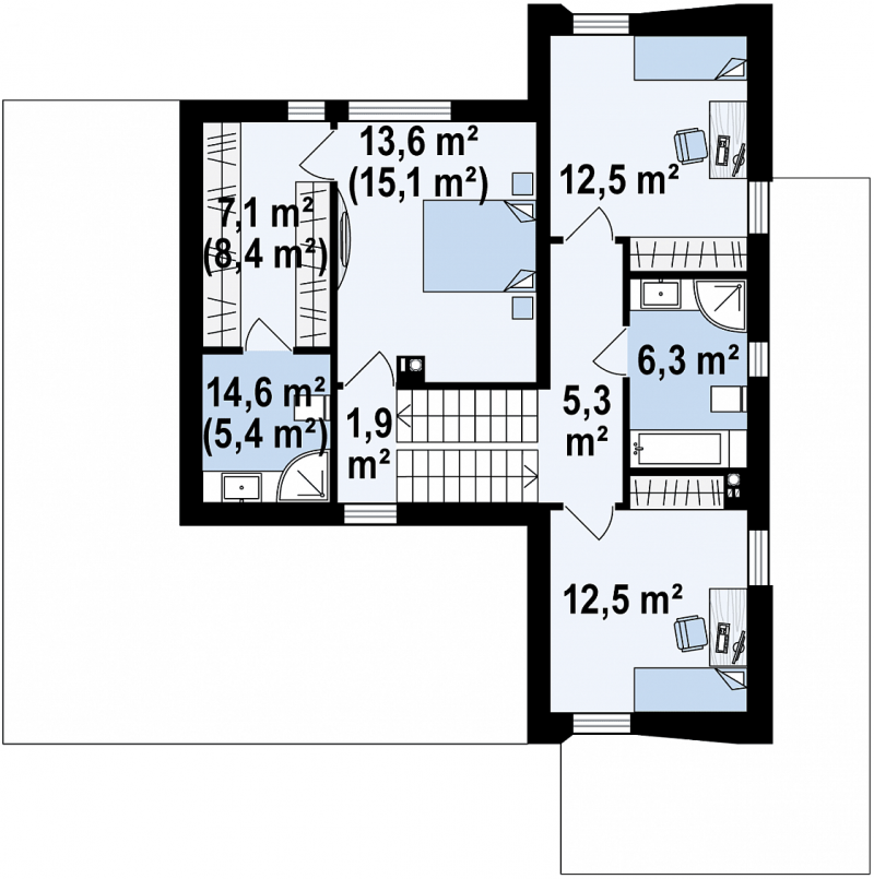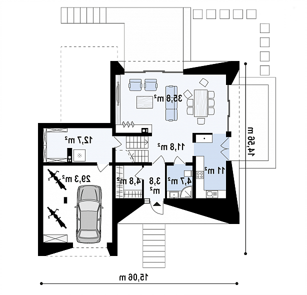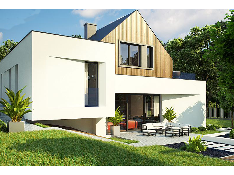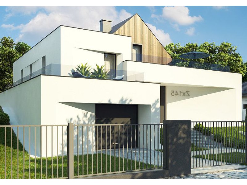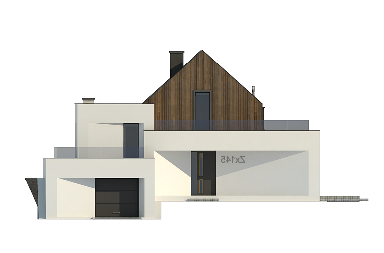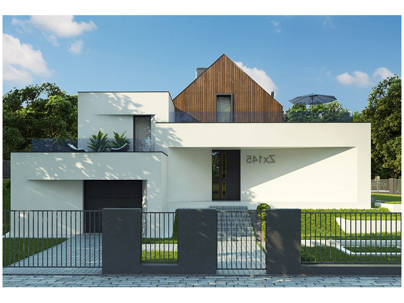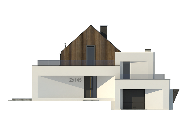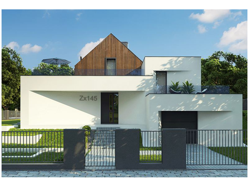 Zx145 jest propozycją domu , z półpiętrami i poddaszem użytkowym, tradycyjnym dachem dwuspadowym i garażem na półtora stanowiska. Powierzchnia użytkowa wynosi ok. 140 m2, a dodatkową zaletę stanowi fakt, iż może on zostać wybudowany na skarpie.