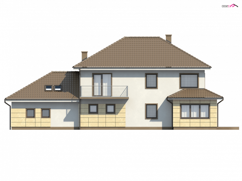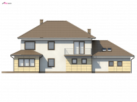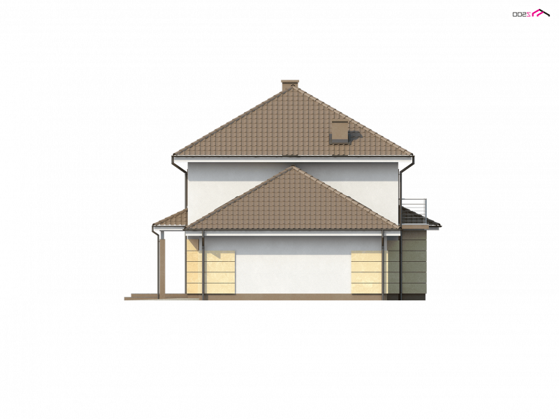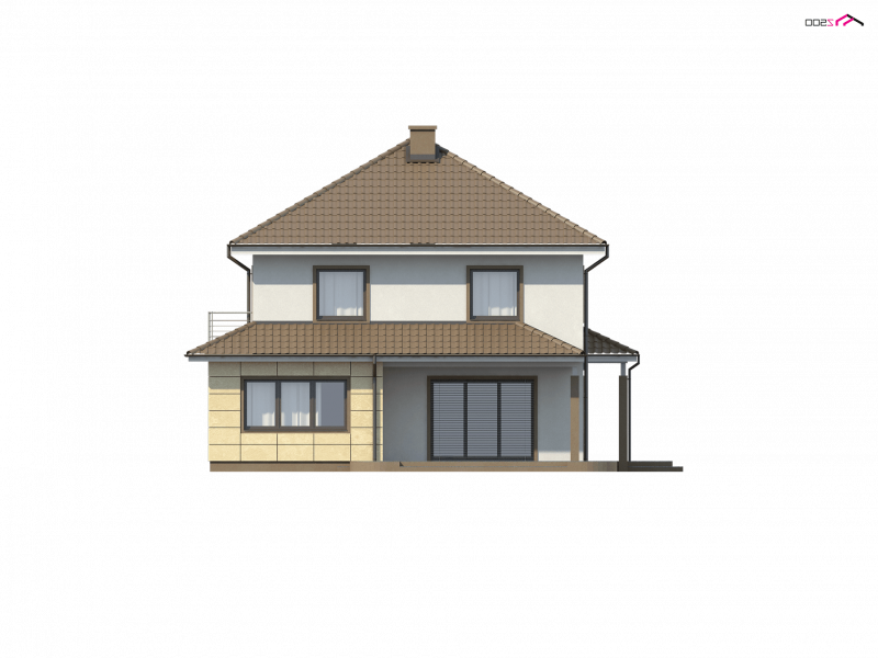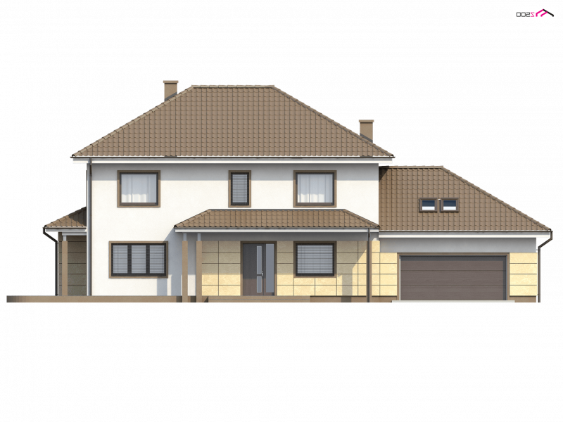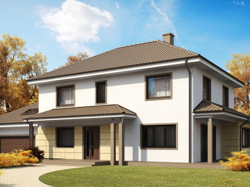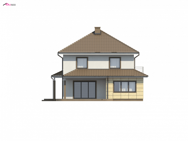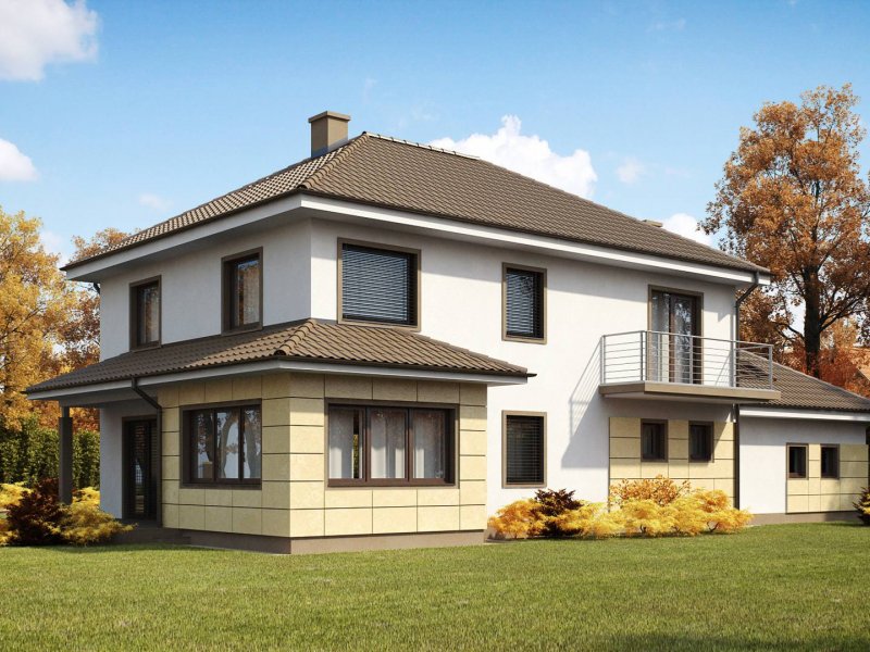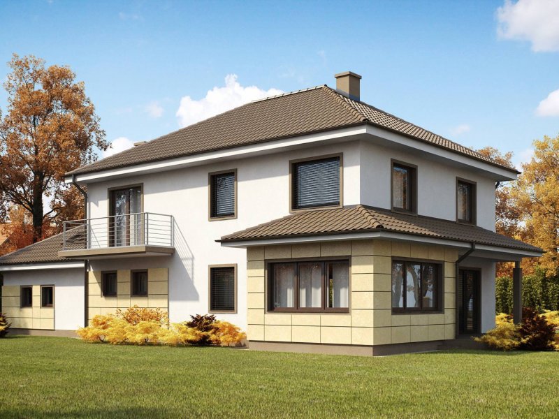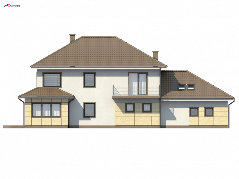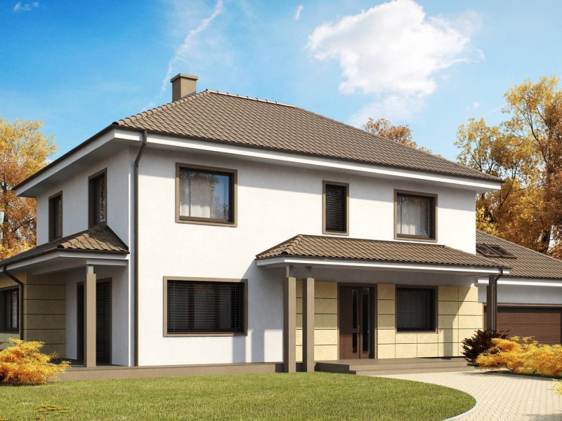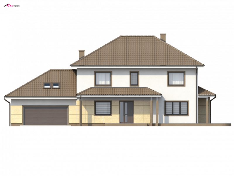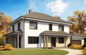 Zx16 to piętrowy dom z garażem dwustanowiskowym o rozłożystej formie. Projekt doskonale sprawdzi się na szerokiej działce. Stonowana kolorystyka elewacji i ciekawe daszki wzorowane na stylu włoskich willi nadają specyficznego, atrakcyjnego wyglądu.