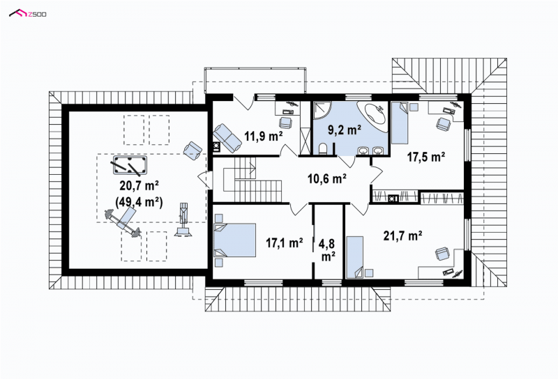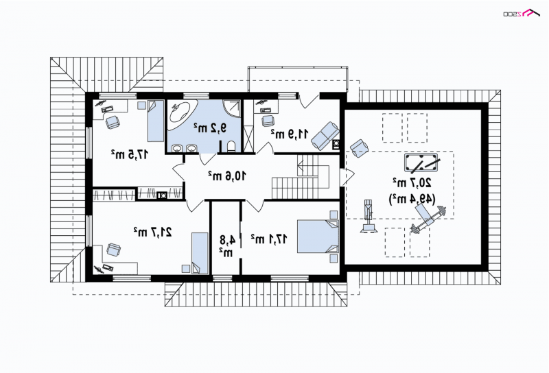 Poddasze mieści 4 sypialnie oraz wygodną łazienkę. Obszerne pomieszczenie nad garażem z wejściem ze spocznika przeznaczono na pokój rekreacyjny.W zależności od upodobań właścicieli może on spełniać rolę domowej sali kinowej, sali do ćwiczeń lub pokoju klubowego do spotkań ze znajomymi.
