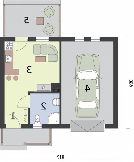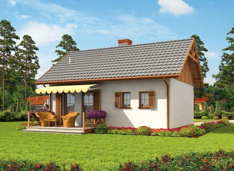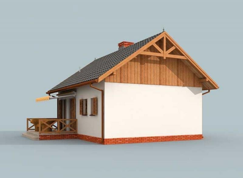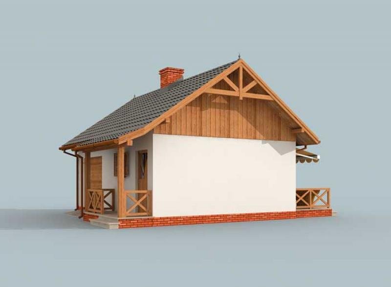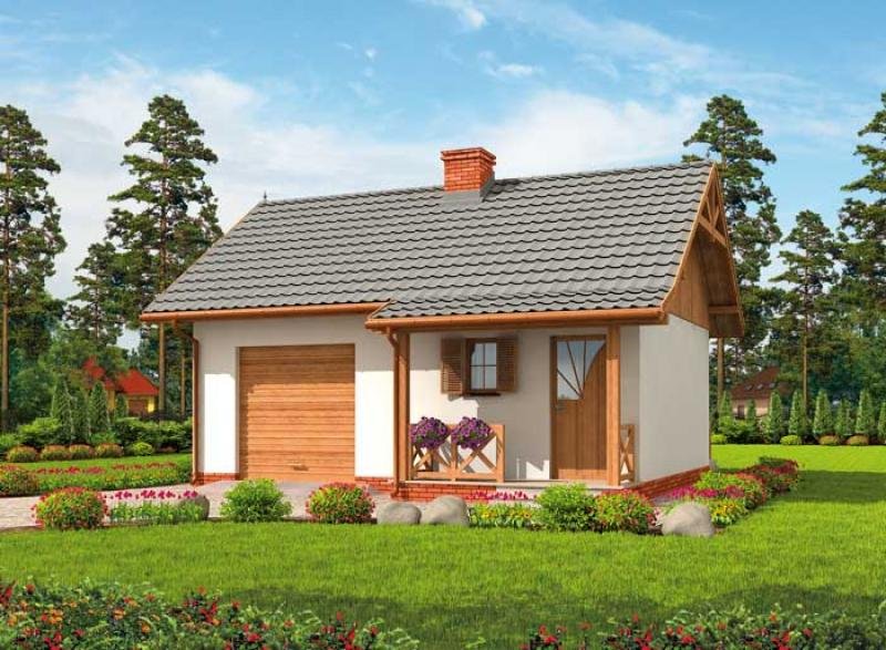 ARIZONA - dom letniskowy To wybór dla zmotoryzowanych letników. Domek, w którego bryle mieści się garaż to znakomite rozwiązanie dla chcących pełnej niezależności i bezpieczeństwa w trakcie wypoczynku, czy urlopu. Arizona imponuje zewnętrznym i wewnętrznym wyglądem. Widoczne na wizualizacji elementy pokrywające dwuspadowy dach dachówki, okalający dom cokolik, okiennice oraz odeskowanie przykuwają uwagę i mają znaczenie dla wielu Inwestorów. Dzięki nim wiemy, jak możemy upiększyć Arizonę. Weranda oraz wejście od południa sąsiaduje z drzwiami garażowymi, tworząc zrównoważoną kompozycję, o zbliżonej powierzchni. Część mieszkalna zajmuje niemal tyle samo przestrzeni co garaż. Można w nim zaparkować średni lub większy samochód. W wiatrołapie-komunikacji znajdziemy wnękę na szafę pod zabudowę. Po lewej stronie usytuowana jest łazienka. Na wprost znajdziemy wielofunkcyjny pokój z aneksem kuchennym, z którego można wyjść na przestronny taras. Miejsce, które przy odrobinie inwencji, dokupieniu ław, stolików i grilla stanie się obowiązkowym punktem każdego wyjazdu do "Arizony".