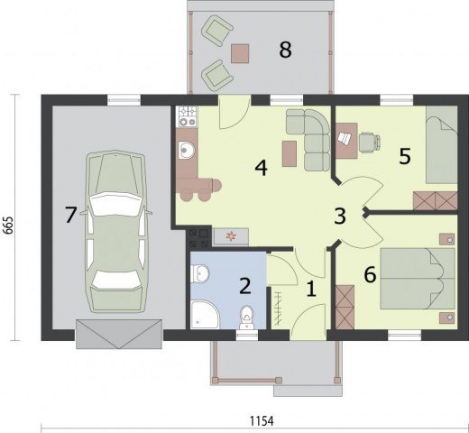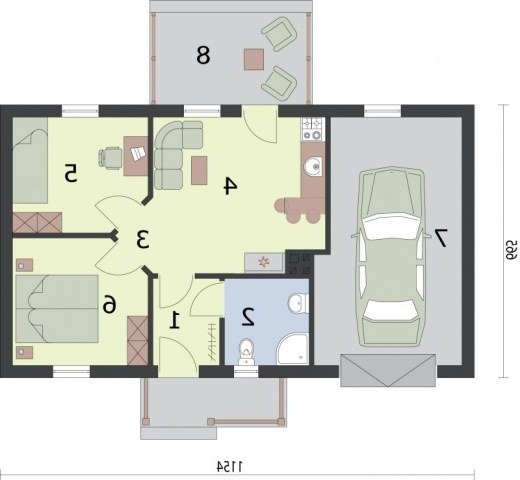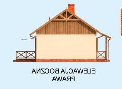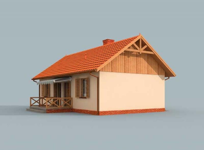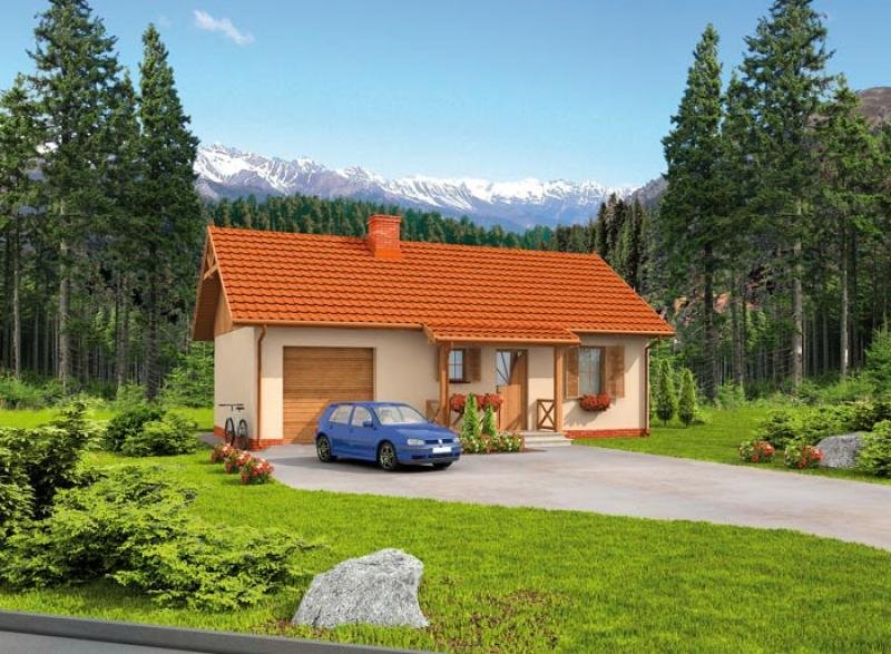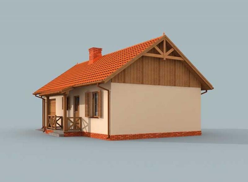 Averno będzie wyborem dla wszystkich żądających praktycznych rozwiązań w rozsądnej cenie. Domek świetnie nadaje się do wybudowania na łonie przyrody, z dala od zgiełku miasta. Od frontu budynku znajduje się garaż połączony dwuspadowym dachem z domem, po jego prawej stronie usytuowany jest zadaszony drewniany ganek, będący przedłużeniem dachu budynku. Przez ganek wchodzi się do domu. Na północnej ścianie Averny znajdziemy taras, świetnie sprawdzający się w czasie pięknej pogody jako miejsce odpoczynku w gronie bliskich. Bryła budynku urzeka prostotą, wyważeniem proporcji, objawiającym się m.in. w braku zbędnych elementów. Na załączonej wizualizacji świetnie widać, jak z gustem i harmonijnie dobrano kolor ścian, dachówki i cokoliku. Urokliwy i ciepły charakter elewacji jest tylko zapowiedzią przytulnych oraz komfortowych wnętrz. Weranda wiedzie do wiatrołapu, z którego przechodzi się do komunikacji. Po lewej stronie znajduje się łazienka, natomiast po prawej stronie komunikacji jest dość obszerna sypialnia. Za nią znajduje się jeszcze jeden pokój sypialny, np. dla dziecka, lub gości. Od komunikacji na wprost usytuowany jest pokój dzienny z aneksem kuchennym, w którym znajduje się kominek. Jest to miejsce, które z pewnością w zimowe wieczory będzie skupiać życie wypoczywających w domu ludzi.