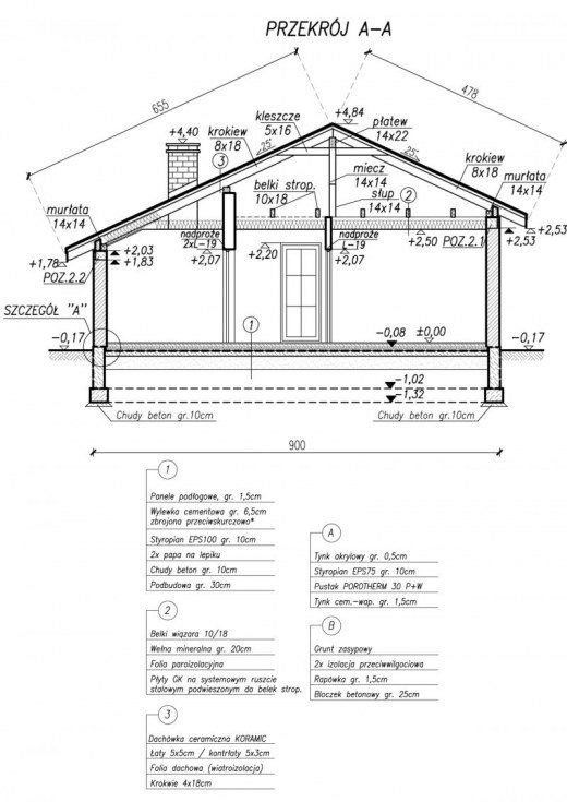 Technologia tradycyjna : - ściany zewnętrzne murowane gr. 30 cm - ściany wewnętrzne nośne gr. 25 cm - ściany wewnętrzne działowe gr. 12 cm - wszystkie ściany wykonane z pustaków ceramicznych "POROTHERM" - sufit podwieszany z płyt GK na ruszcie stalowym - konstrukcja więźby dachowej drewniana w układzie płatwiowo-kleszczowym - pokrycie dachówka ceramiczna - instalacja grzewcza : kominek - instalacja grzewcza w wersji całorocznej : kominek z płaszczem wodnym - istnieje możliwość adaptacji obiektu na budynek całoroczny - w przypadku wersji całorocznej docieplenie warstwą styropianu gr. 10 cm.