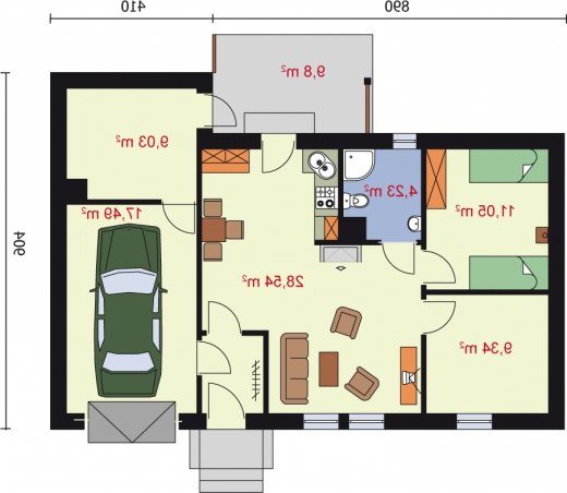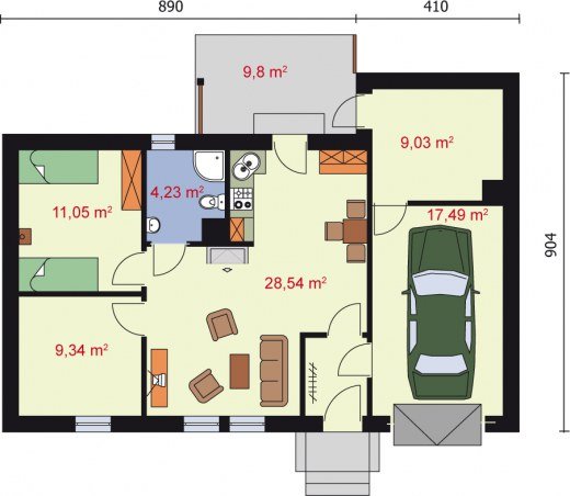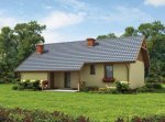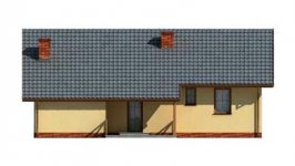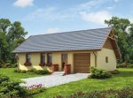 Ze względu na docieplenie budynku do każdego wymiaru widocznego na rzucie należy dodać 20cm. "Bergamo 2" To dosyć obszerny niepodpiwniczony dom letniskowy, dostępny także w wersji całorocznej. Projekt został tak pomyślany, by stanowił niezwykle funkcjonalną bazę wypoczynkową dla całej rodziny. Budynek jest prosty, pokryty dwuspadowym dachem, wykonanym tak, by tworzyć zadaszenie nad mieszczącym się z tyłu domu uroczym tarasem. By wejść do domu, trzeba pokonać kilka schodków, wzdłuż których, po prawej i lewej ich stronie, zostały poprowadzone niewielkie murki. Obok wejścia głównego, przewidziano wjazd do jednostanowiskowego garażu, zintegrowanego z resztą domu. Możliwość garażowania samochodu okaże się zapewne bardzo przydatnym rozwiązaniem, szczególnie, gdy zdecydujemy się na całoroczną wersję projektu i będziemy chcieli skorzystać z wypoczynku zimą. Wewnątrz domku, prosto z wiatrołapu możemy przejść na prawo – do garażu, gdzie znajduje się przejście do kotłowni. Na uwagę zasługuje fakt, iż kotłownia w tym projekcie posiada osobne wyjście na taras, co ułatwi gromadzenie w niej opału. Kierując się z wiatrołapu na wprost, wchodzimy do najobszerniejszego pomieszczenia w całym domu. Ta niezwykła przestrzeń została podzielona na trzy obszary – pokój wypoczynkowy, przylegający do południowej ściany domu, aneks kuchenny i jadalnię. W centralnym miejscu całego pomieszczenia, mamy kominek. Tuż obok aneksu kuchennego, znajduje się wyjście na zadaszony taras. Ponadto do ściany północnej domu przylega także łazienka zaopatrzona w kabinę prysznicową, a do ściany wschodniej dwa pokoje, które można zaadaptować w zależności od potrzeb na sypialnie, pokoje gościnne czy gabinet, dla osób lubiących pracować, gdy mogą obserwować za oknem górski czy morski krajobraz. Projekt Bergamo 2 został stworzony po to, by stać się wygodnym miejscem wypoczynku. Korzystającym z niego osobom da poczucie bezpieczeństwa i komfortu.