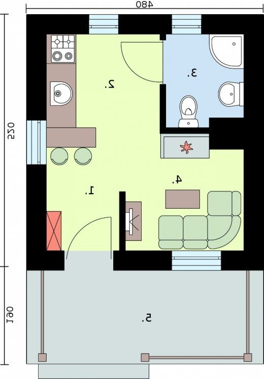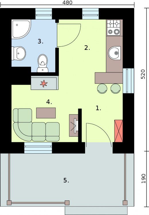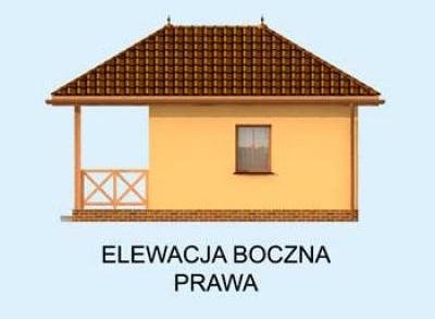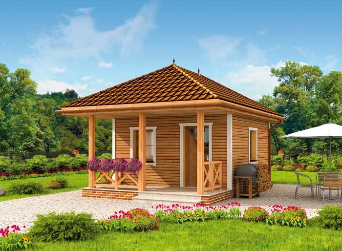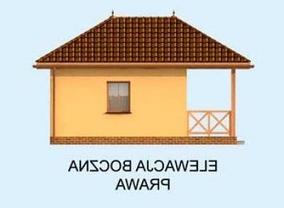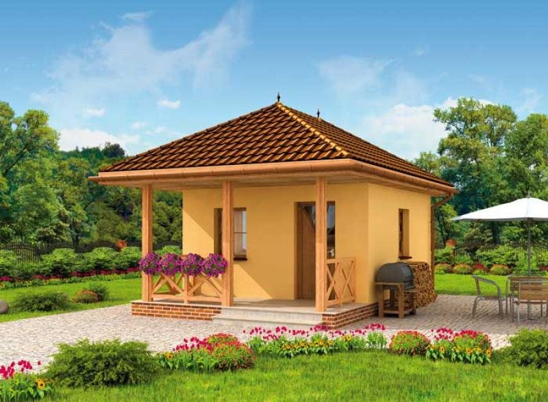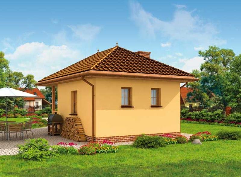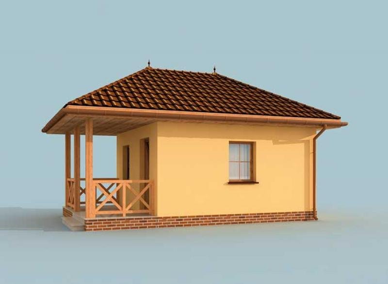 Zdecydują się na niego wszyscy, którzy niewielkim kosztem chcą postawić gustowny domek letniskowy. Dostępność projektu w wersji z obiciem drewnianym zwiększa jeszcze bardziej jego atrakcyjność. Drewniana weranda oraz ciepły kolor ścian świetnie komponują się z otaczającym dom klinkierowym cokolikiem i odpowiadającą im dachówką, pokrywającą kopertowy dach. Uwagę zwracają wieńczące go spiczaste wykończenia. Przyjaźnie i z rozwagą zaprojektowane wnętrze, na które składają się: wiatrołap, łączony z jadalnią, pokój dzienny wyposażony w miejsce na kominek. Dalej znajduje się półotwarta kuchnia i osobna łazienka, która dopełnia całości. Trudno uwierzyć, że tak wiele mieści się na jedynych 34 m2.