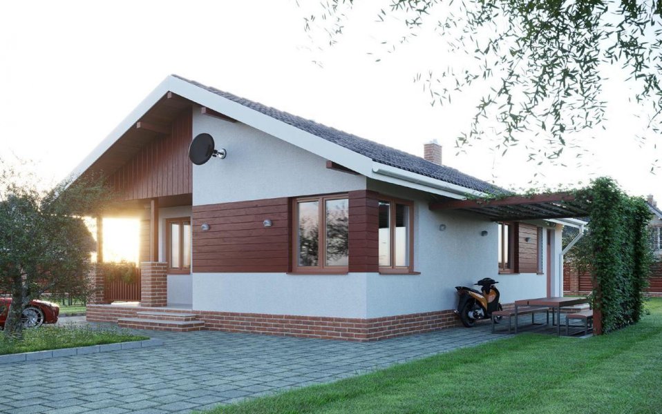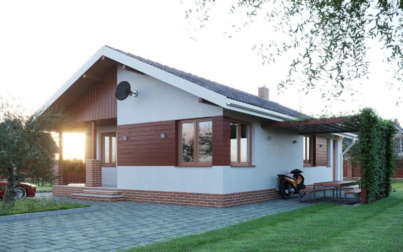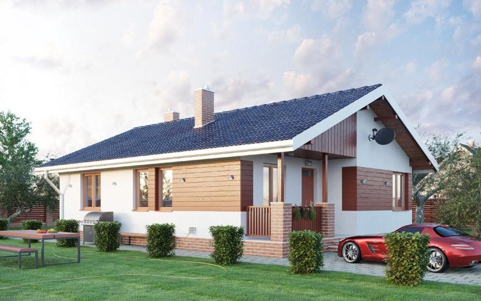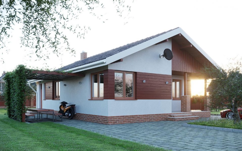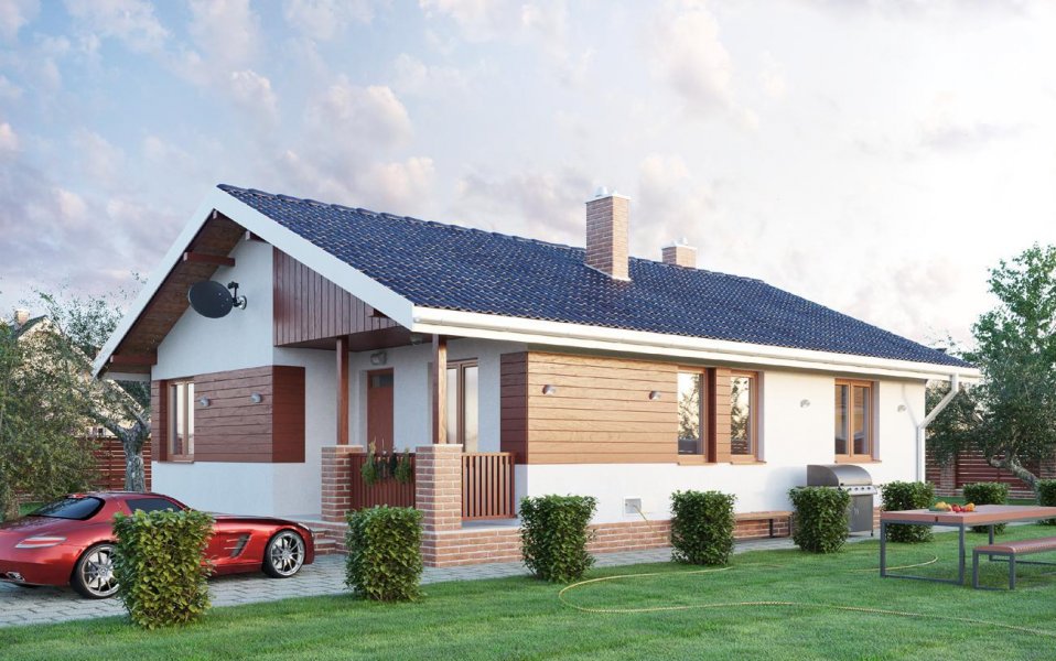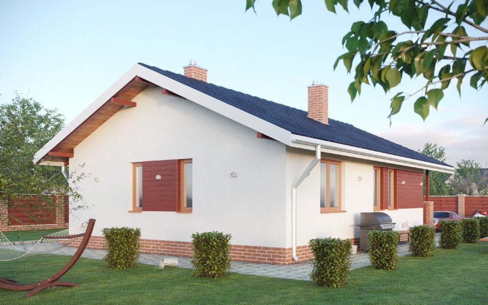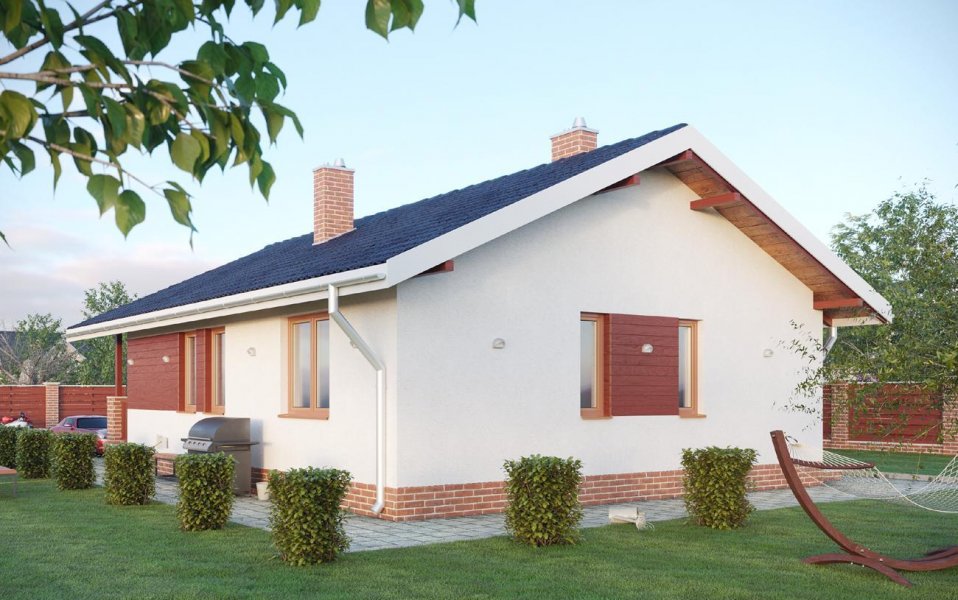 Mały dom dla 3 osobowej rodziny. Wejście z bocznego podcienia przez sień do holu, skąd można dostać się do kuchni i pokoju dziennego oraz do łazienki, dwóch pokoi sypialnych, kotłowni i spiżarni. Projekt domu Chatka Puchatka zainteresuje inwestorów, którzy poszukują malutkiego domu parterowego z dużym pomieszczeniem gospodarczym. Prostokątny, wydłużony plan przekryty jest dwuspadowym, niezbyt stromym dachem, a kalenica prostopadła do drogi dojazdowej dodatkowo ułatwia wpisanie budynku w wąską działkę. Układ pomieszczeń jest tradycyjny, z zamkniętym pokojem dziennym i oddzielną kuchnią. Duża kotłownia z osobnym wejściem zamyka długi przedpokój prowadzący do dwóch sypialni, łazienki i spiżarni. W przypadku zastosowania ogrzewania gazowego spiżarnia może przejąć funkcję kotłowni, co umożliwi, w ramach adaptacji projektu, pozyskanie trzeciej sypialni. Wejściowy podcień w formie werandy przed oknami kuchni jest jedynym elementem urozmaicającym oszczędną sylwetkę. Projekt domu Chatka Puchatka doskonale sprawdzi się jako dom rekreacyjny jak również całoroczny dom dla 3-4 osobowej rodziny.