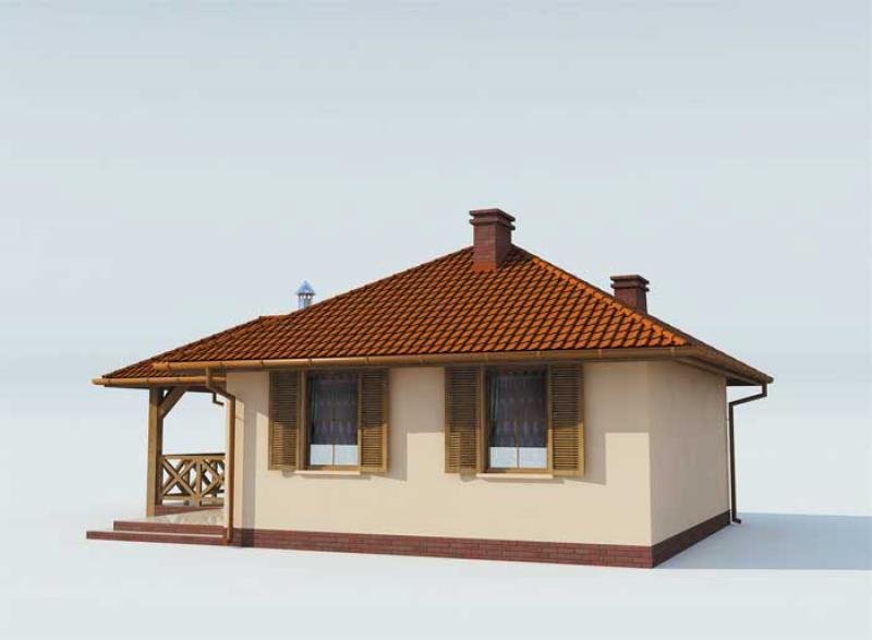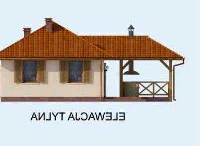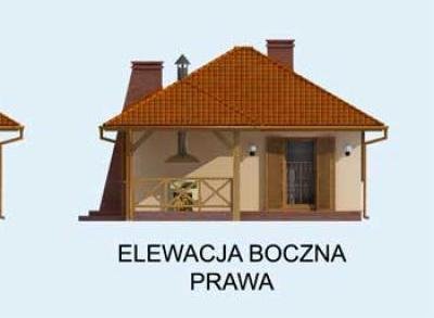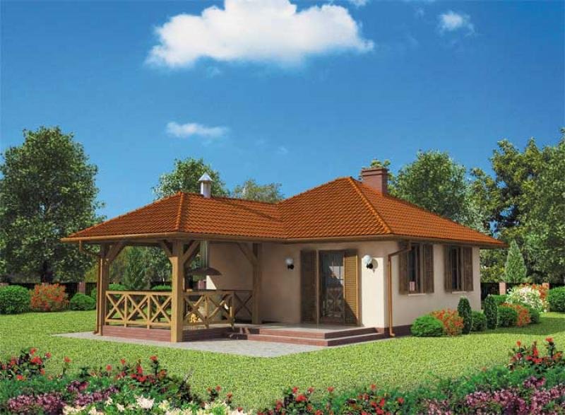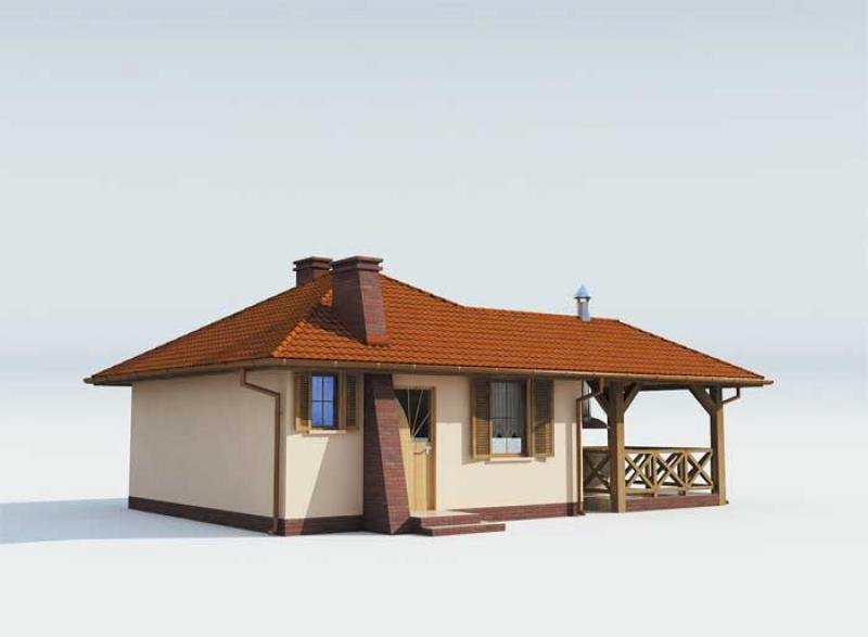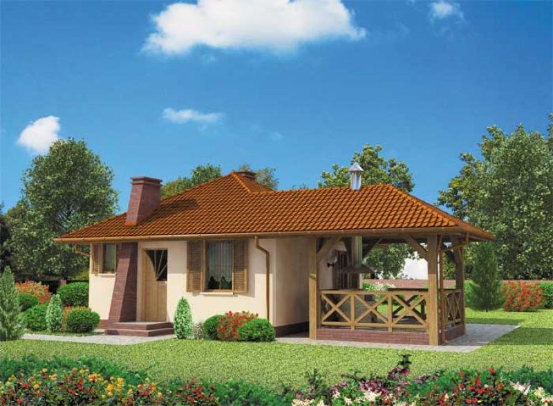 "Estella" To niezwykły domek letniskowy, przeznaczony w szczególności dla osób pragnących spędzać wiele czasu na wolnym powietrzu, ceniących sobie niezwykłą funkcjonalność rozwiązań oraz nietuzinkowe pomysły. Do domku wchodzimy przez wiatrołap i komunikację. Do ściany zachodniej domu przylega łazienka, która będzie doskonale służyć podczas wypoczynku. Za łazienką umieszczono dosyć obszerną sypialnię, stanowiącą odrębną część domu. Bezpośrednie sąsiedztwo obu tych pomieszczeń, daje duży jego mieszkańcom komfort, szczególnie wieczorem czy nocą. Ponadto znajduje się tu także obszerny pokój dzienny, gdzie można wydzielić przylegający do ściany południowej domu aneks kuchenny. Powierzchnia tego pomieszczenia pozwoli nam także wydzielić miejsce na jadalnię położoną bezpośrednio przy wyjściu na werandę. Projekt Estella proponuje bardzo ciekawe rozwiązanie, gdy chodzi o możliwość spędzana czasu na wolnym powietrzu, ponieważ z przylegającej do domu werandy, przechodzimy na specjalny, zadaszony taras. Tutaj mogą odbywać się niekończące się spotkania w dobrym towarzystwie i przy suto zastawionym stole, ponieważ ten zadaszony taras został tak pomyślany, by znalazło się tutaj miejsce także na murowany grill, z którego dym będzie odprowadzany przez zamontowany nad nim komin. Gdy ustawimy tutaj meble ogrodowe współgrające z resztą otoczenia, z pewnością nie będzie chciało się nam stąd wychodzić, szczególnie w letnie dni. Ten domek będzie strzałem w dziesiątkę nie tylko dla amatorów grillowania. Oferuje bowiem ciekawe i funkcjonalne wnętrze, które kryje w sobie wiele ciekawych rozwiązań. Estella, w zależności od komfortu, jakiego wymagają przebywające w nim osoby, będzie wygodnym rozwiązaniem dla dwojga lub też dla rodziny z kilkorgiem dzieci, jeżeli ktoś zdecyduje się na spanie w pokoju dziennym. W zależności od lokalizacji domku i wersji projektu, na który się zdecydujemy, możemy decydować kiedy i z kim spędzimy w nim czas wolny, przeznaczony na relaks.