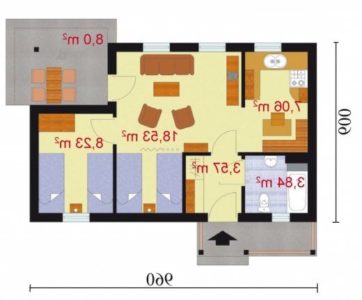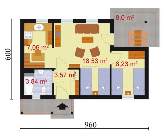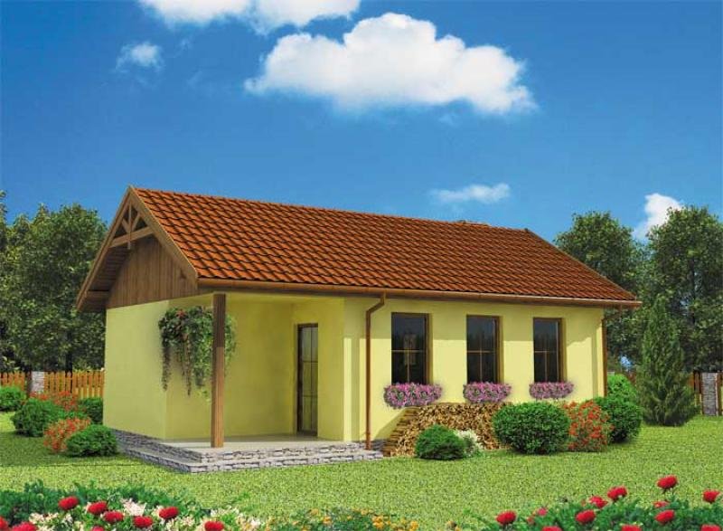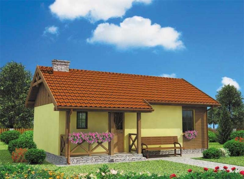"Florencja" Ten domek letniskowy, o prostej bryle, jest przeznaczony dla osób ceniących tradycyjne rozwiązania. Kąt nachylenia dachu pokrytego dachówką ceramiczną wynosi 30 stopni. Główne wejście do domku zostało umieszczone pod niewielkim zadaszeniem, które tworzy uroczy ganeczek. Florencja dzięki niemu zdaje się zapraszać nas do środka. Do pomieszczeń wewnątrz domu wchodzimy przez wiatrołap, łączący wszystkie pomieszczenia – w tym projekcie zrezygnowano bowiem z komunikacji, dzięki czemu zyskano więcej miejsca na pomieszczenia użytkowe. Do ścian południowej i zachodniej przylega obszerna łazienka z miejscem na wannę. Następnie mamy tutaj miejsce na urządzenie zamkniętej kuchni z bezpośrednim przejściem do pokoju dziennego, gdzie możemy spożywać przygotowane posiłki. Ponadto pokój dzienny został połączony z jedną sypialnią, druga sypialnia natomiast, została oddzielona od reszty domu i stanowi autonomiczny pokój. Na uwagę zasługuje fakt, iż z pokoju dziennego można wyjść na taras, który od wiosny do jesieni, może stać się także jadalnią. Jeżeli zdecydujemy się na całoroczną wersję projektu domku, posiłki będzie można spożywać także w pokoju dziennym, położonym w bezpośrednim sąsiedztwie kuchni. Sam taras natomiast możemy także wykorzystać jako miejsce zabaw dla dzieci lub też urządzić tutaj specjalne miejsce do grillowania, cieszącego się od pewnego czasu ogromną popularnością. Florencja posiada niewątpliwie jedną ogromną zaletę – dwie sypialnie, które nie stanowią standardowego rozwiązania, gdy chodzi o tego typu projekty. W takim domku wygodnie mogą wypoczywać nawet cztery osoby. Okazuje się, że prosta bryła budynku, pozwala na rozmieszczenie pomieszczeń w taki sposób, by zyskać jak najwięcej miejsca. Jeżeli szukasz ekonomicznego, funkcjonalnego, prostego domku letniskowego, to zapewne warto rozważyć właśnie tę propozycję.